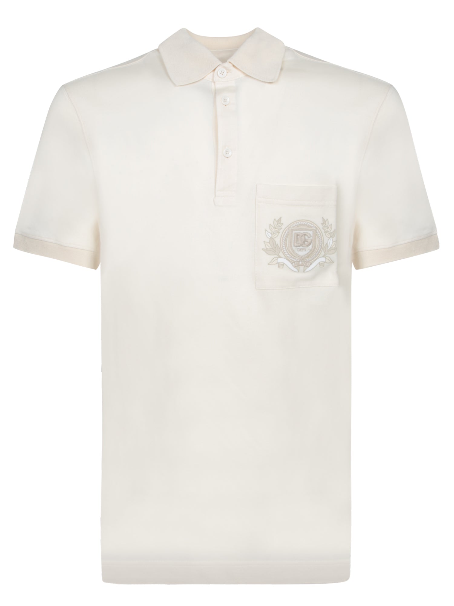 Refined beige Dolce & Gabbana polo made from high-quality piquet with tailored details. The distinctive feature is the chest pocket with the D&G logo encircled by a garland, adding a touch of understated elegance.