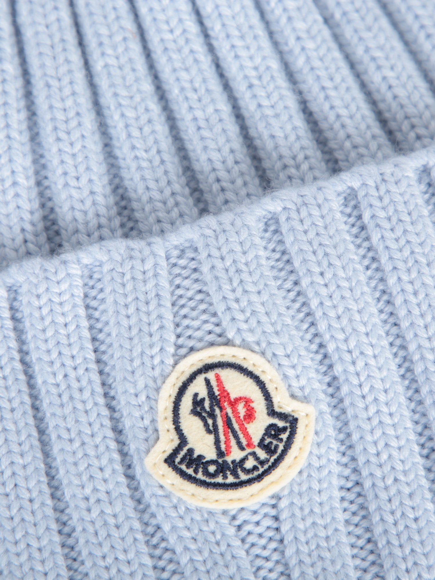 Rib-knit beanie. Fur pom pom. Embroidered Moncler logo on the cuff.