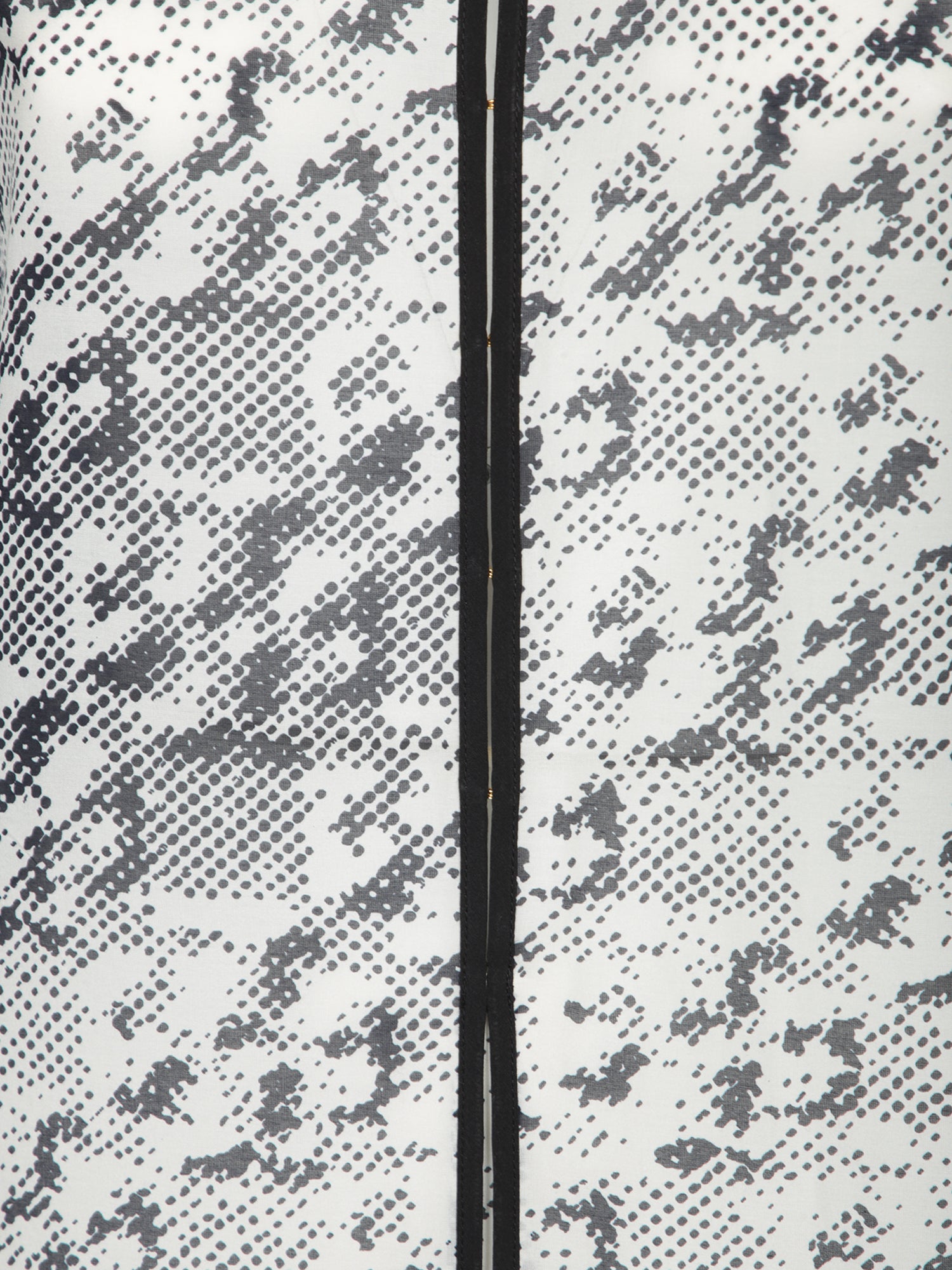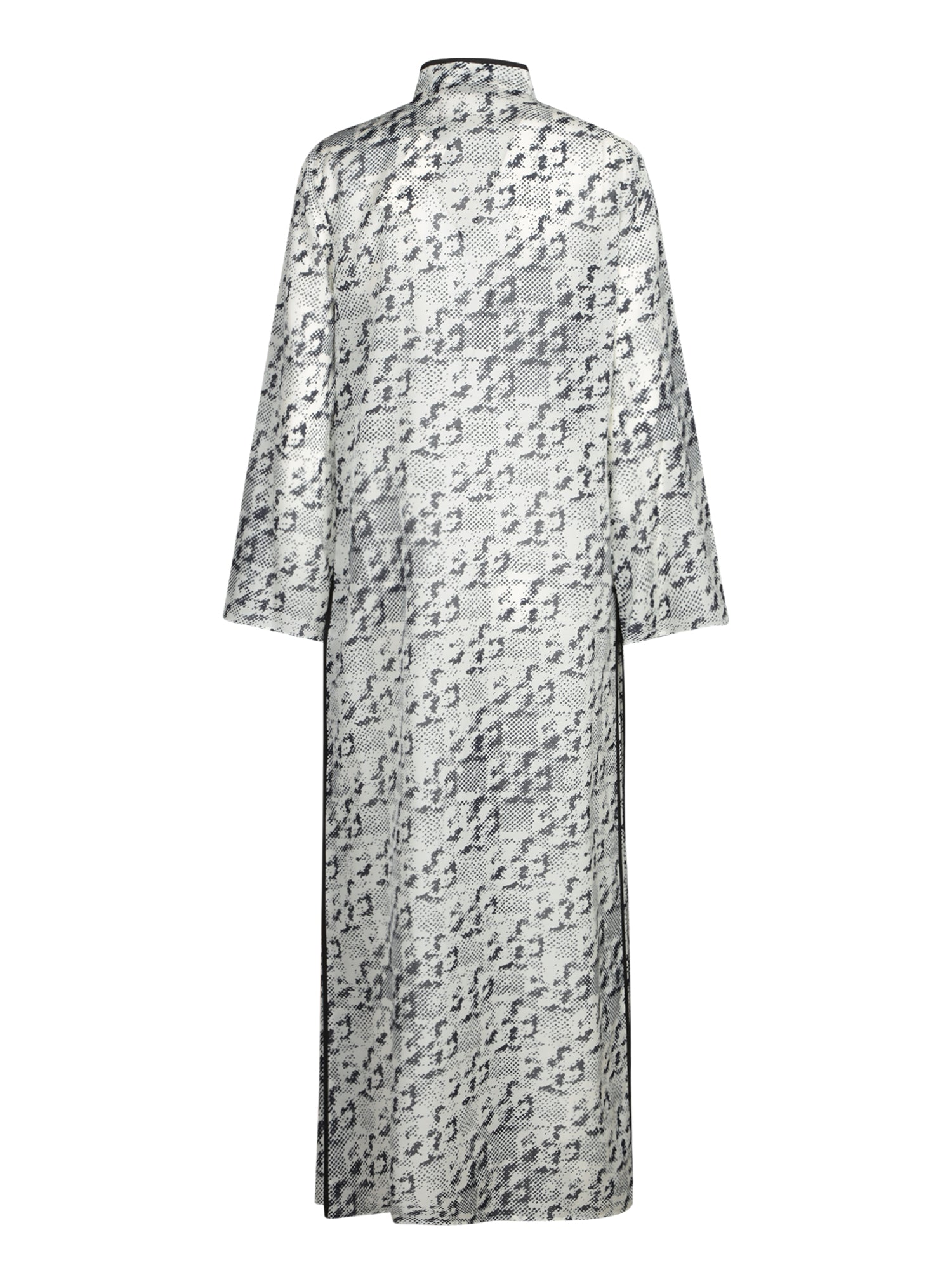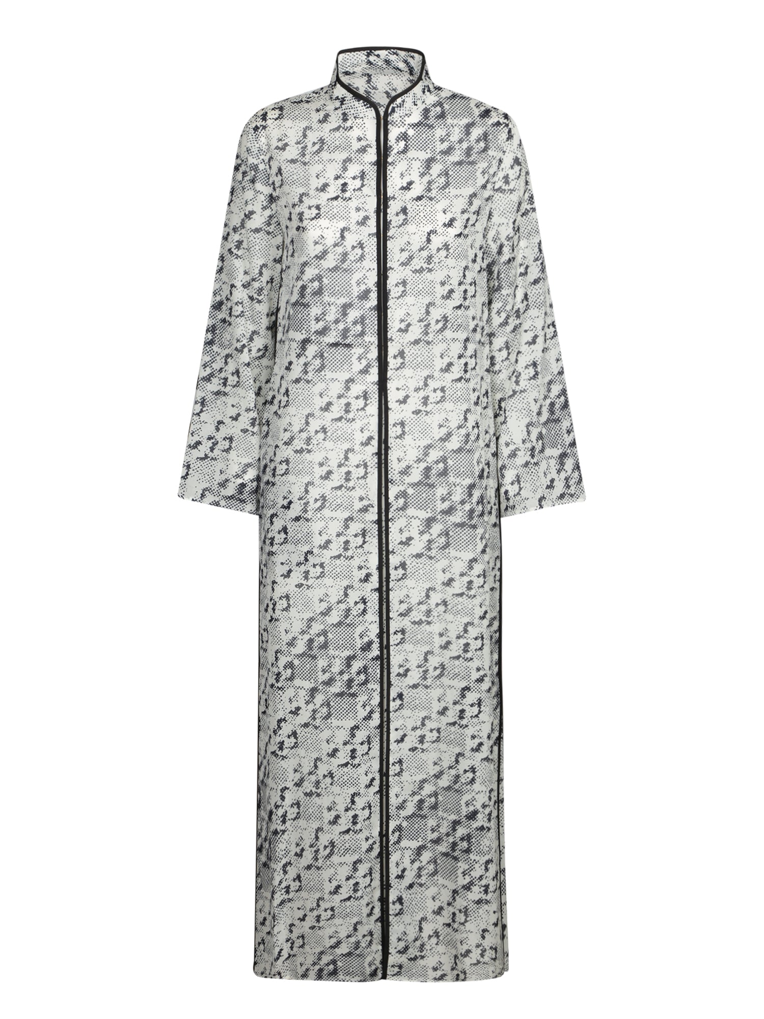 Caftan design, front zip closure, three-quarter sleeves, snake pattern.