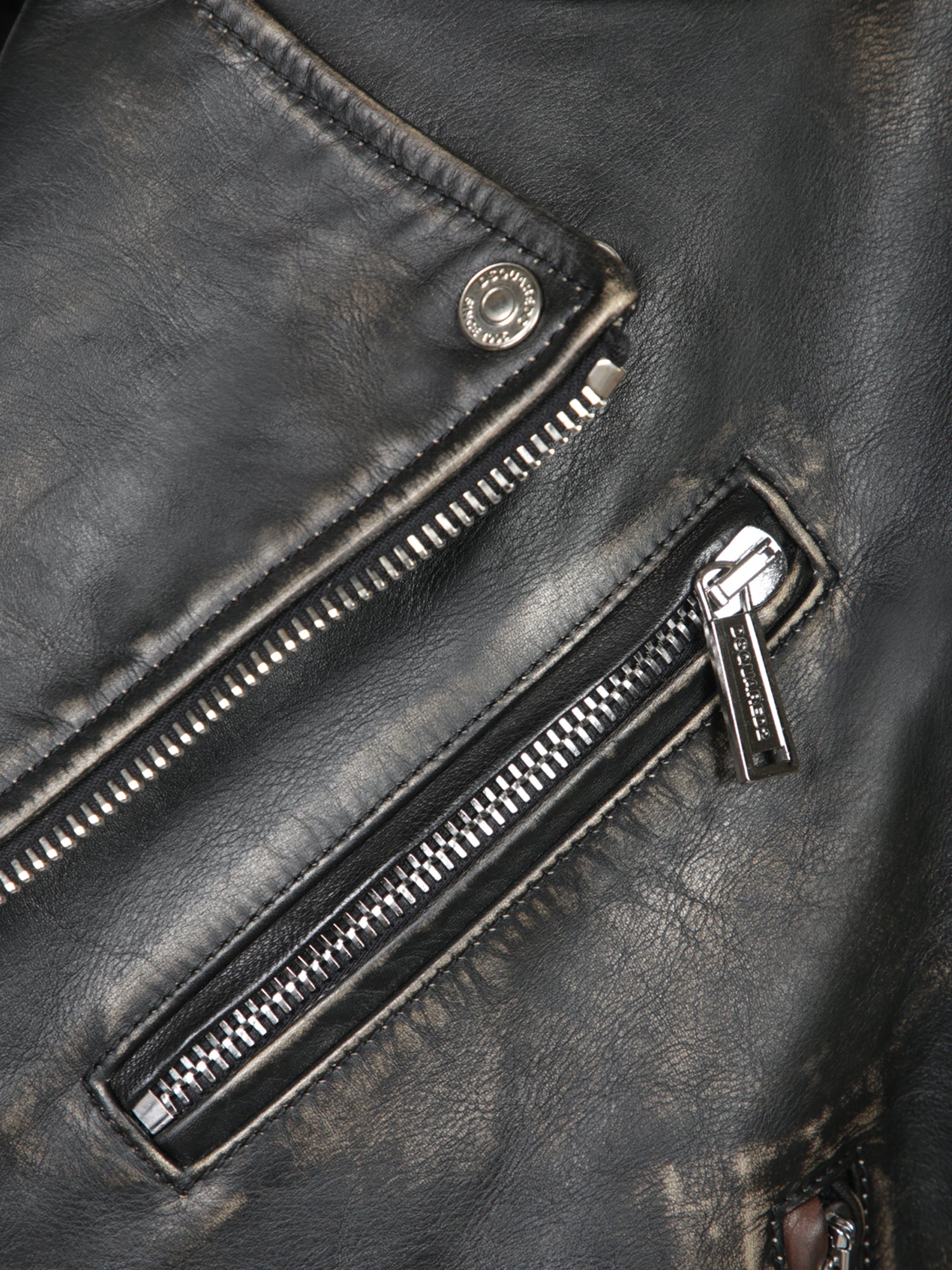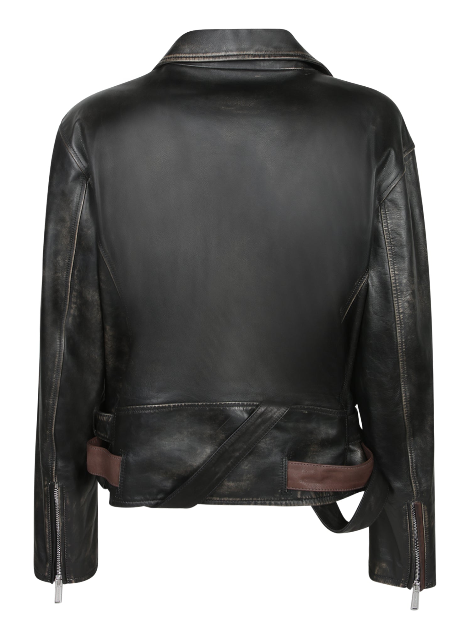 Black leather jacket with multiple pockets and zippers. Adjustable belt and snap button collar.