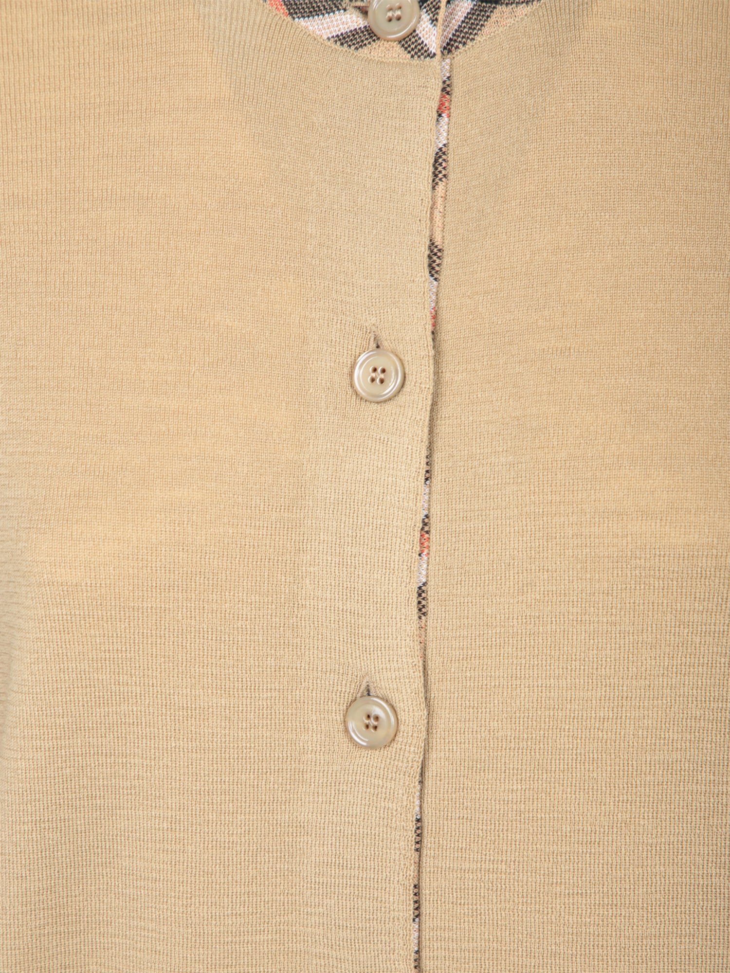 V-neck with check interior detail. Front button closure. Ribbed trims.