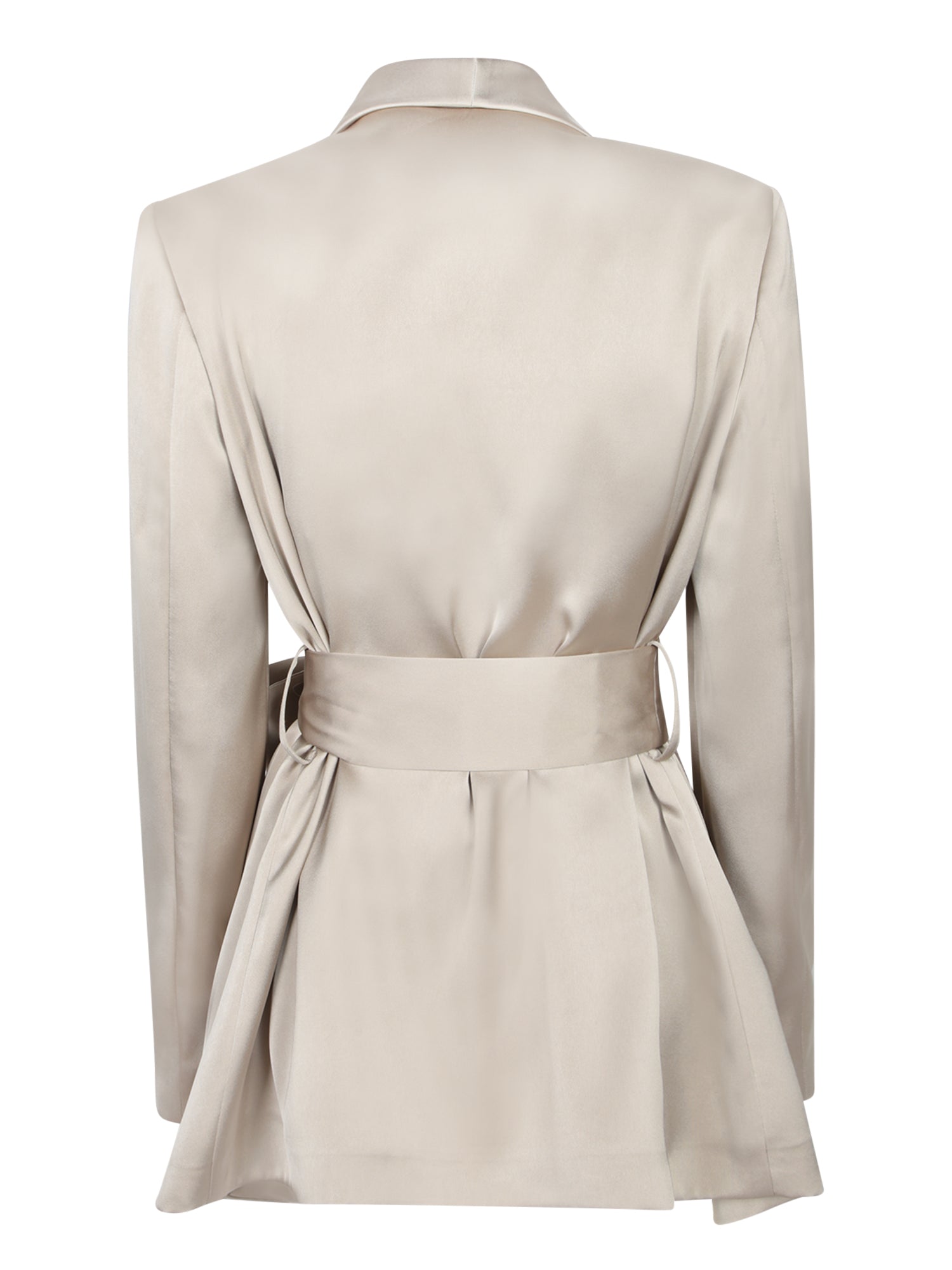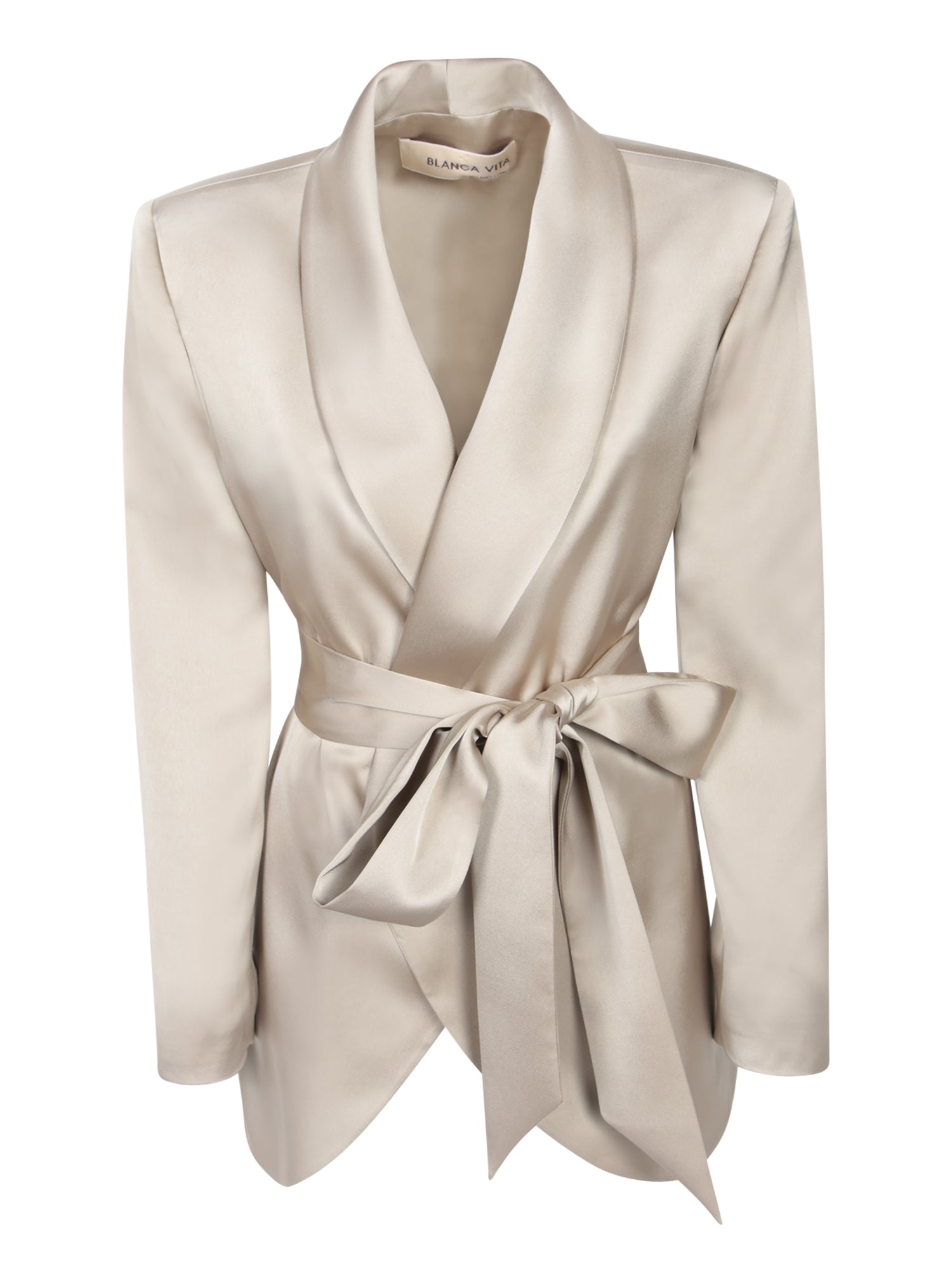 This elegant mastice satin jacket from BLANCA VITA features a refined design with a belted closure that accentuates the silhouette. Perfect for an upscale evening or a formal event.
