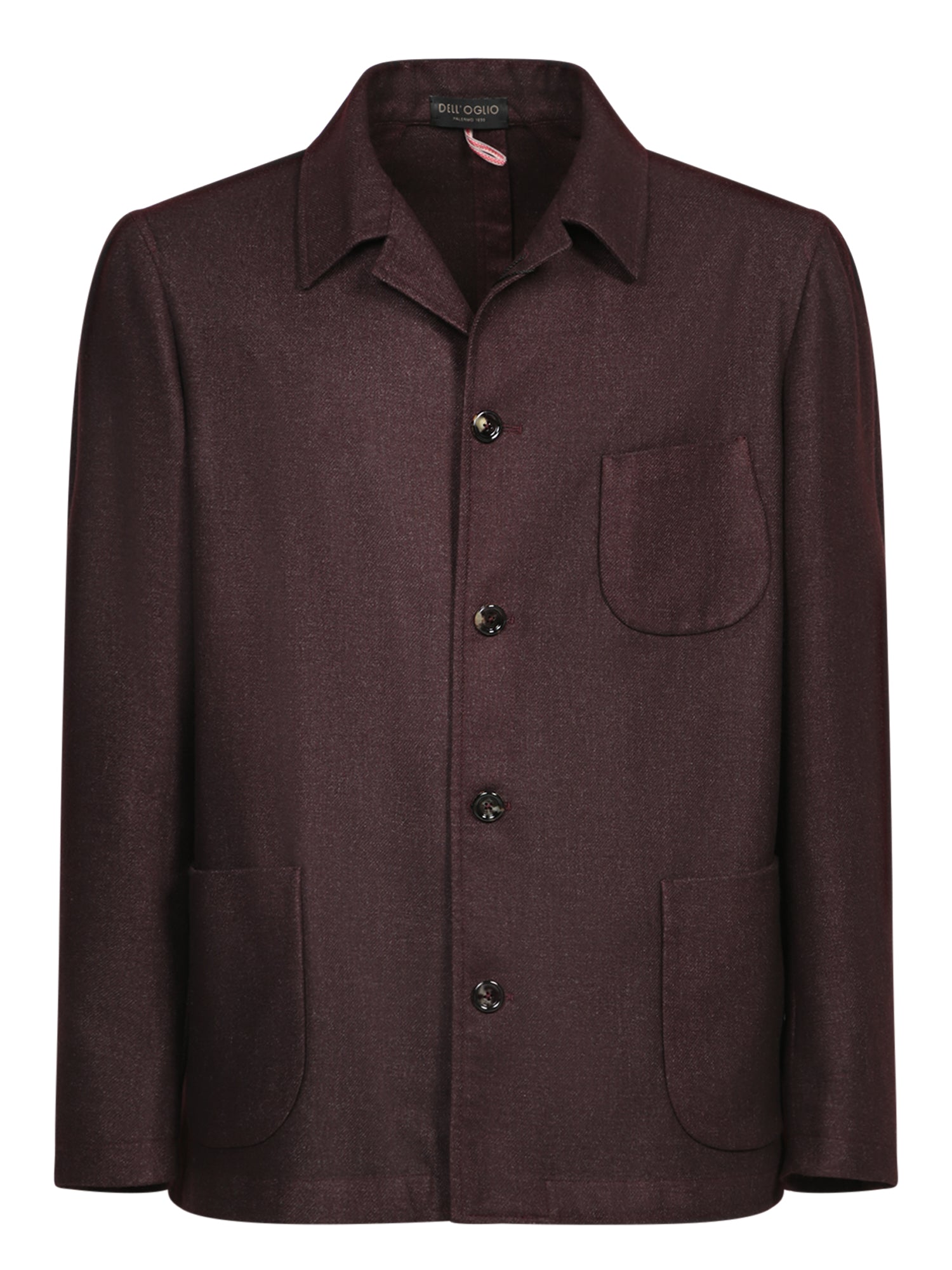 Bordeaux wool flannel overshirt. Features a classic collar, front button closure, and a chest patch pocket.