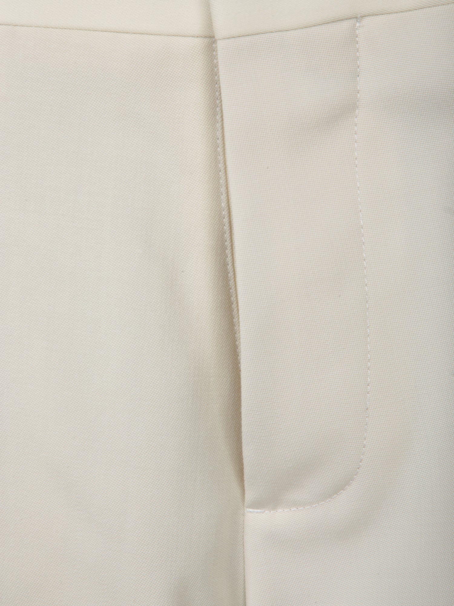 Wide-leg trousers with a crease. Side and back pockets. Front zip and button closure.