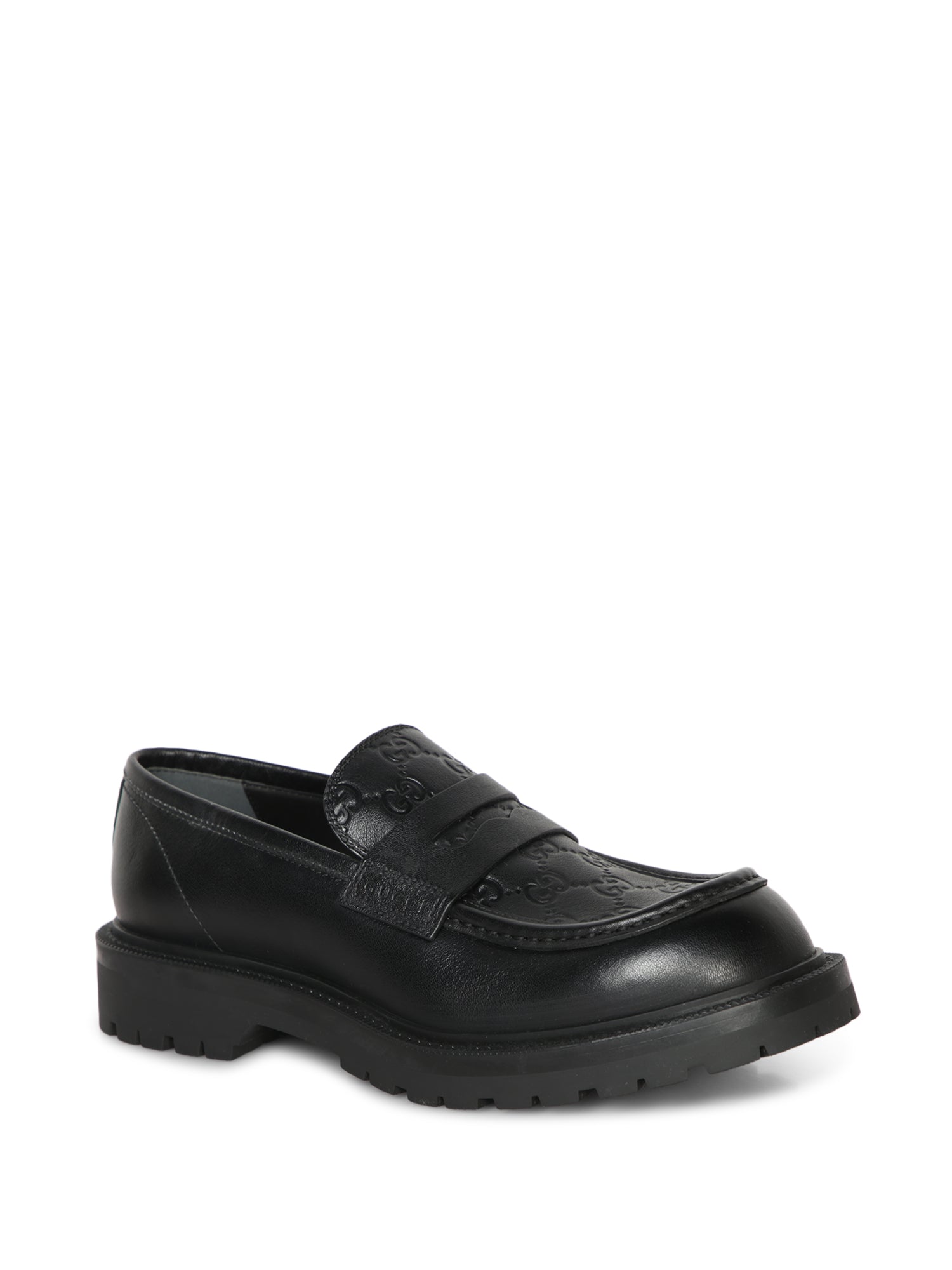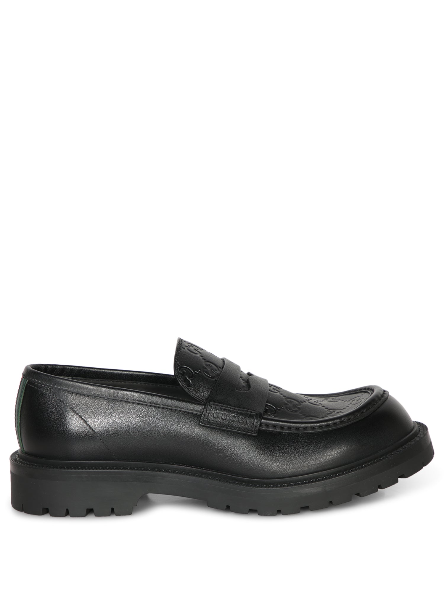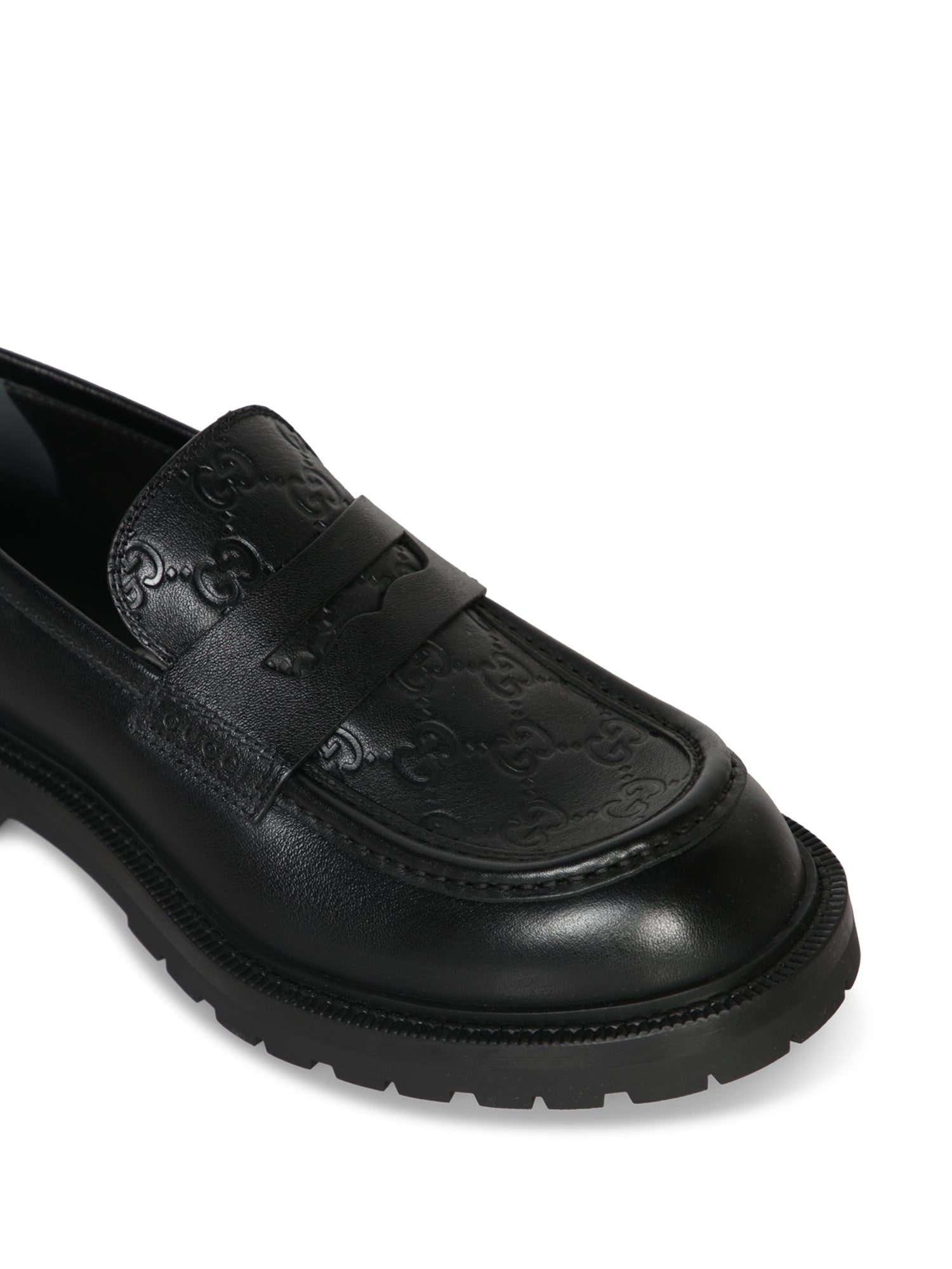 Black leather loafers featuring embossed GG details. Rubber sole, fabric logo band insert.
