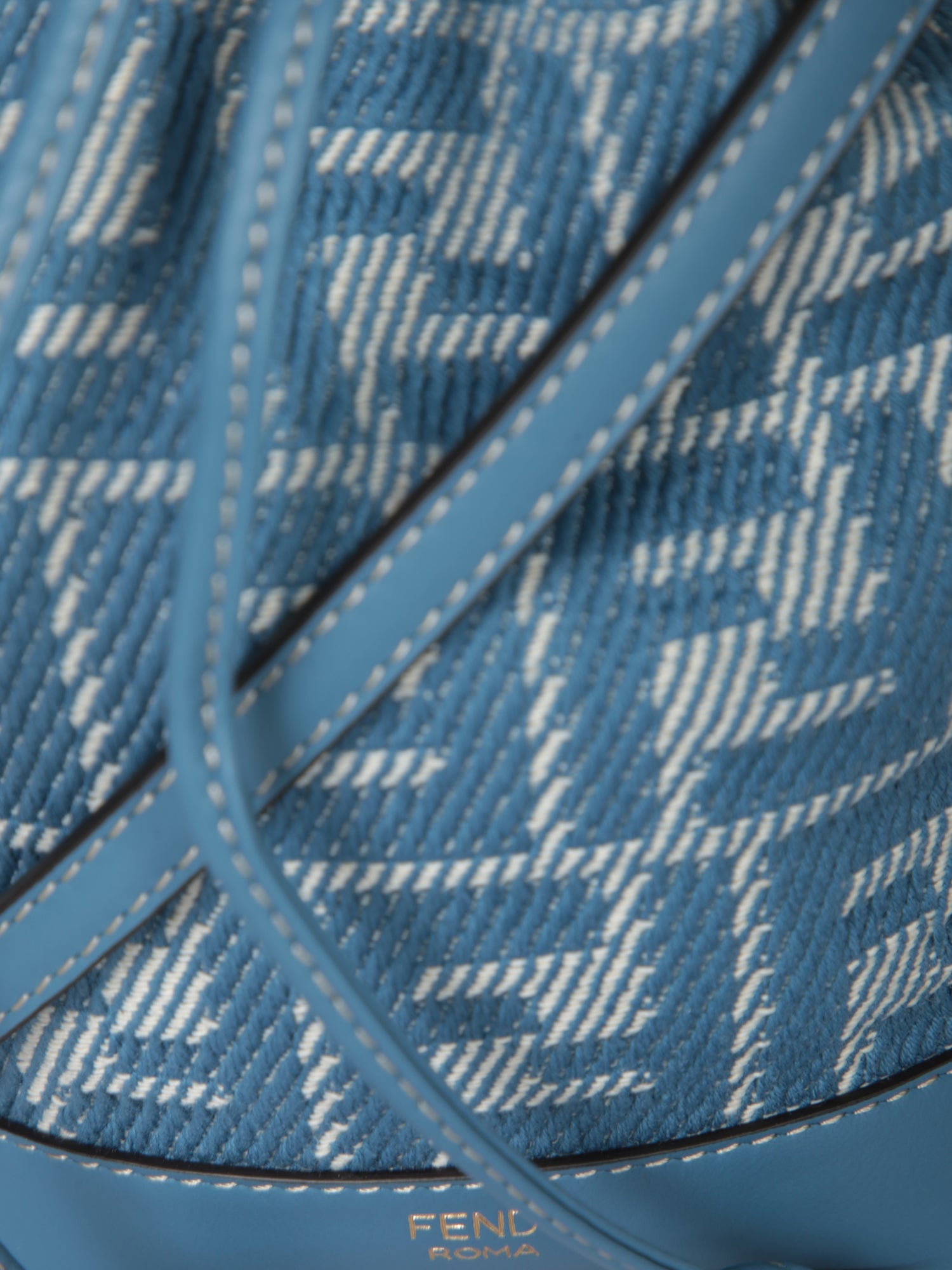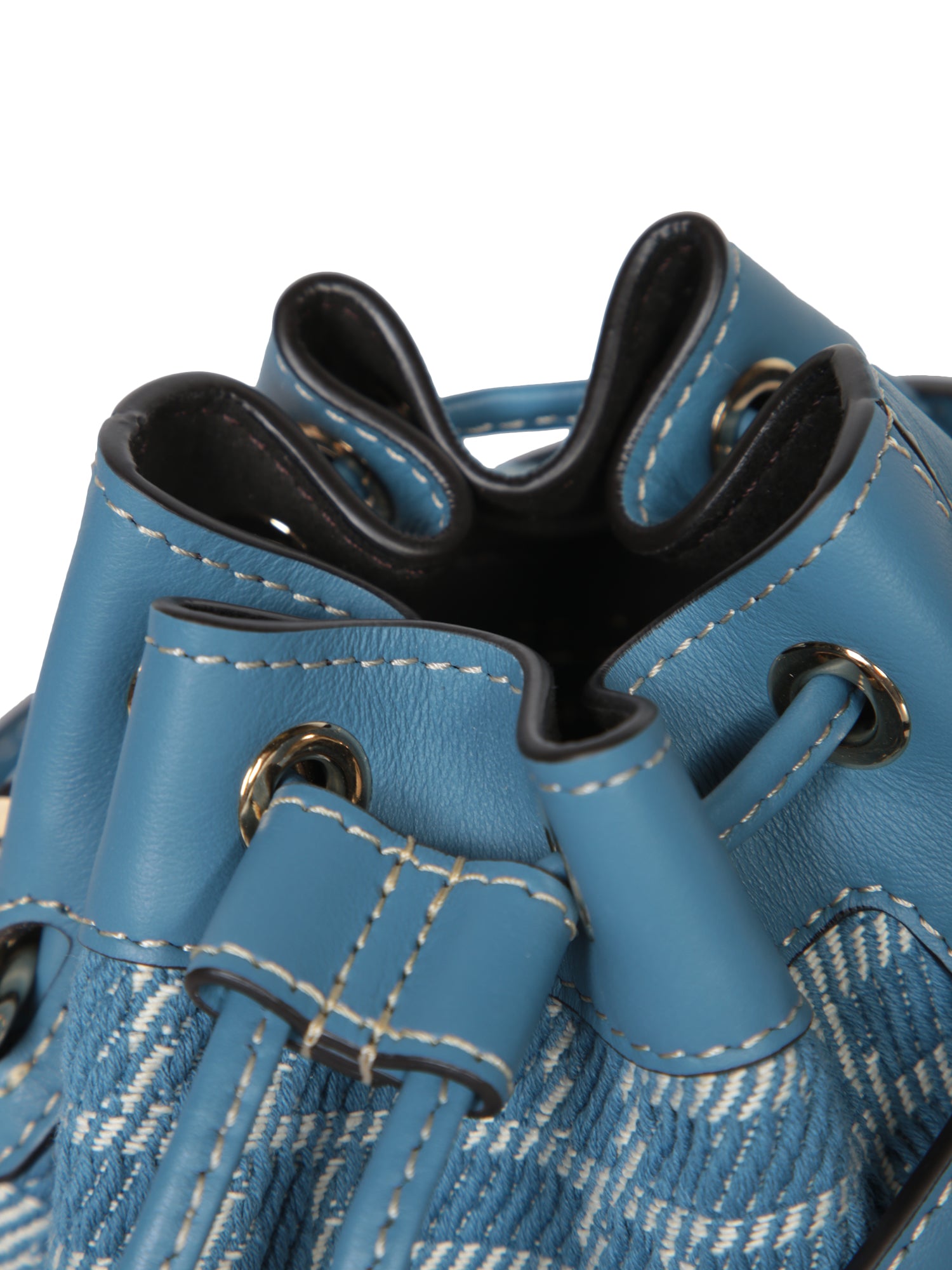 Denim bucket bag with leather details. Drawstring closure. Adjustable and removable shoulder strap.