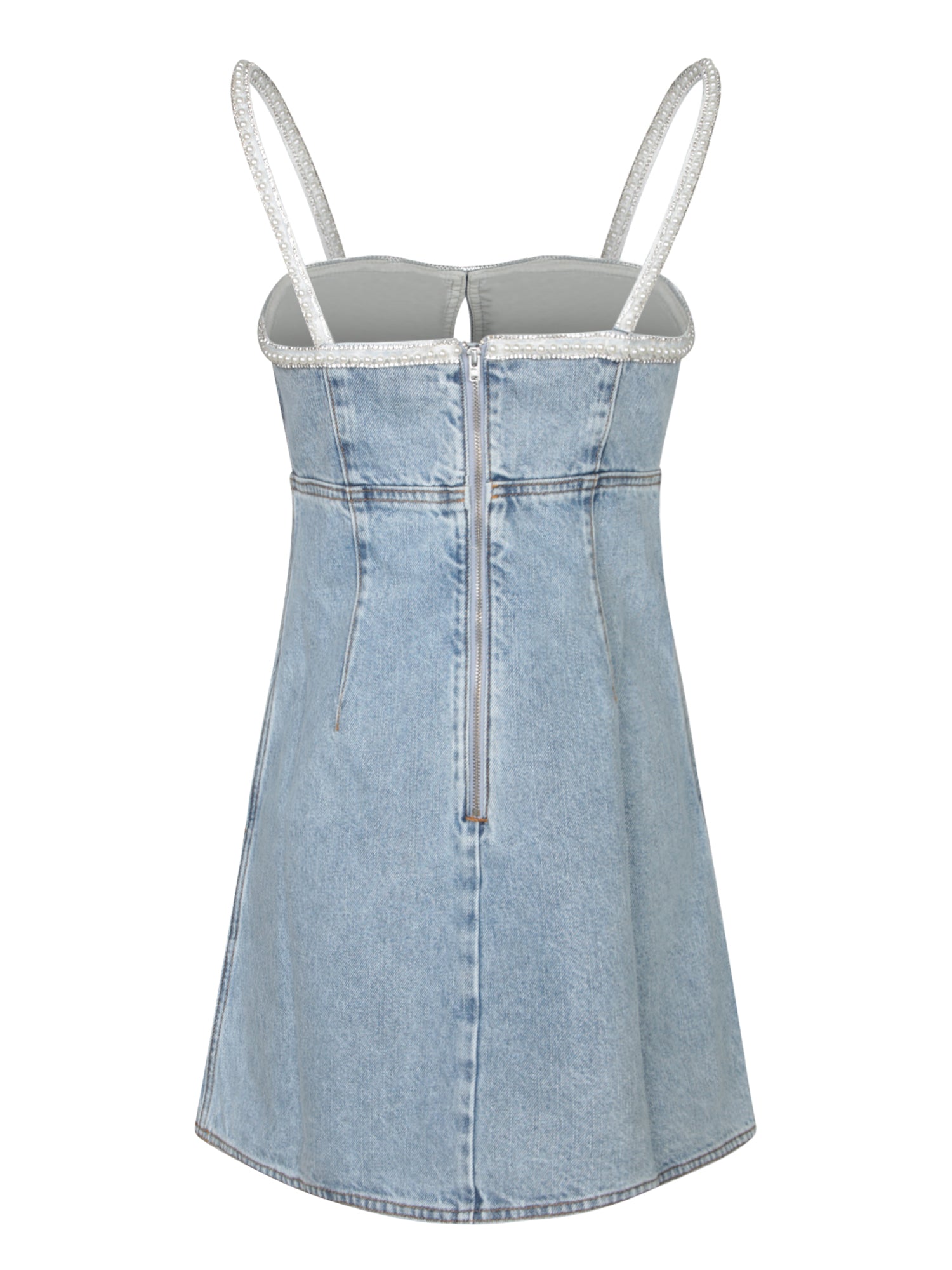 Mini dress in denim. Adjustable jewel-embellished straps. Bustier cut with visible insets.