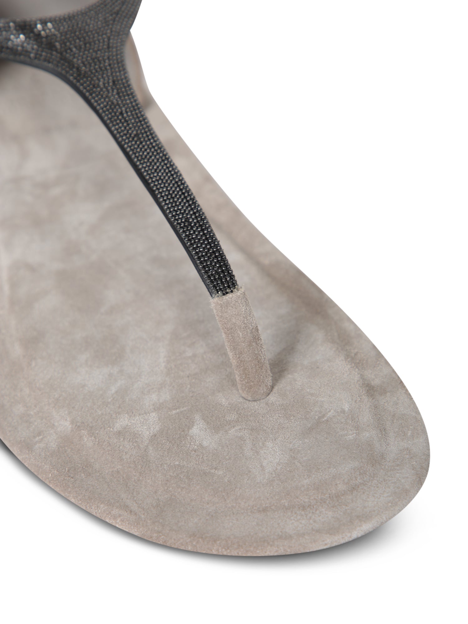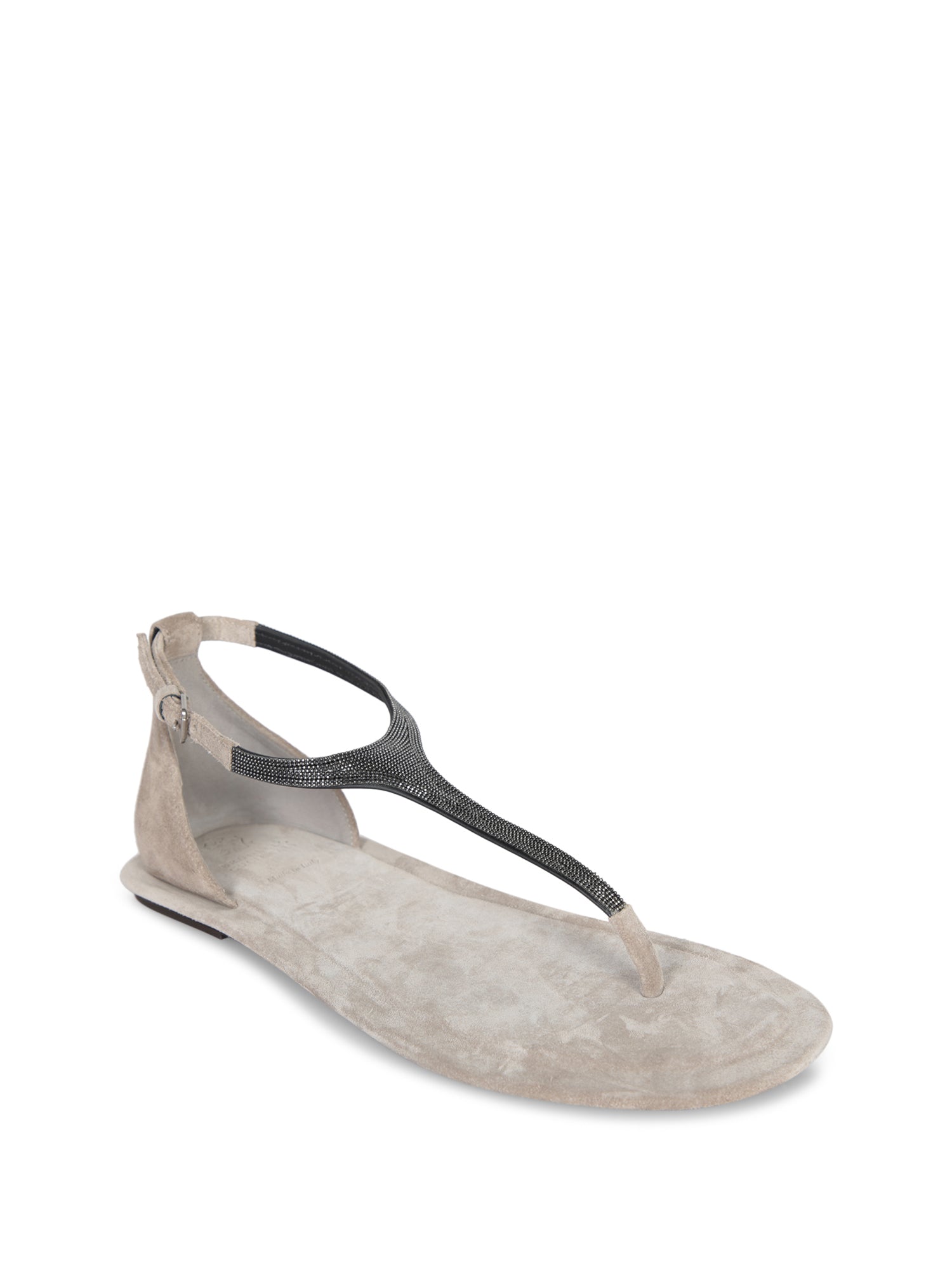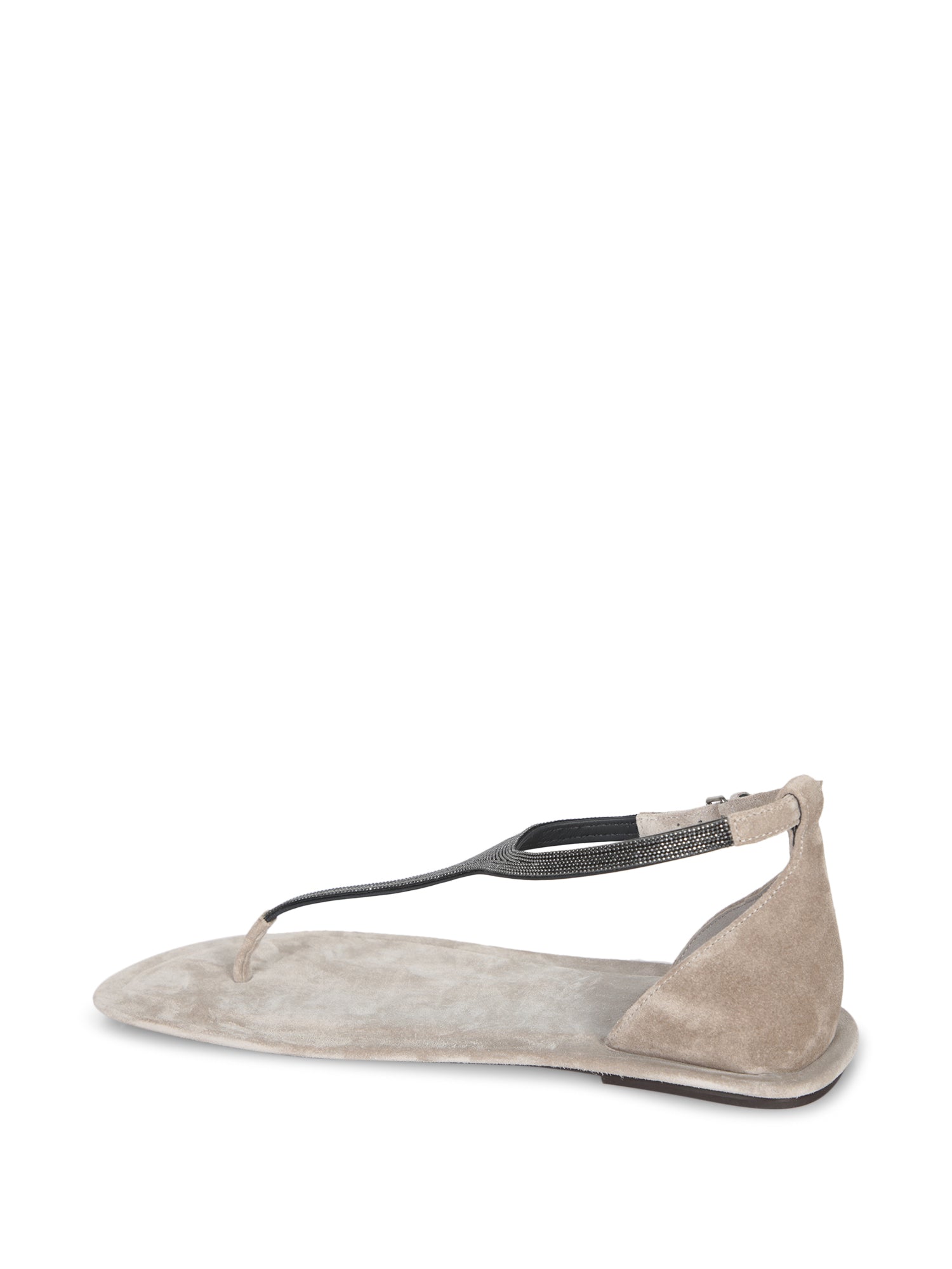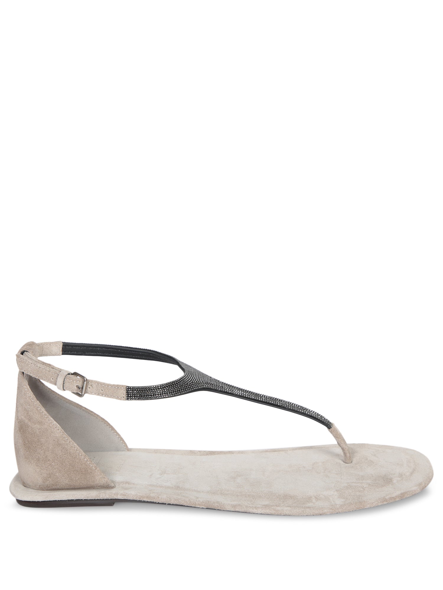 Elegance and comfort combine in this Brunello Cucinelli sandal, perfect for casual-chic occasions. The beige suede finish pairs beautifully with the bright monile accent, adding a touch of understated luxury.