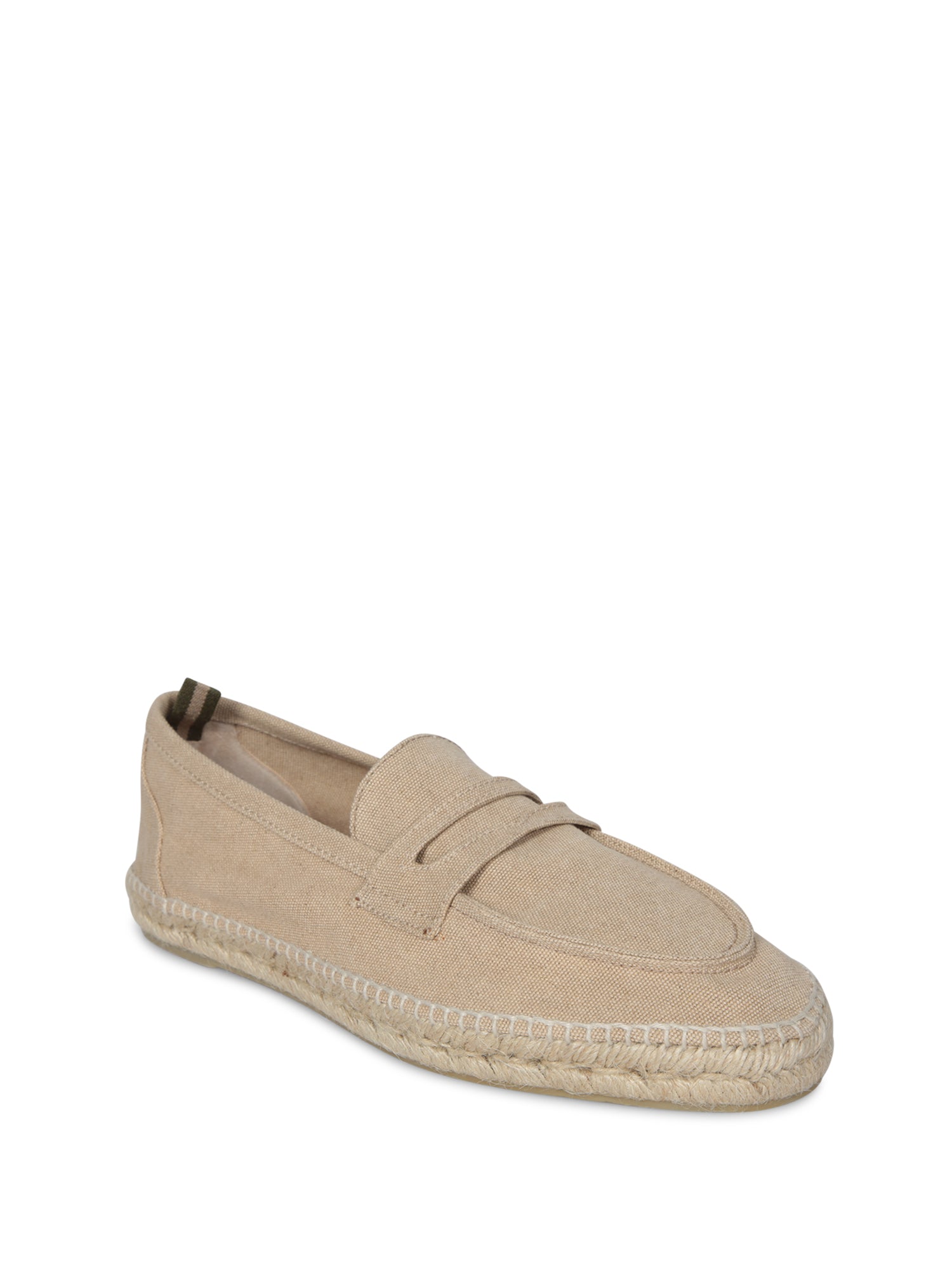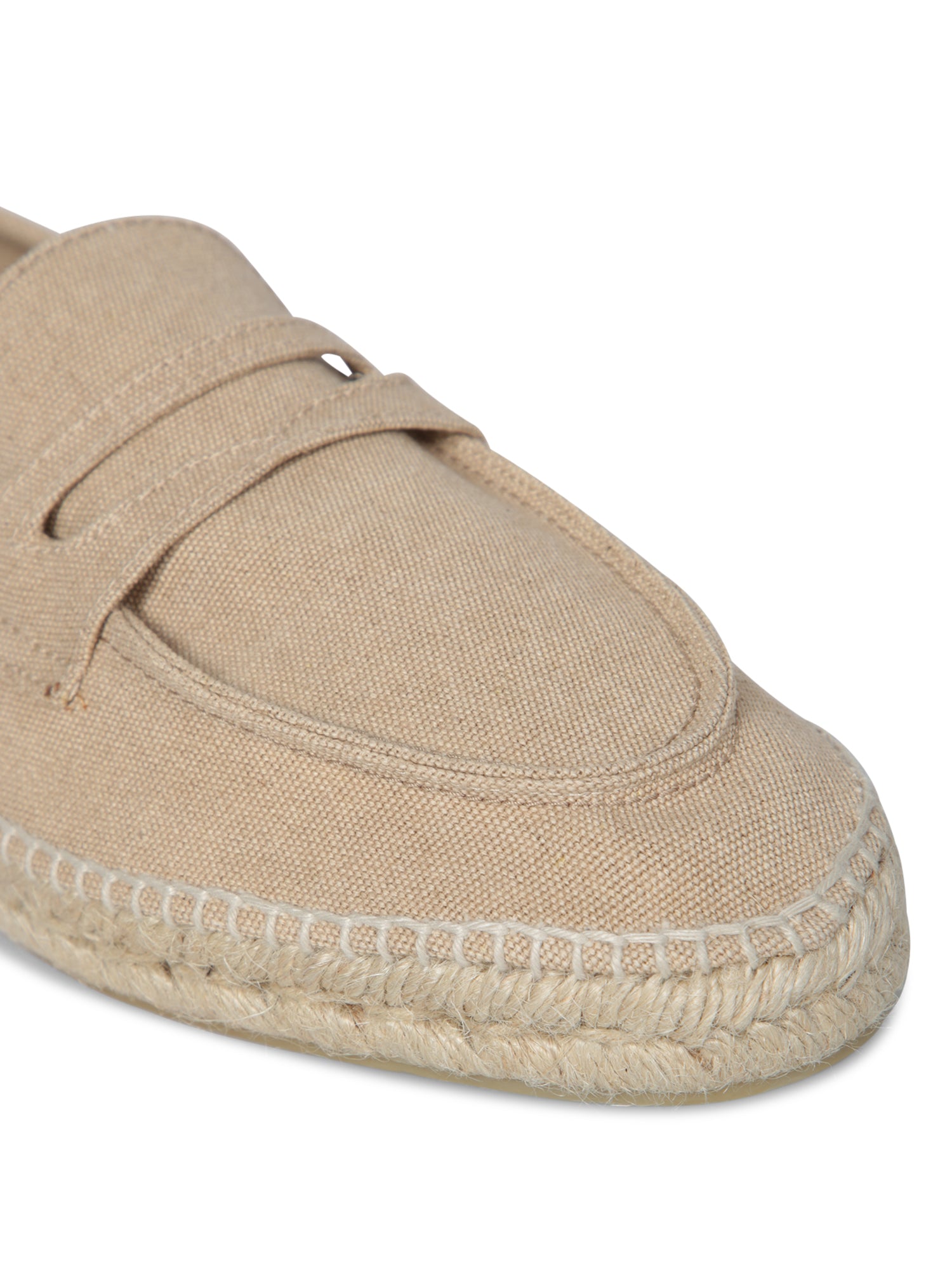 Beige cotton canvas espadrilles. Braided jute sole. Front knot detail.