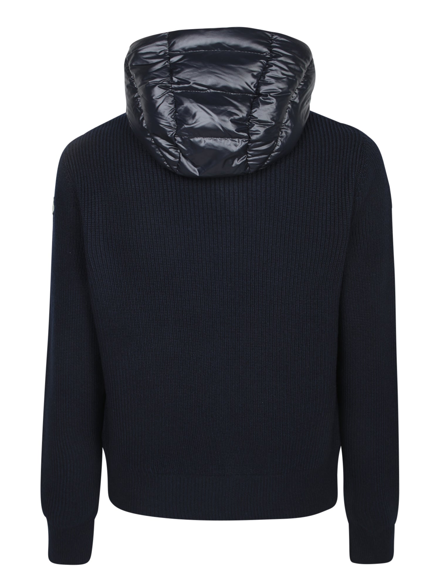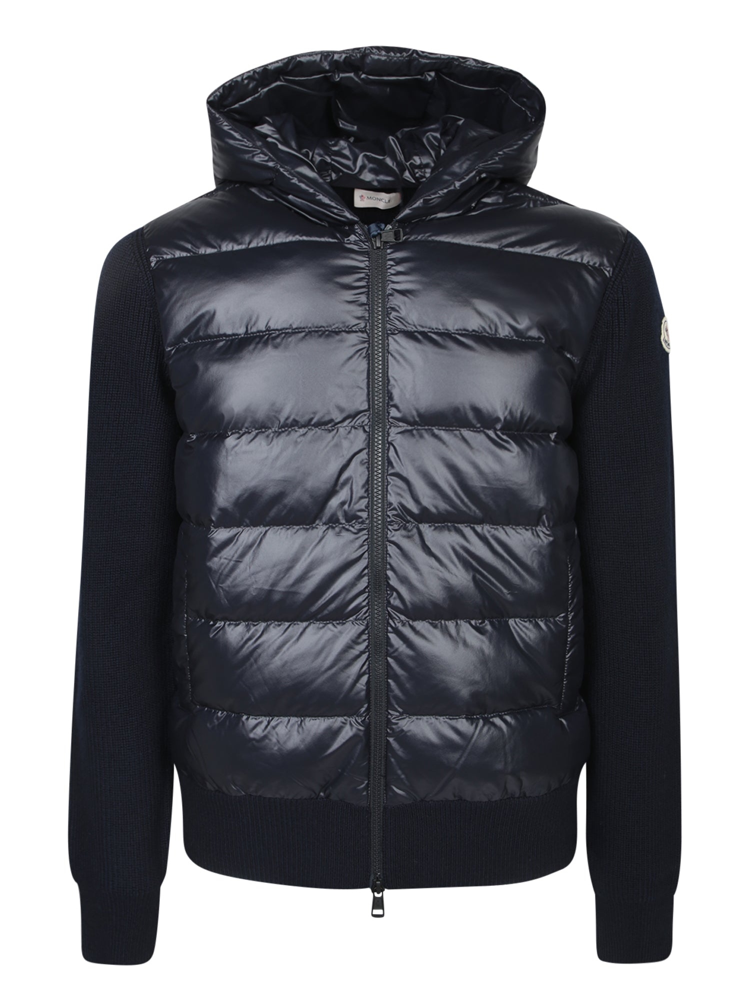 Hooded cardigan featuring technical fabric and knit. Front zip closure. Ribbed cuffs and hem.