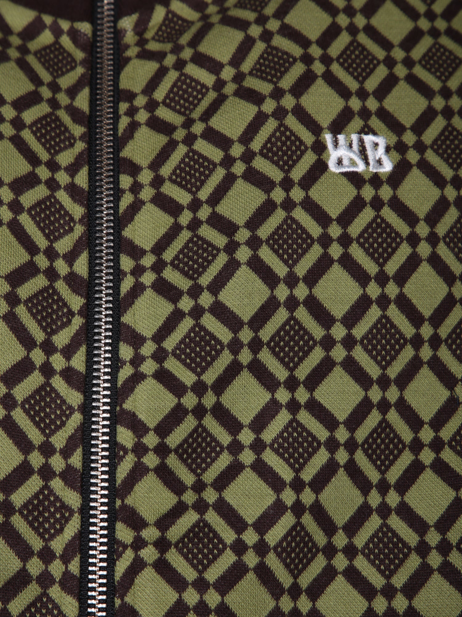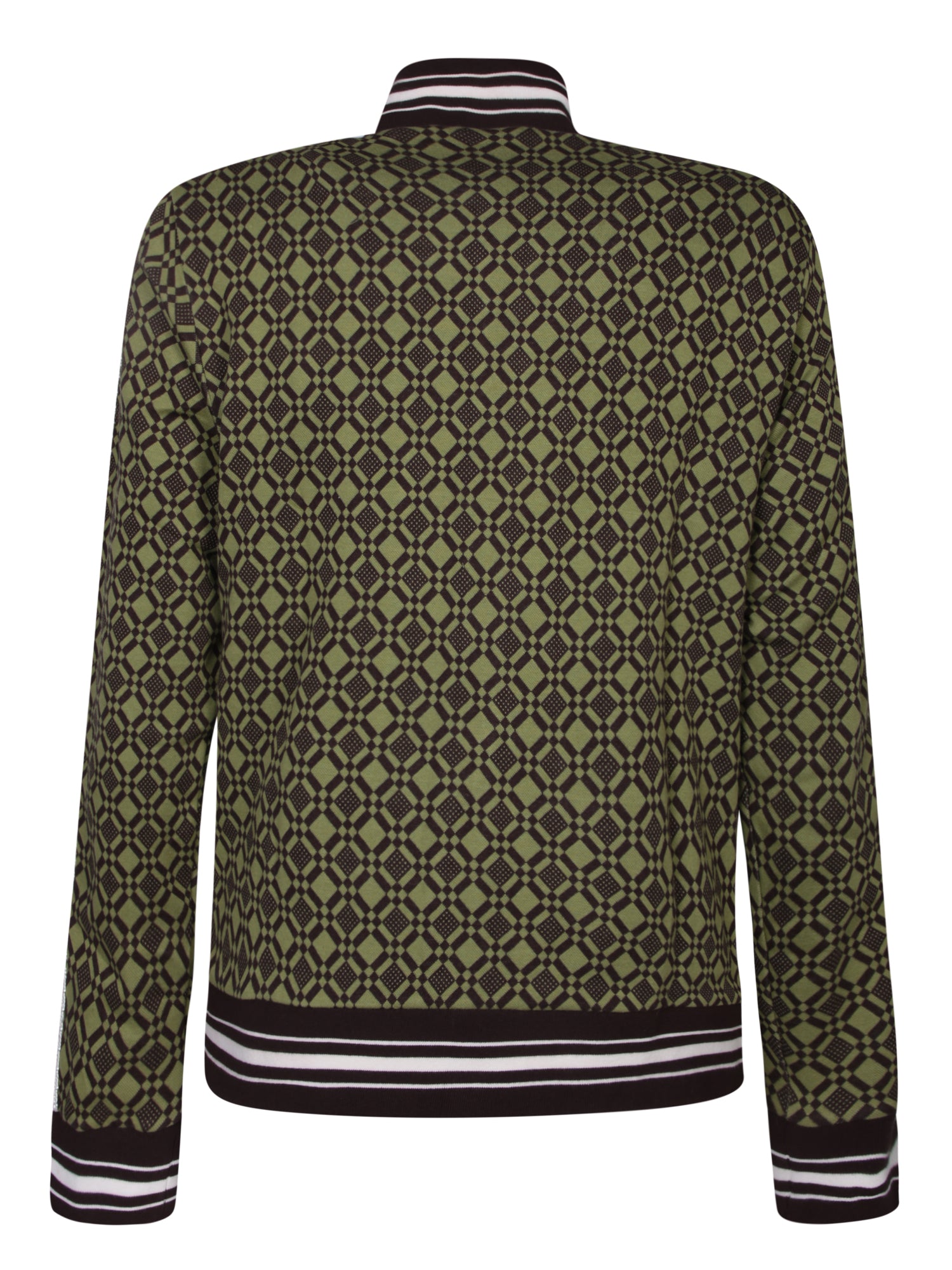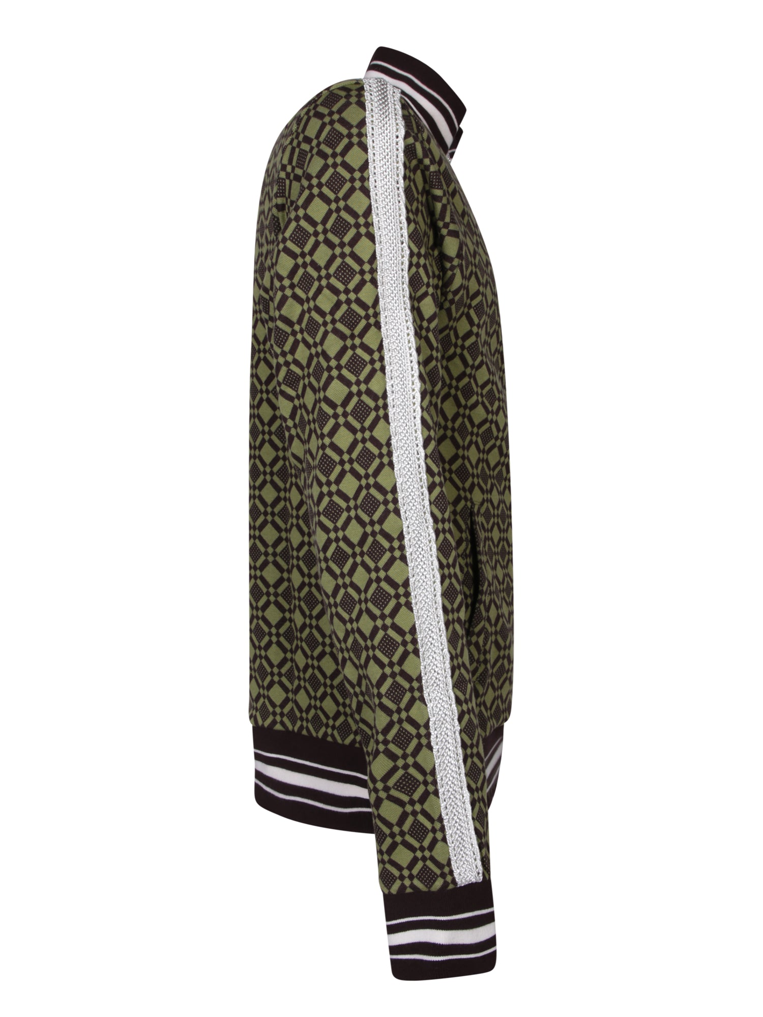 Sporty jacket with front zip closure. Geometric pattern in jacquard fabric. Striped trims on collar, cuffs, and hem.