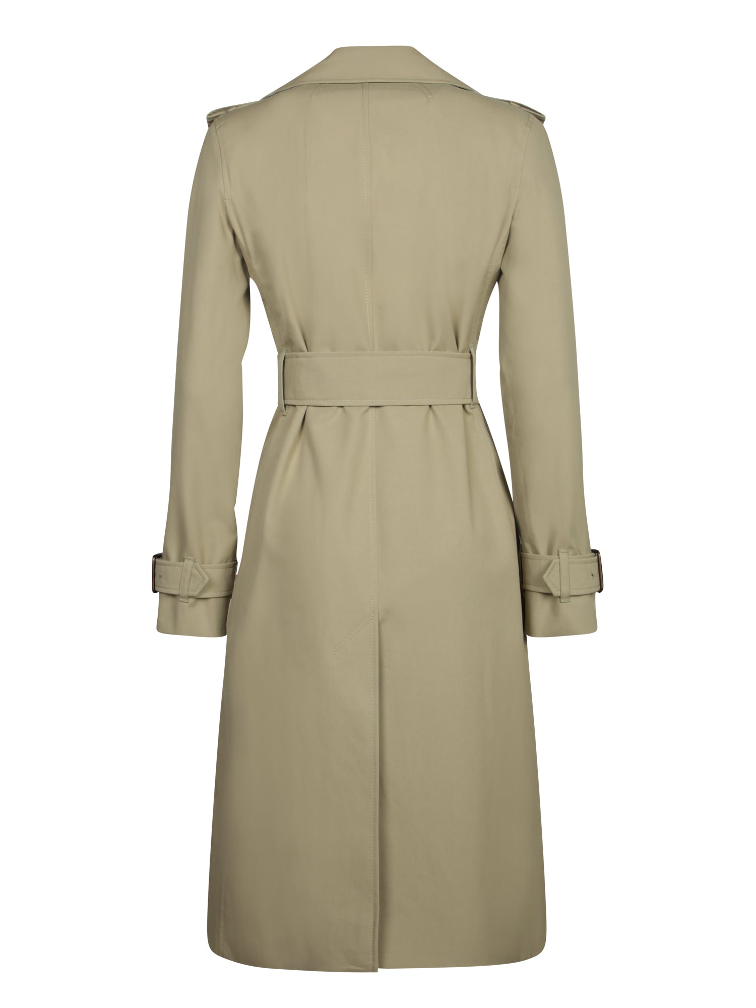 Oversized trench coat with adjustable belt. Double-breasted button closure. Strapped cuffs.