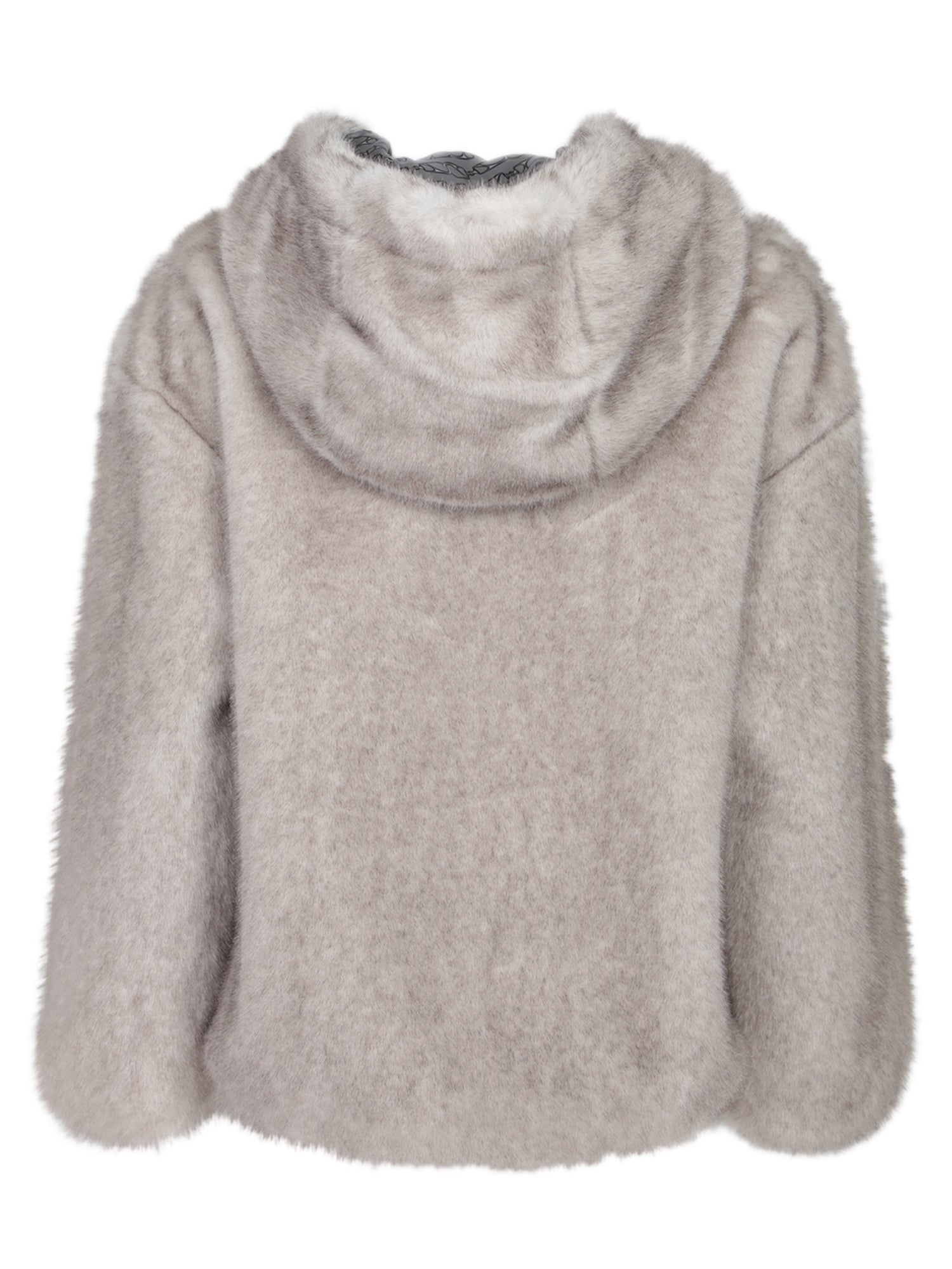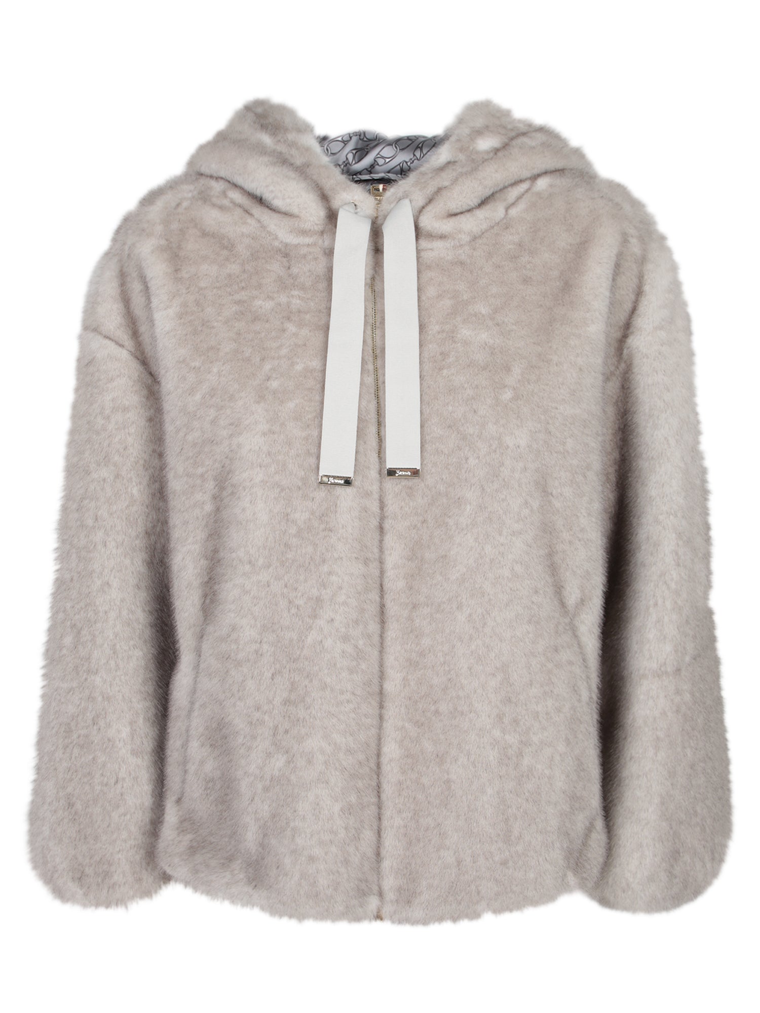 Bomber with hood. Front zip closure. Contrasting interior lining.