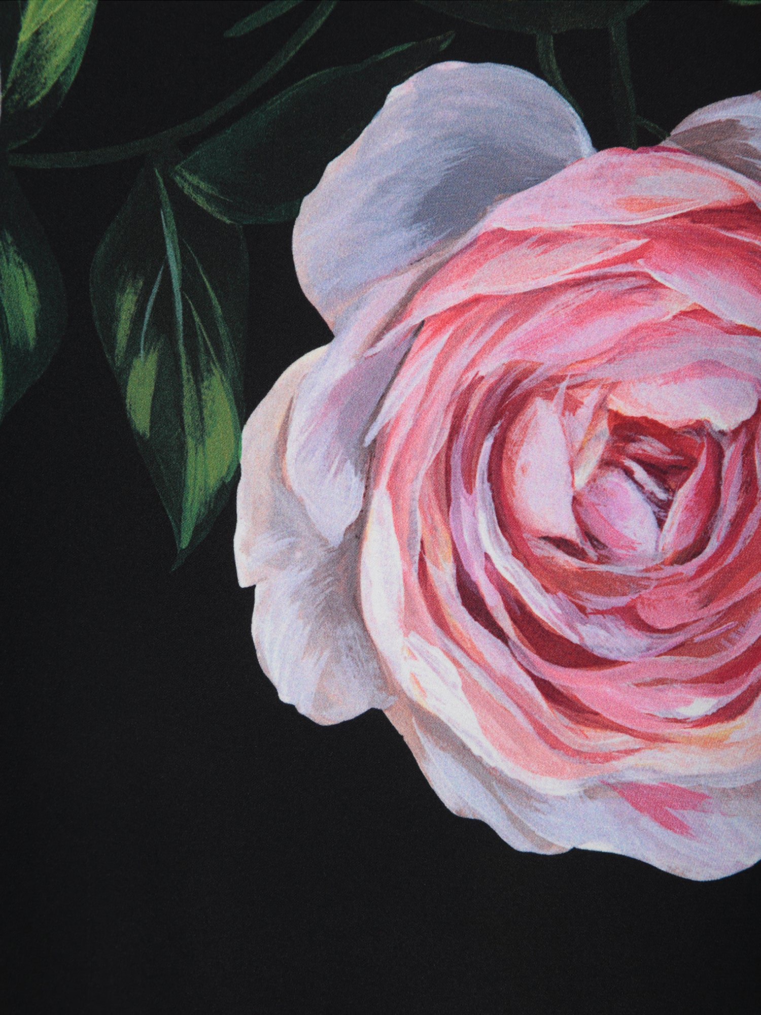 This exclusive Dolce & Gabbana top is crafted from luxurious black silk and adorned with an elegant print of roses and peonies, enhancing the garment's femininity and elegance.