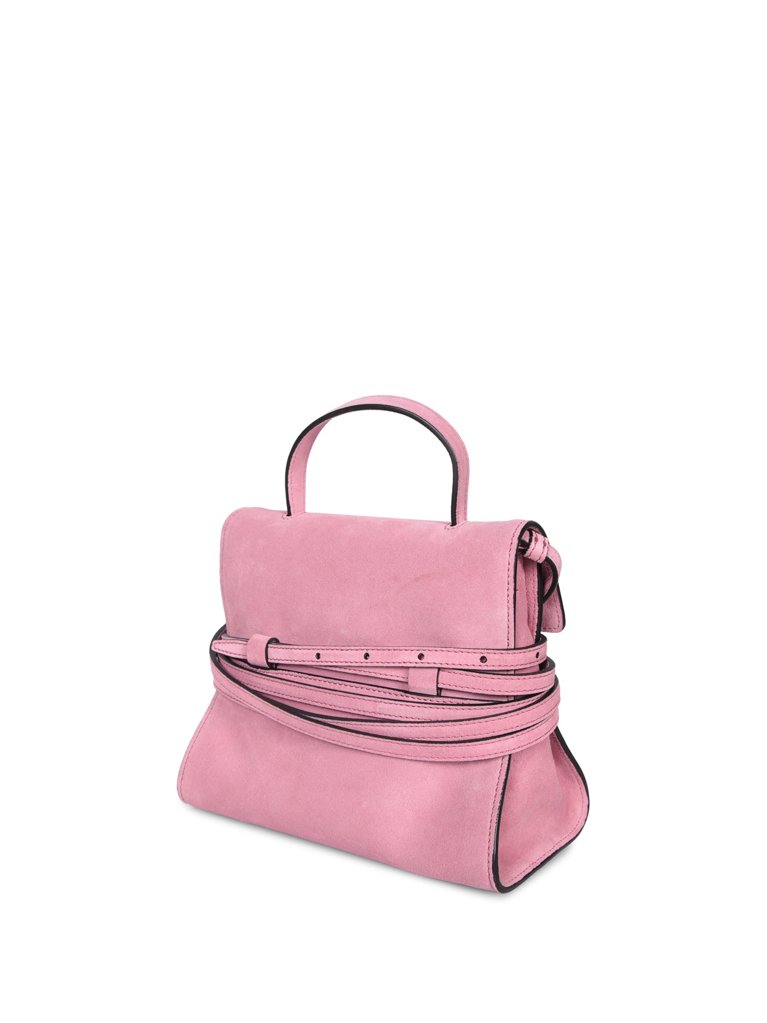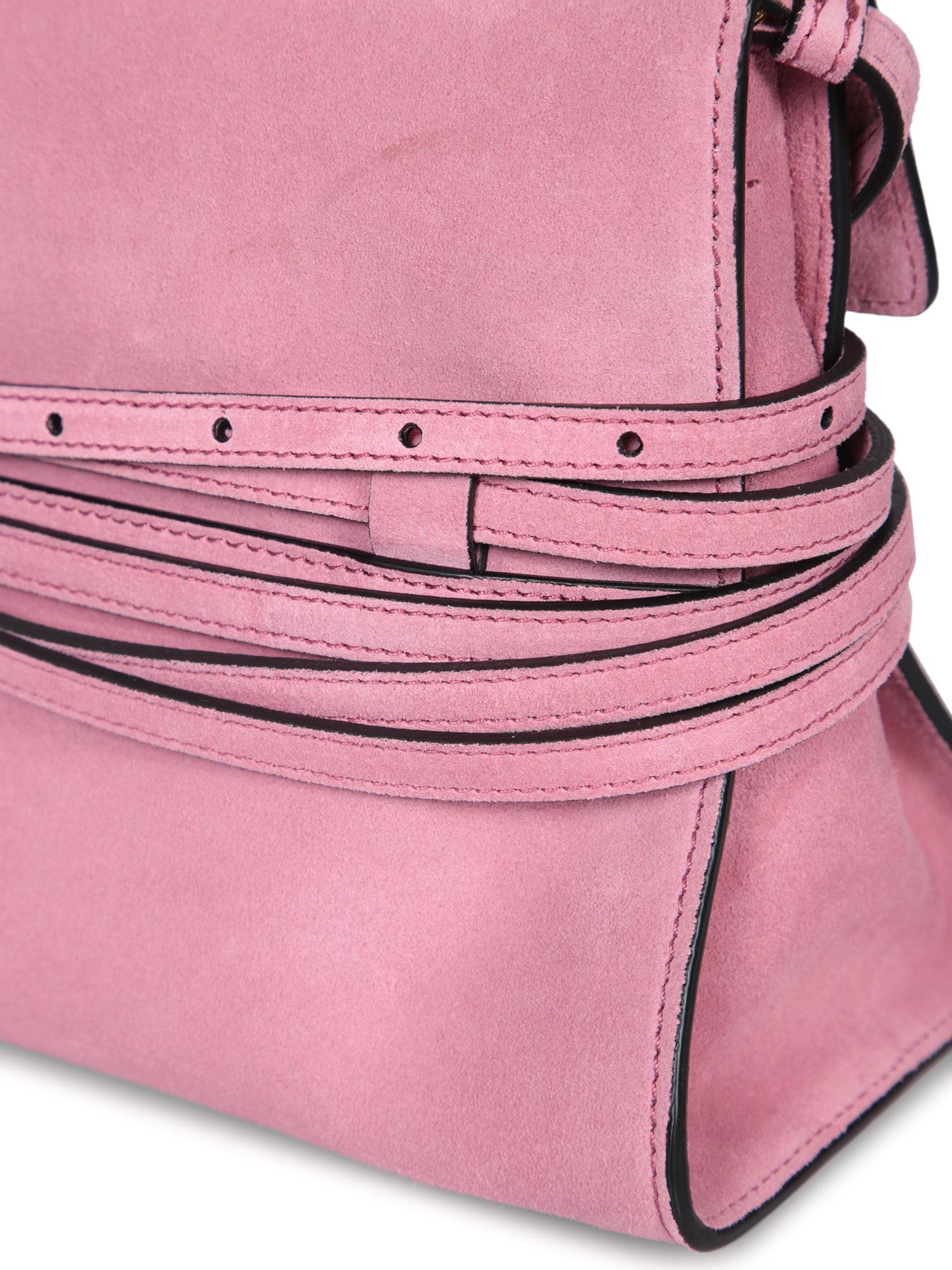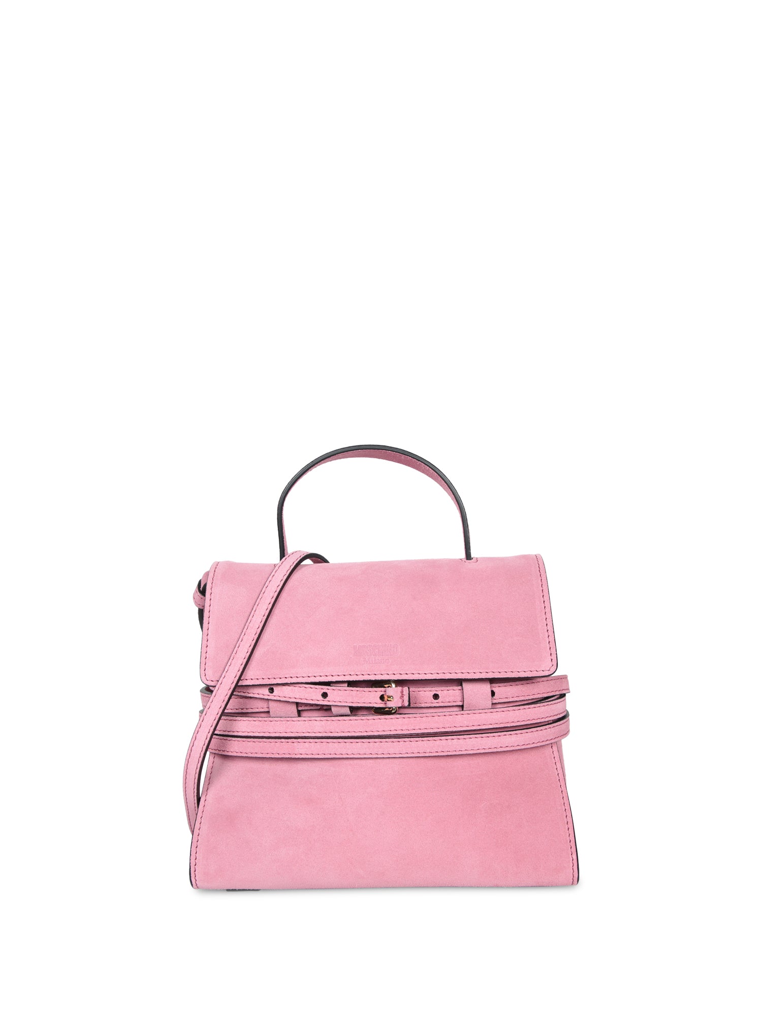 Pink suede bag with belting details. Flap closure with button. Top handle and adjustable, removable shoulder strap.