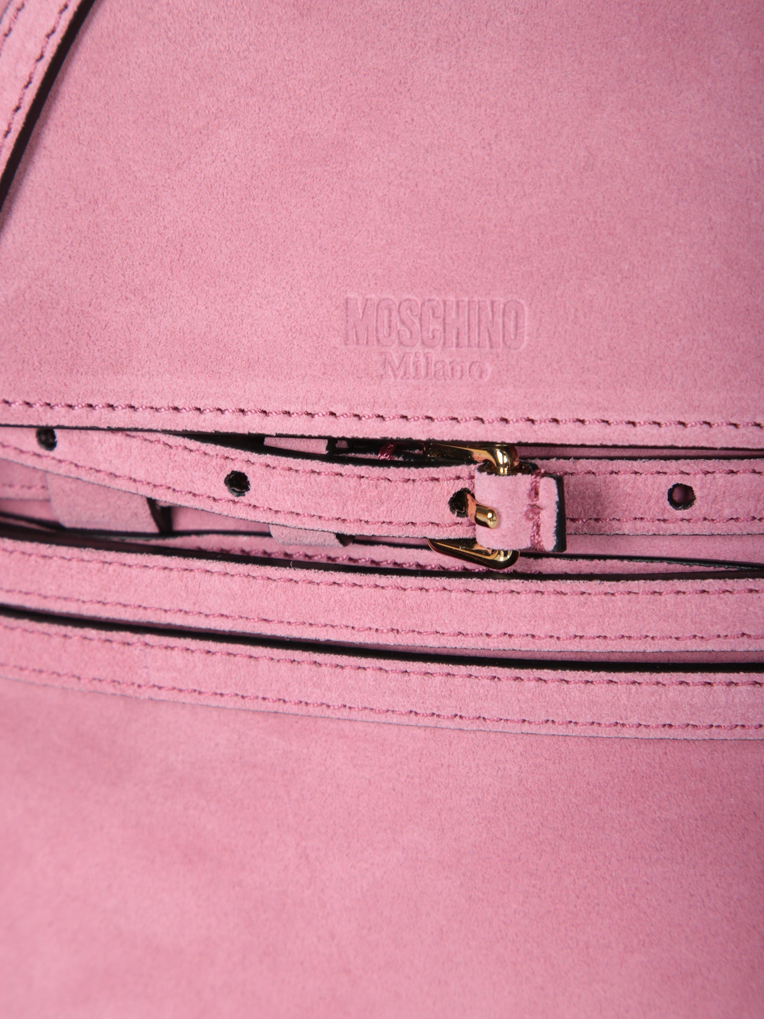 Elegance and innovation come together in this Moschino pink suede bag. Featuring a sophisticated design with strap details, it's perfect for adding a touch of class to any outfit. Equipped with an adjustable strap, it offers versatility and style.