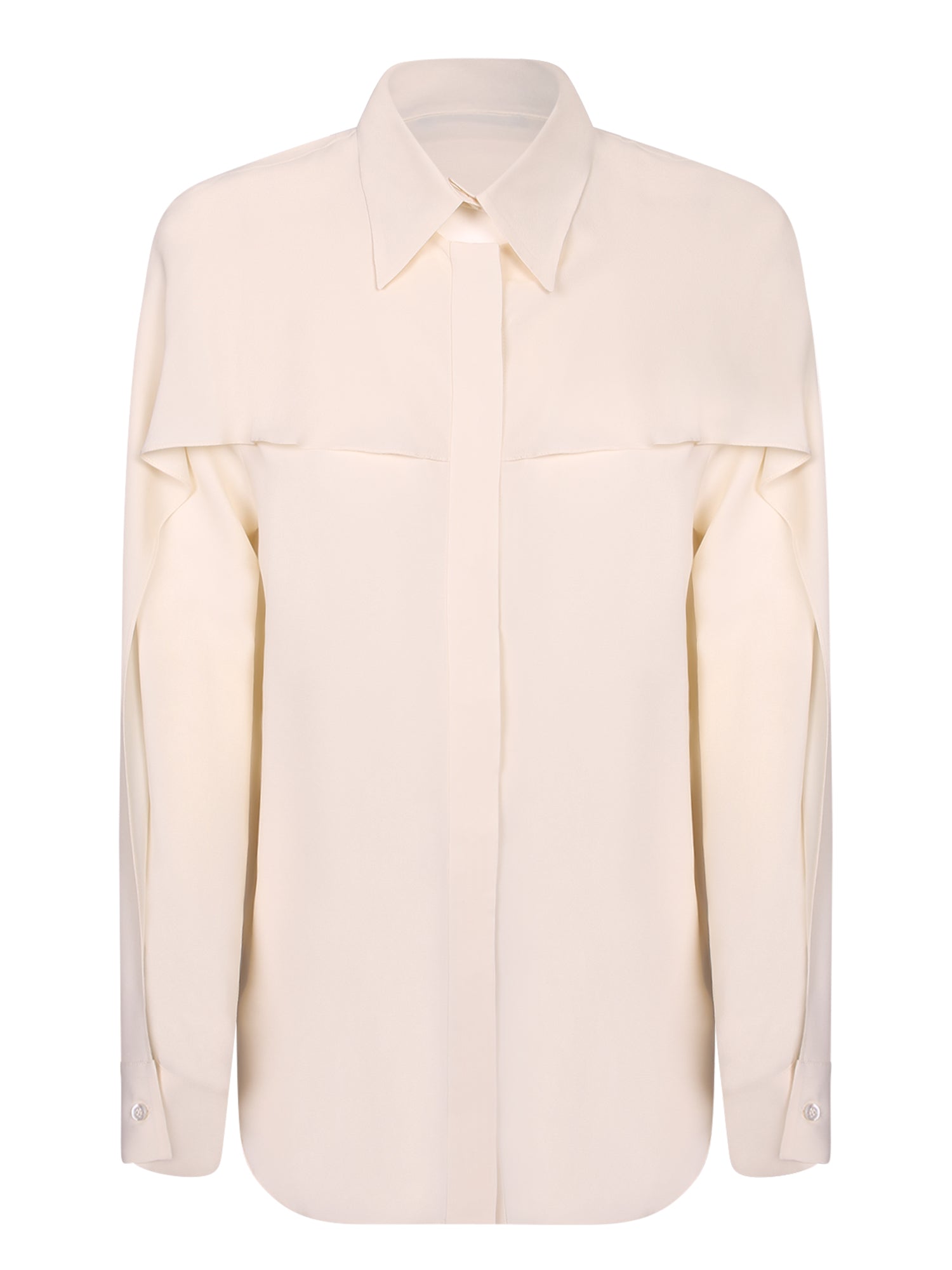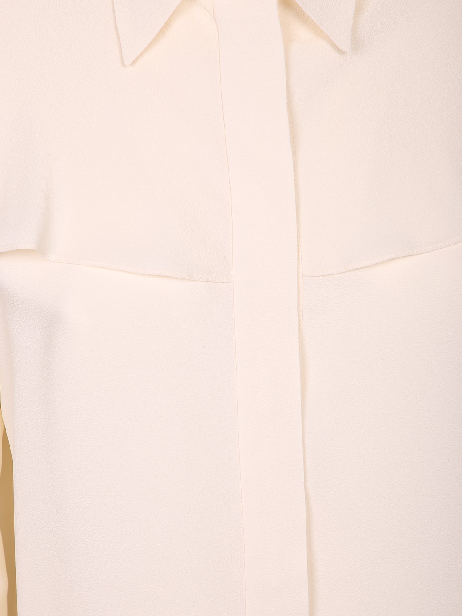 Cream-colored cotton poplin shirt. Classic collar and front button closure. Long sleeves with buttoned cuffs.