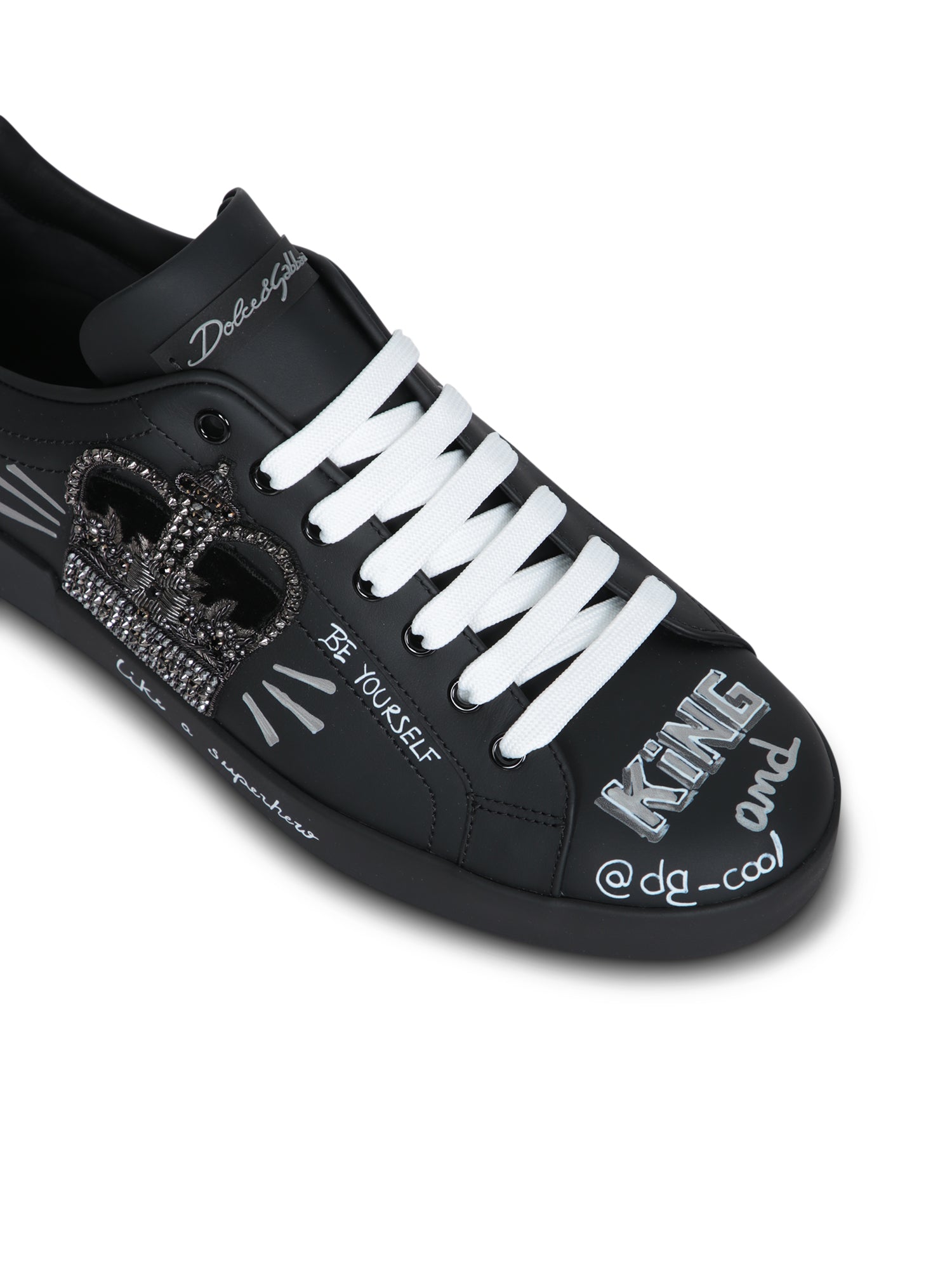 Capture the essence of casual luxury with these Dolce & Gabbana Portofino sneakers. Finished with the boldness of glossy black and shiny silver, these shoes are embellished with inspiring writings and a bold rhinestone decor reflecting the elegance and da