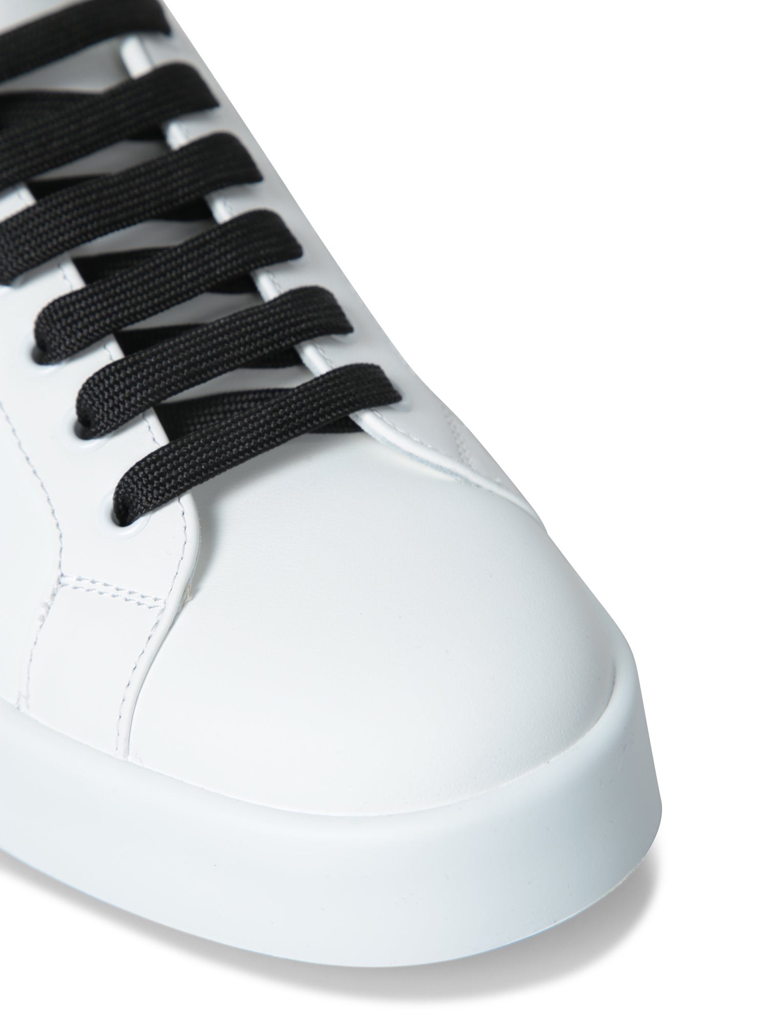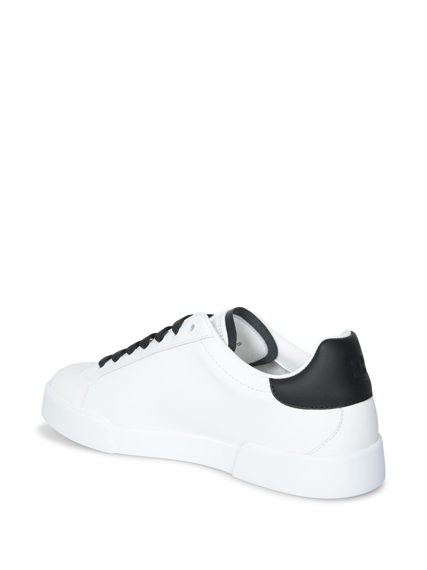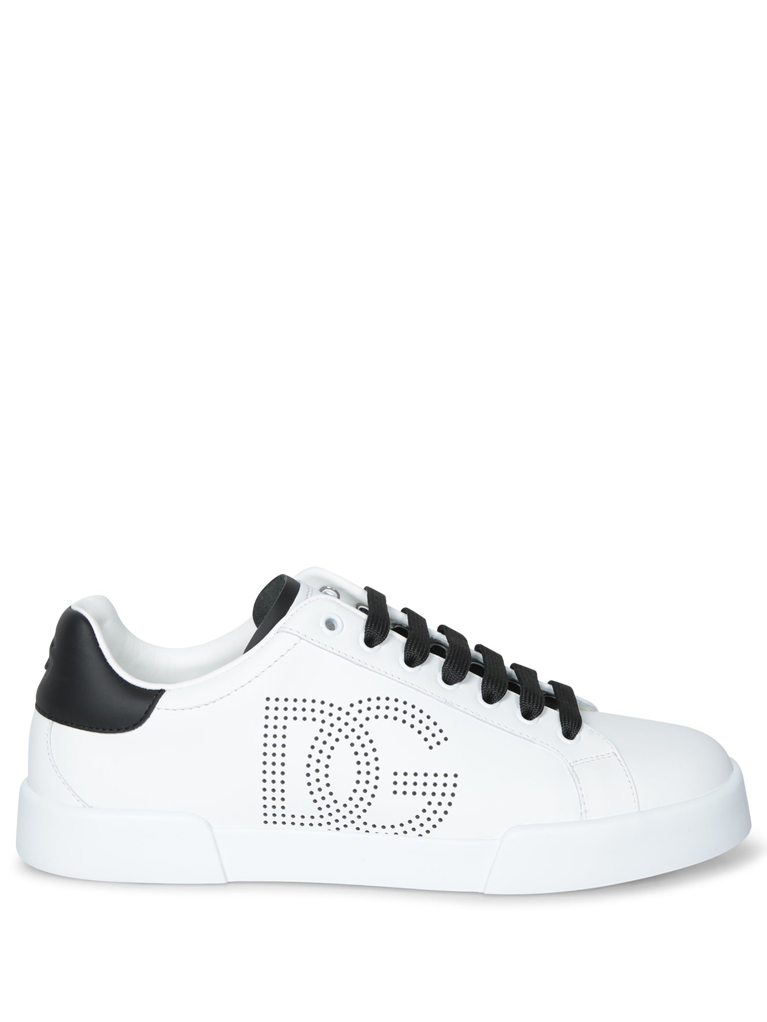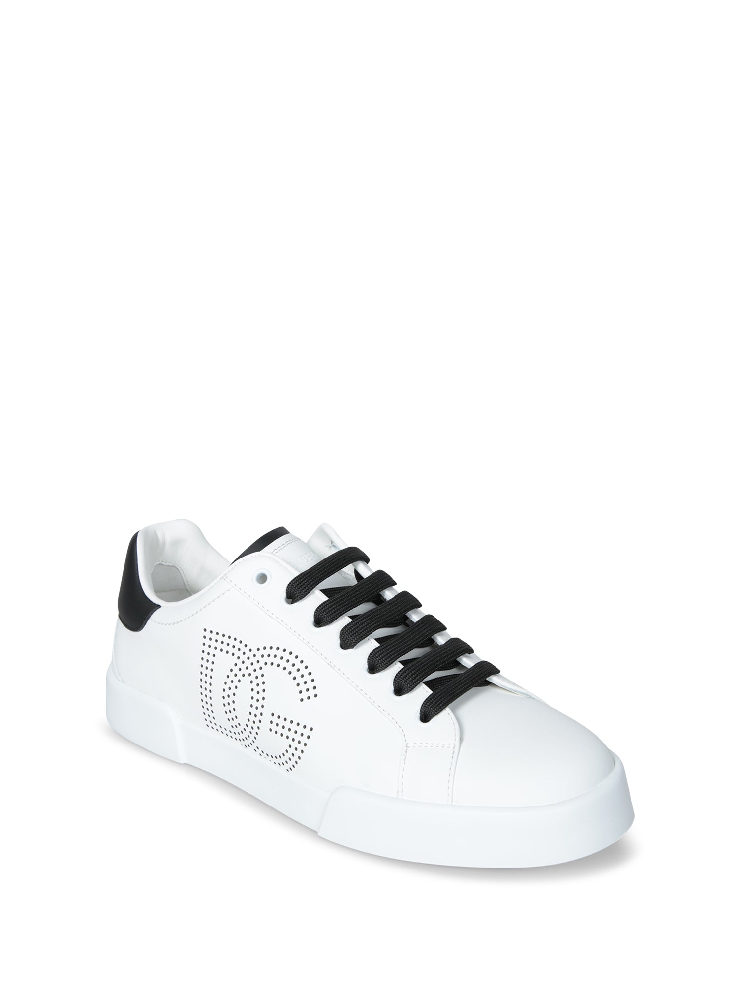 Elegance and style meet in these Dolce & Gabbana Portofino sneakers, featuring a bold perforated logo on an immaculate white background with sophisticated black accents on the heel.