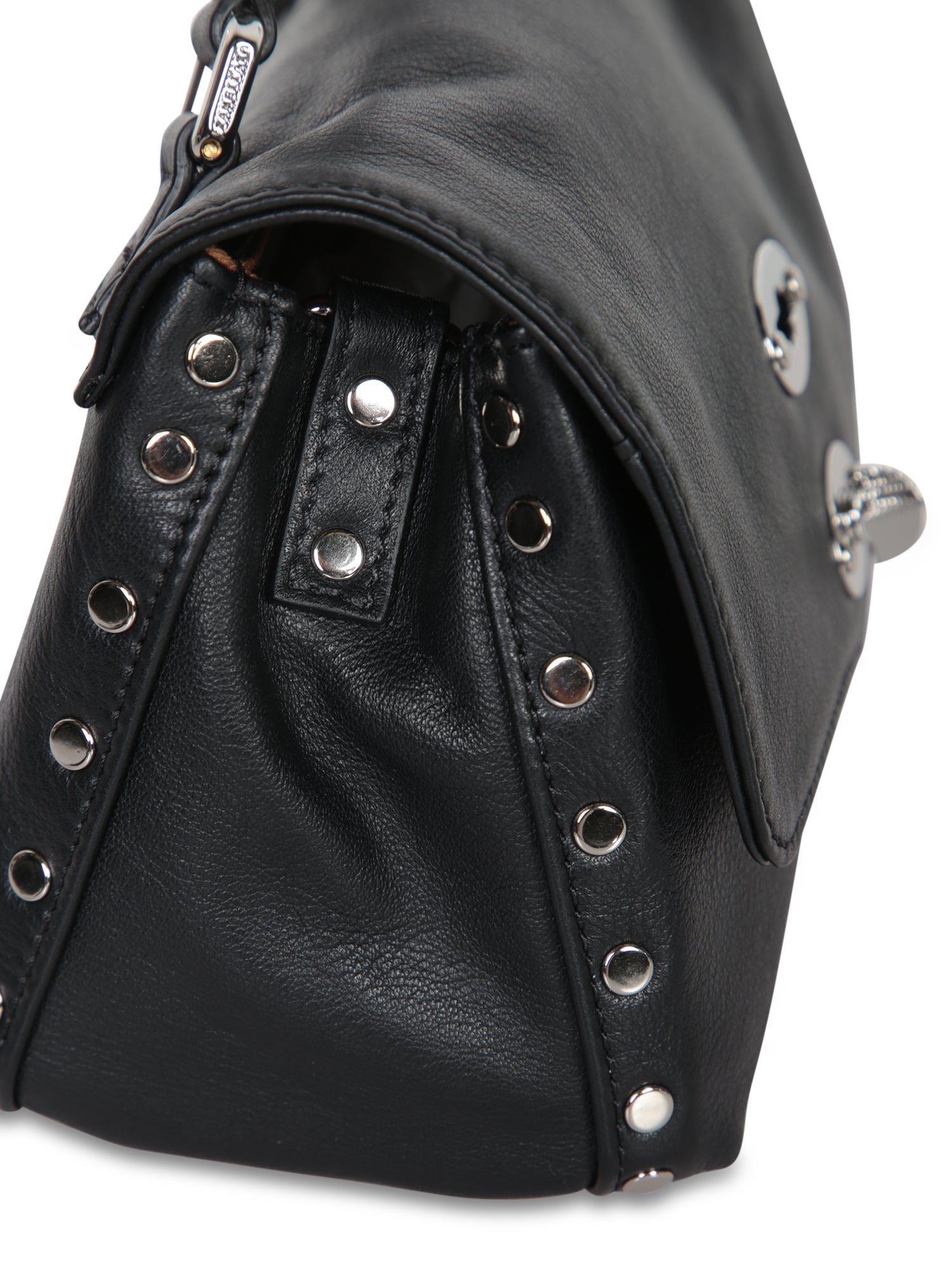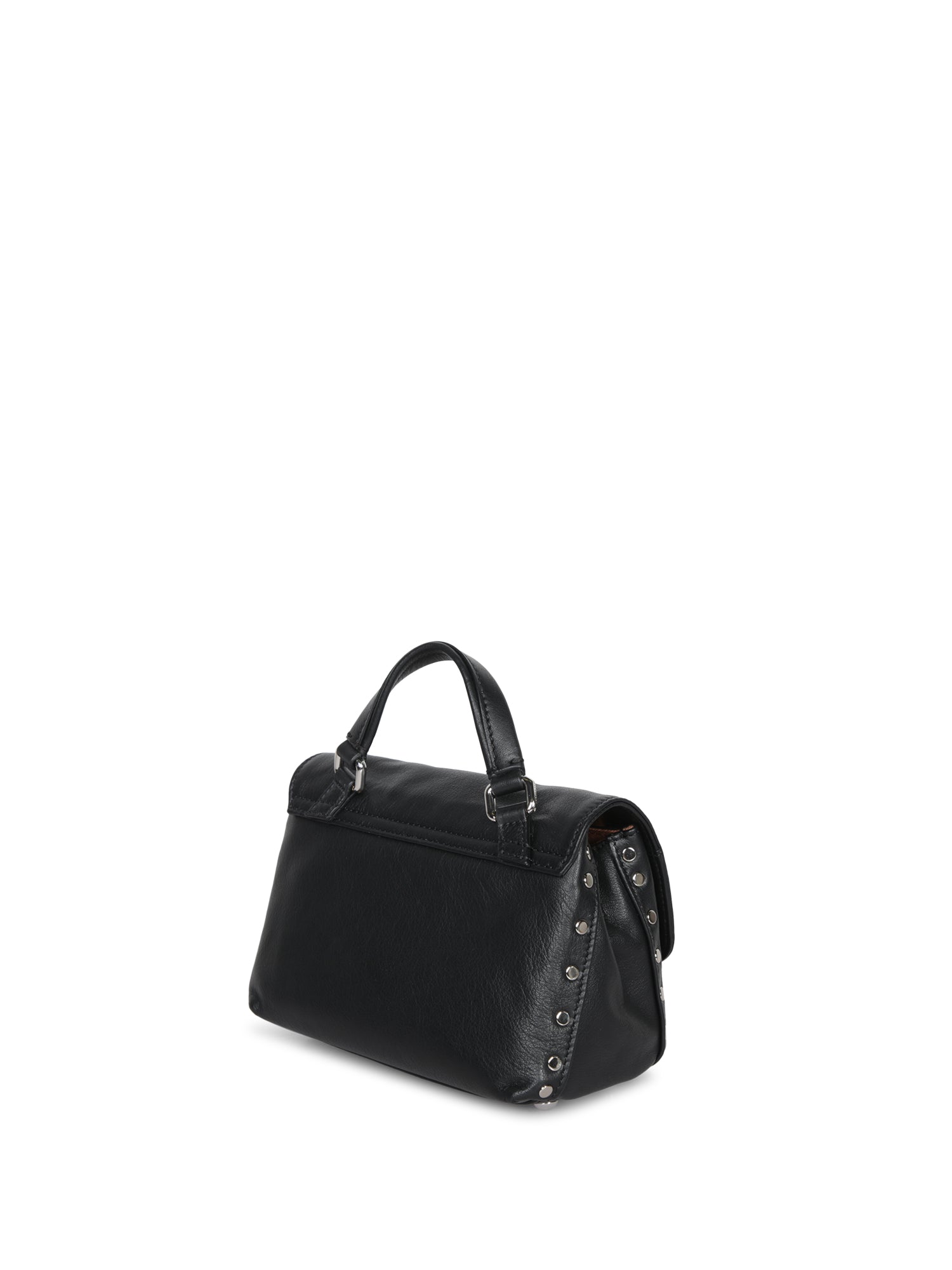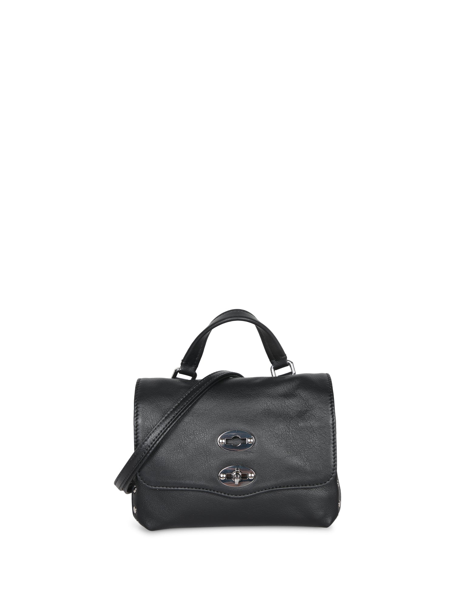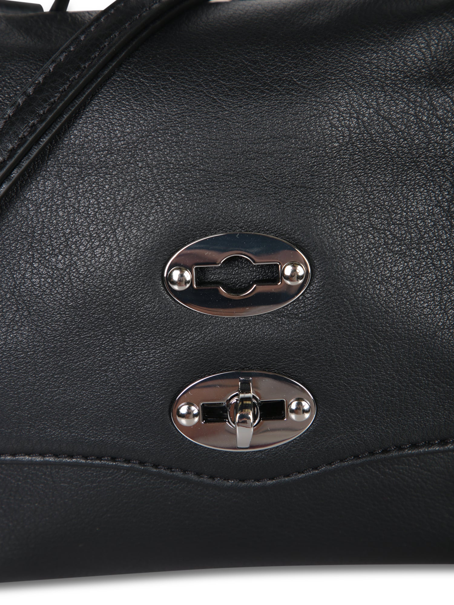 This elegant Zanellato Postina black leather bag features a structured silhouette with distinctive details such as exposed stitching and metal turnstile closure, ideal for a sophisticated look.
