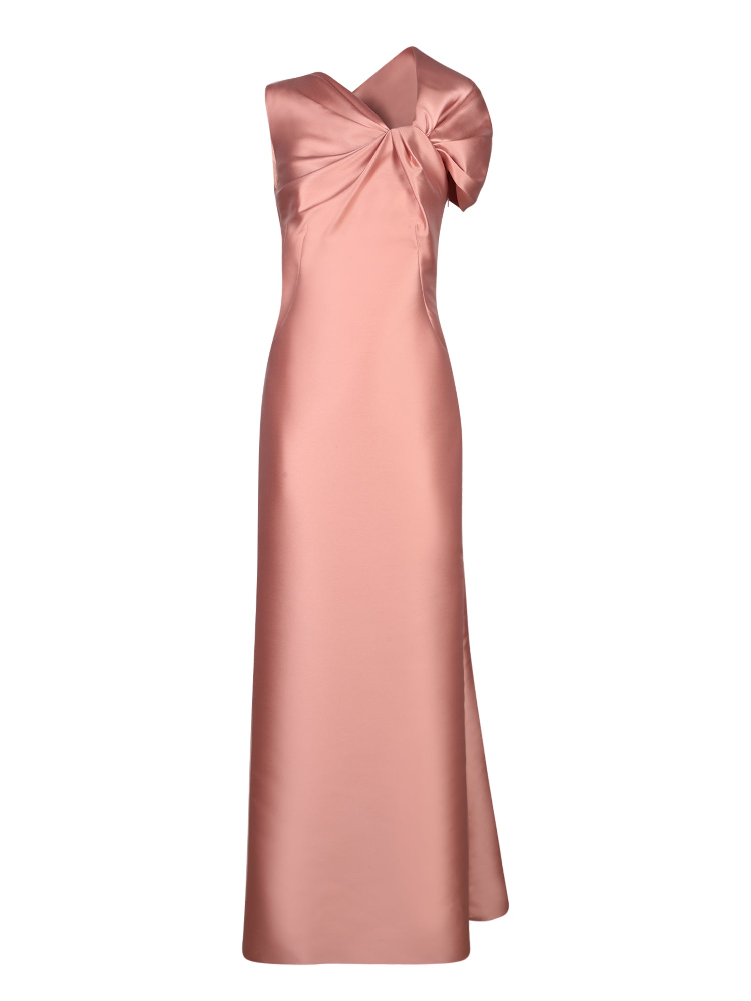 Sleeveless mikado fabric dress. One-shoulder design with large bow detail on the shoulder.