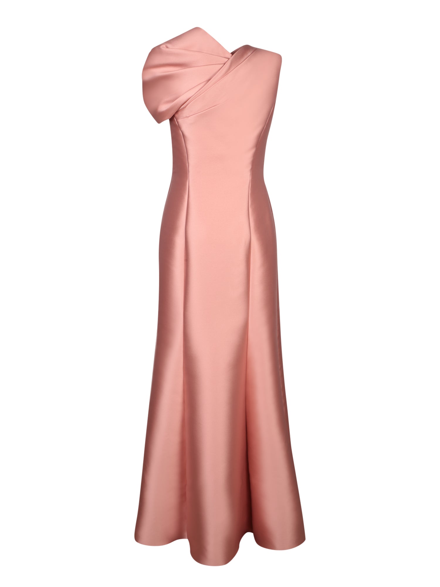 This elegant Alberta Ferretti long dress embodies femininity and elegance with its delicate powder pink color and sophisticated design featuring an artistic bow that accentuates the silhouette.