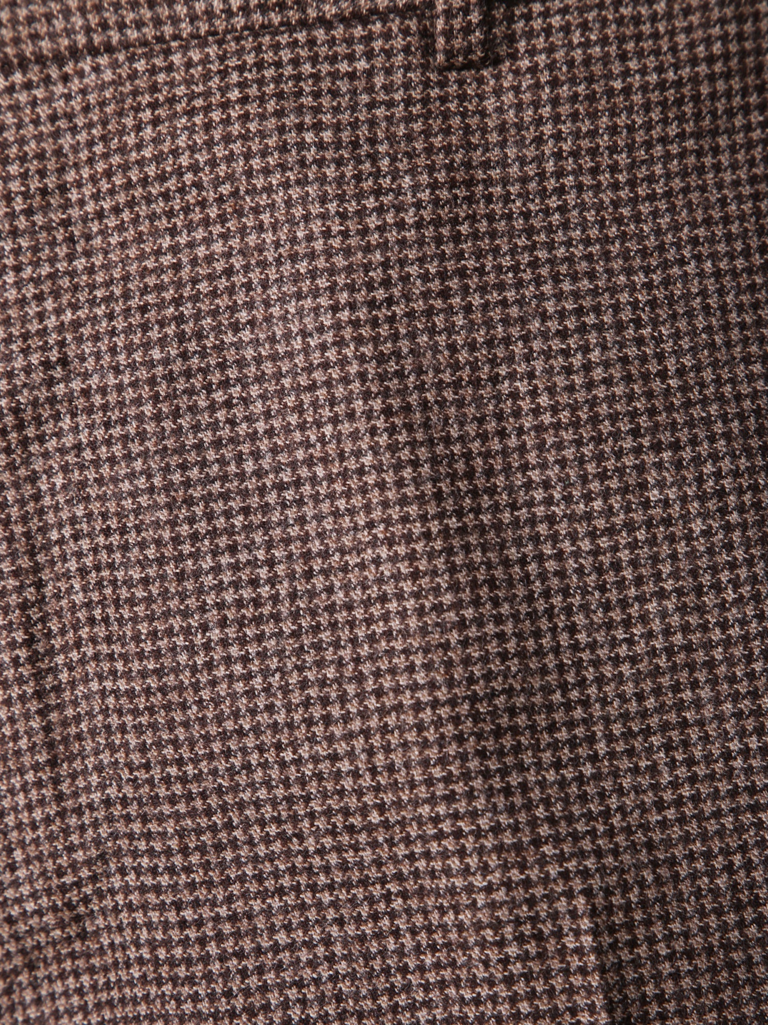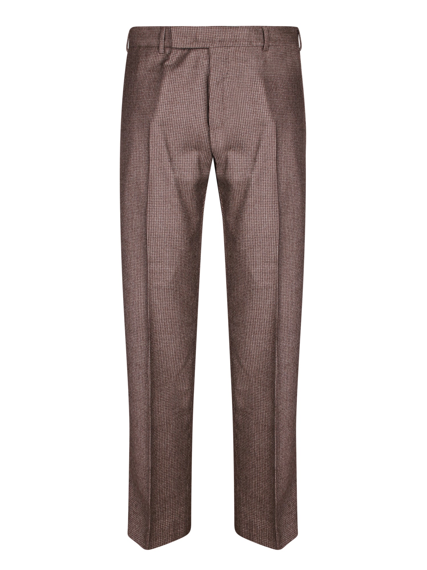 Trousers with front crease. Side welt pockets. Regular waist with belt loops.