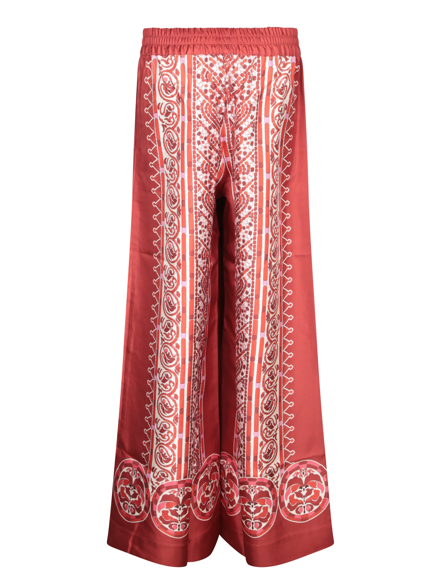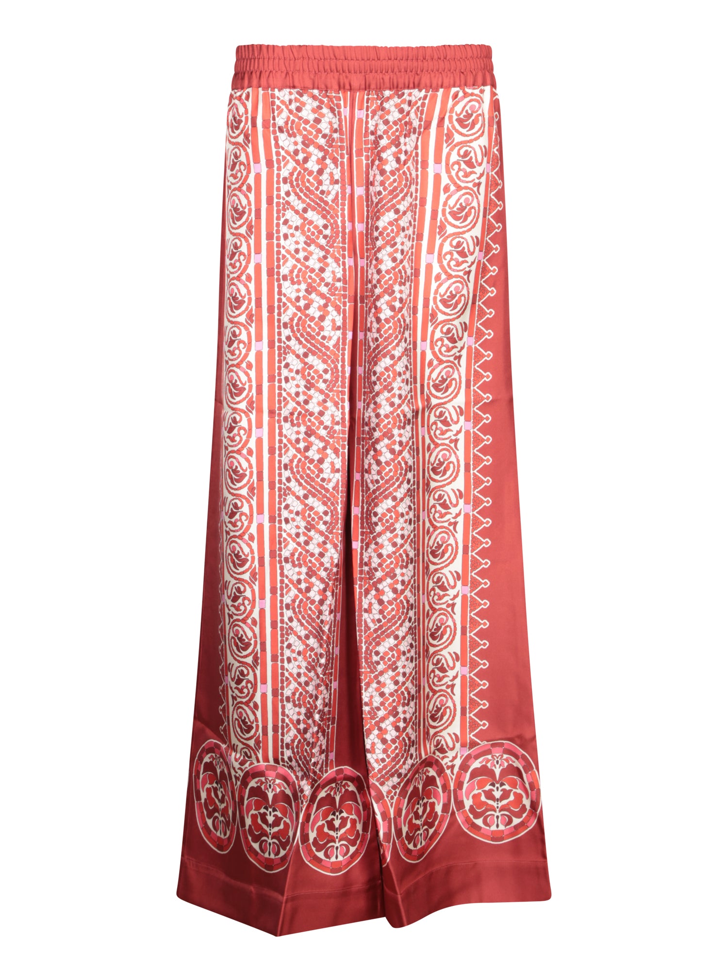 Showcase a bold look with La Double J's Red Cobra Lace Print Palazzo Pants. Crafted to provide both comfort and style, these pants feature an intricate and vibrant print, perfect for special occasions or making a daily style statement.