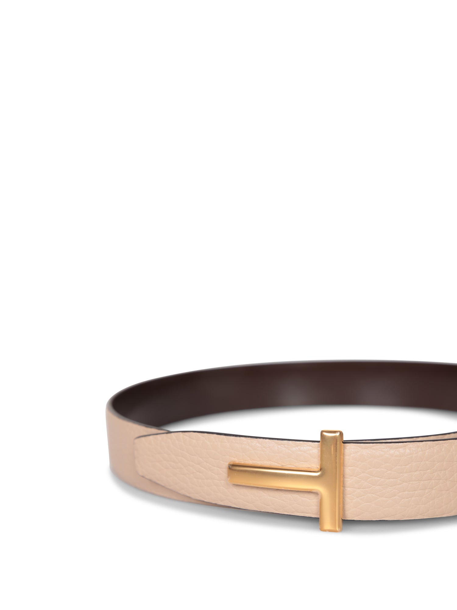 Reversible leather belt with gold T-shaped buckle. Dual-color design, beige on one side and brown on the other.