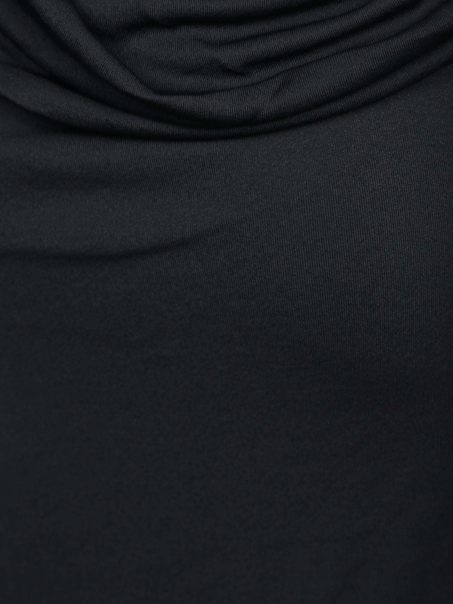 Black midi dress. Short sleeves, round neckline, straight cut.