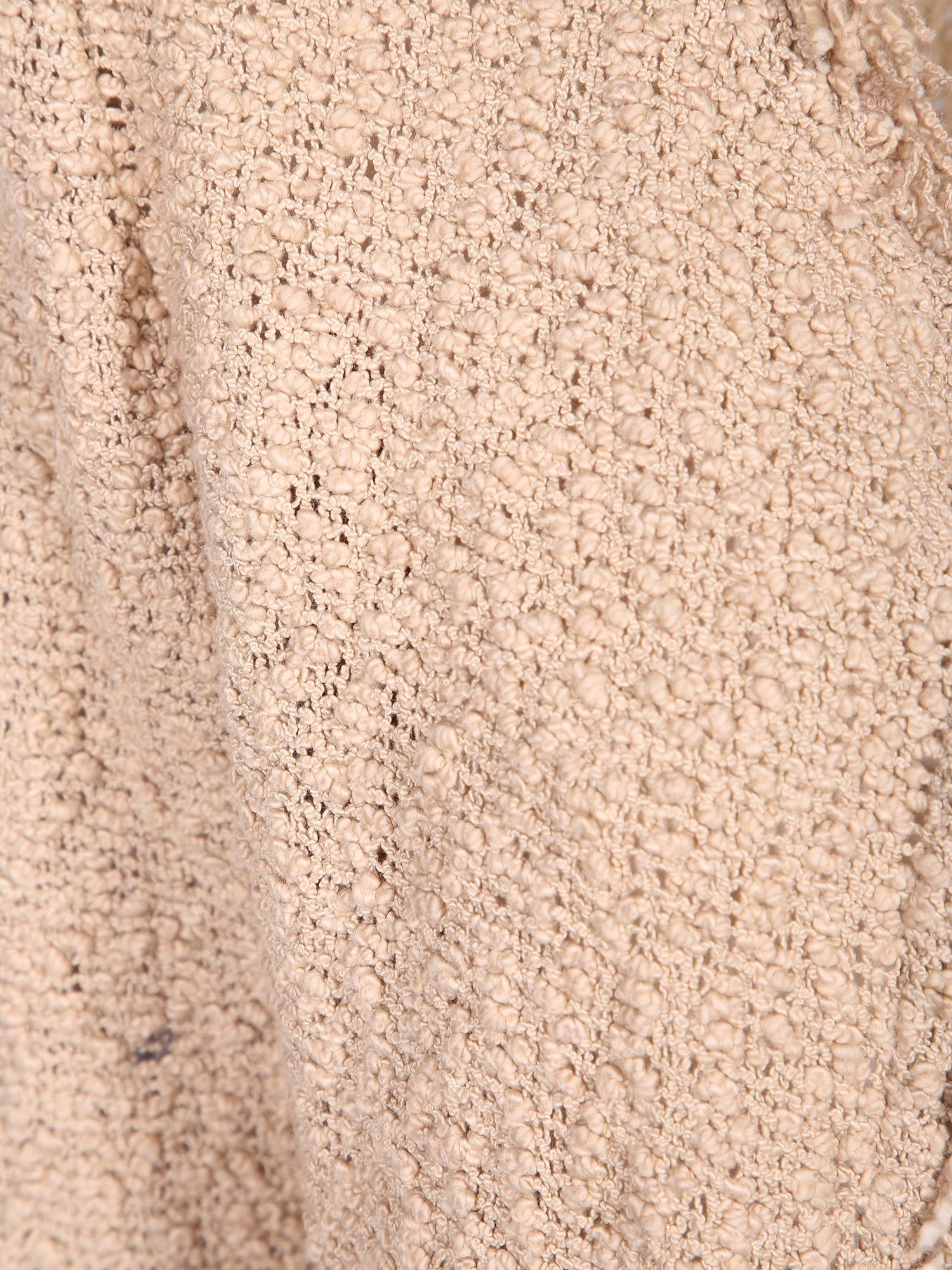 Structured knit fabric. Open cut without closure. Frayed hem.