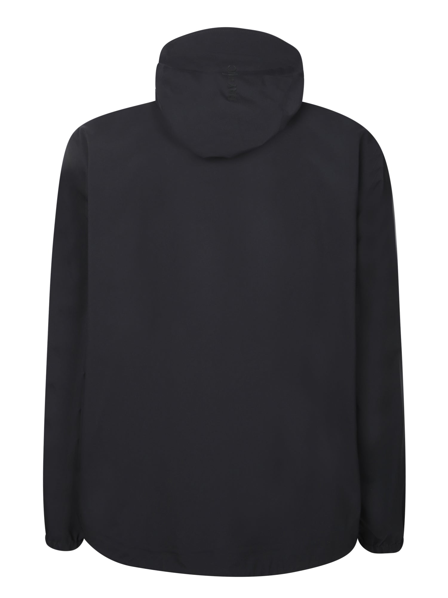 Technical hooded jacket with front zip closure, side zip pockets, reflective details.