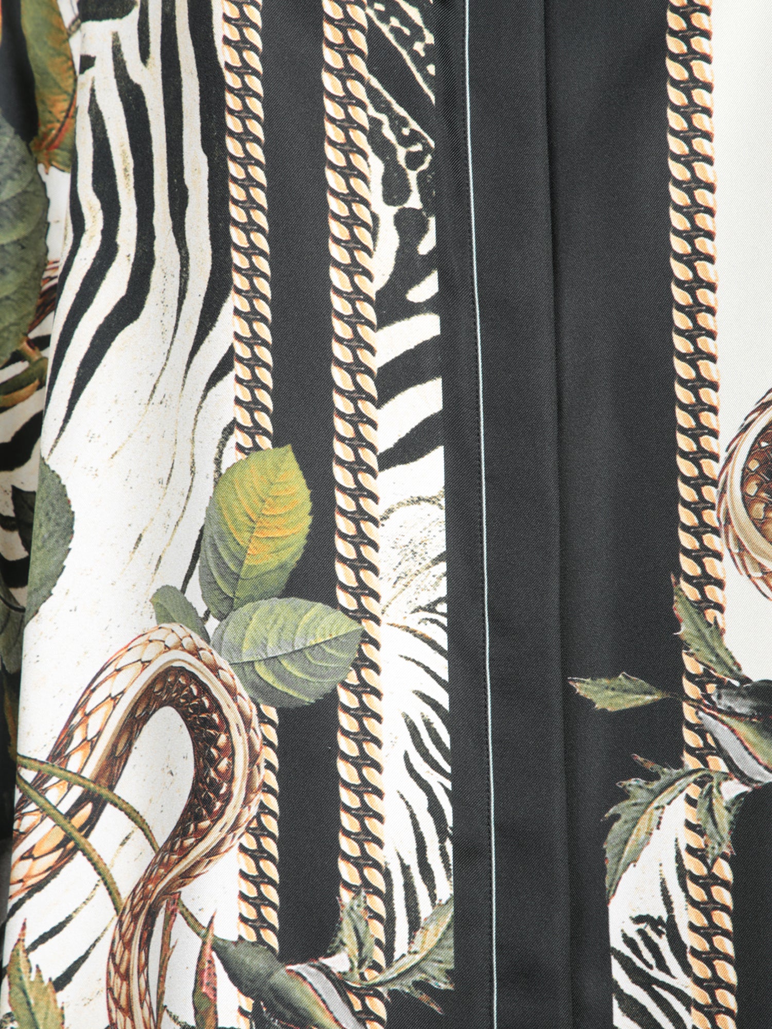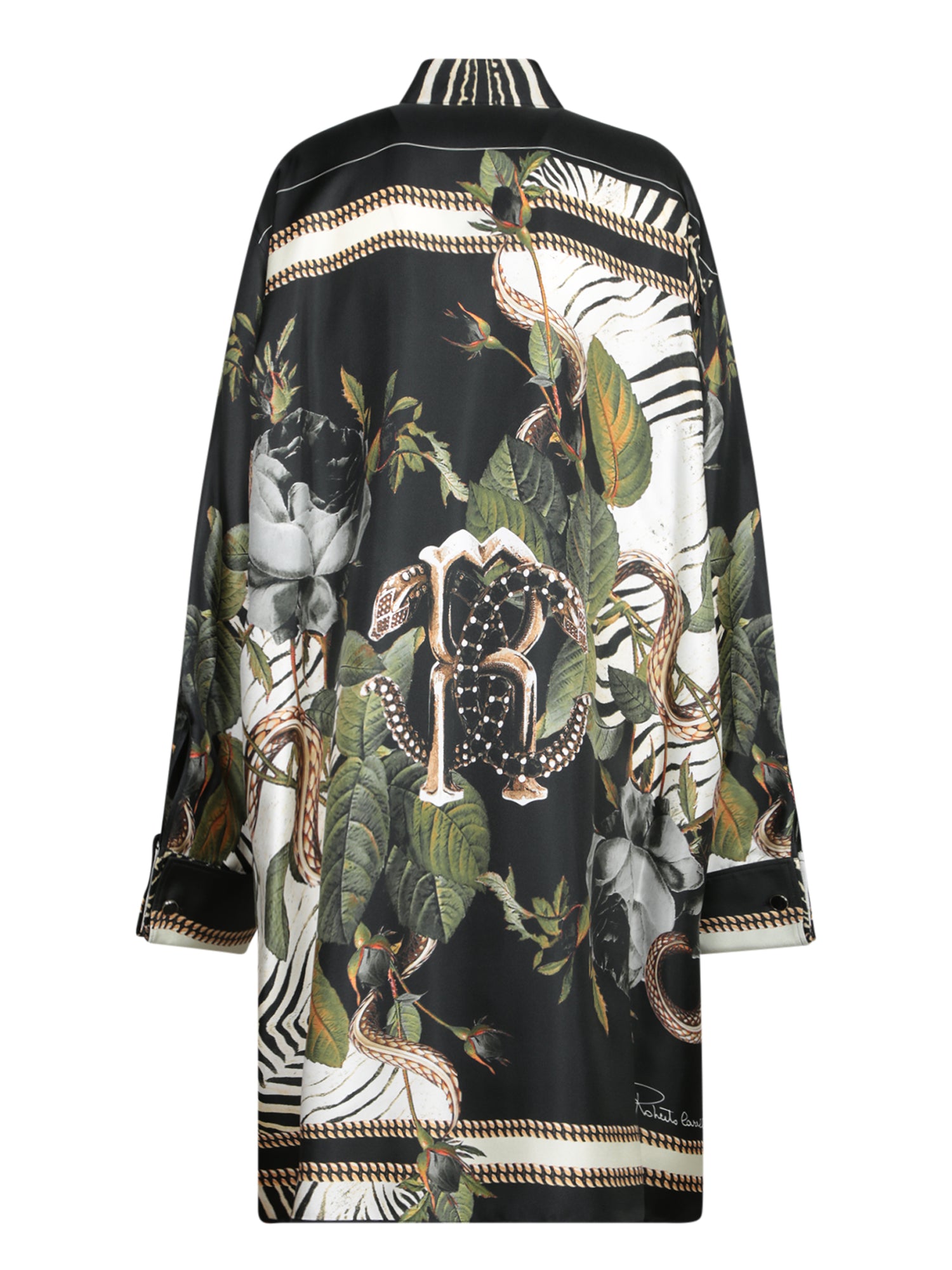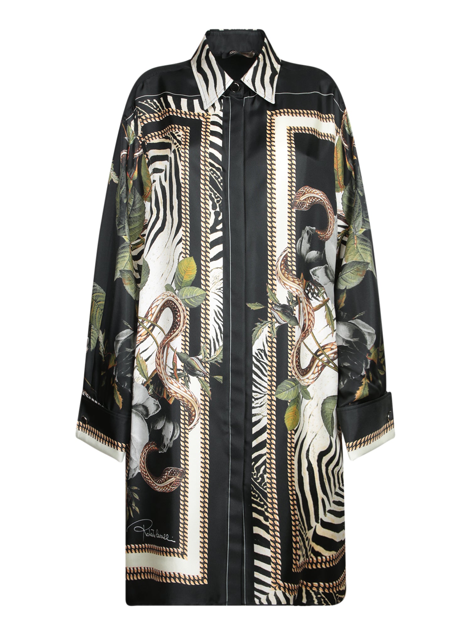 This Roberto Cavalli silk shirt features an exclusive scarf print design, adorned with floral and zebra motifs that elegantly frame the silhouette. Finished with geometric details and the designer's logo, it stands as a true emblem of luxury and style.