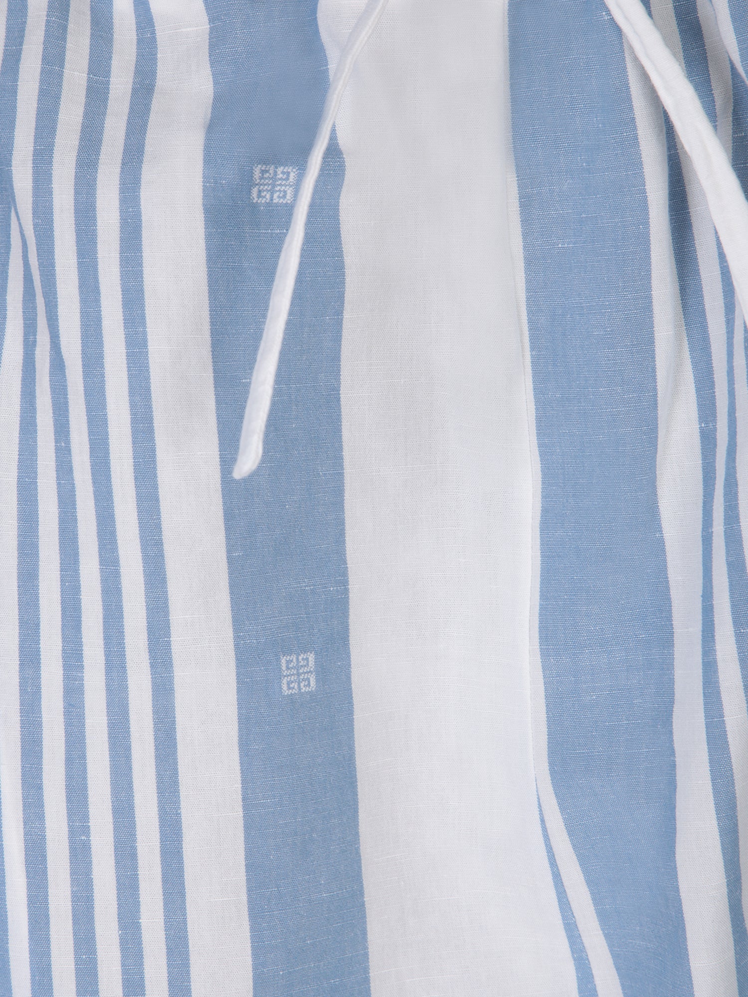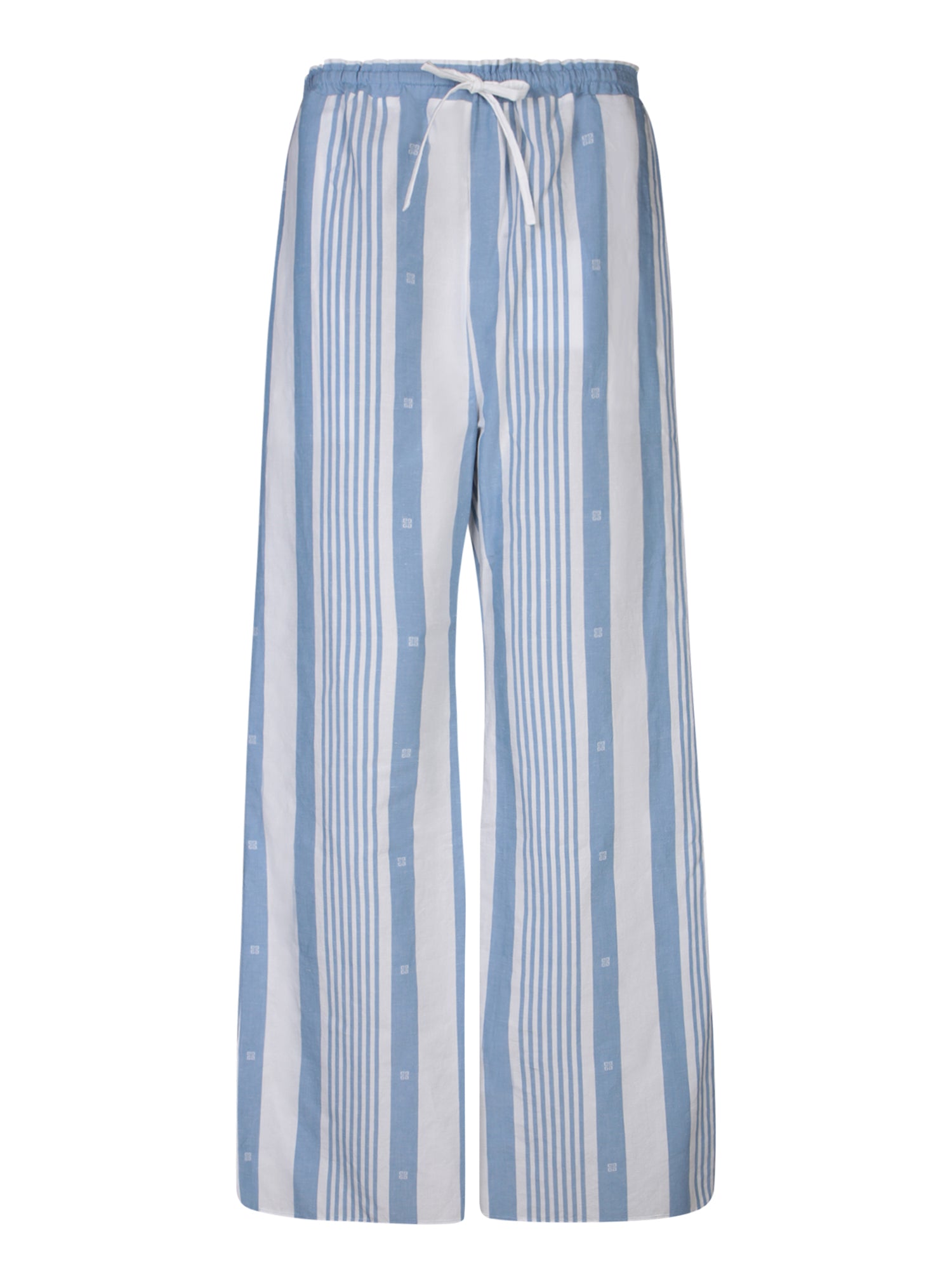 High-waisted trousers with drawstring, made from lightweight cotton fabric. Sky blue and white vertical striped design with logo details.