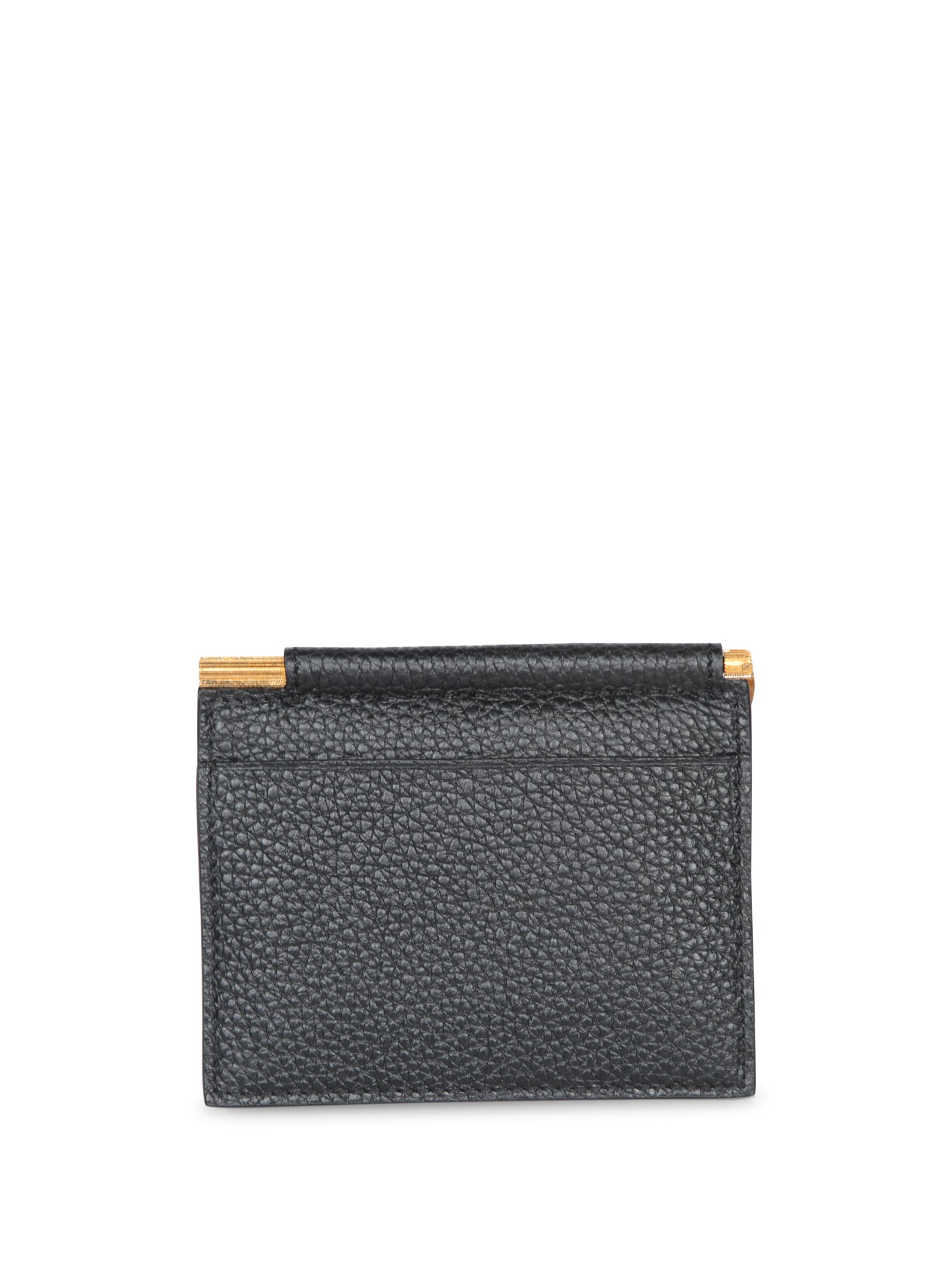 Black leather card holder with money clip. Golden frontal logo, metallic details.