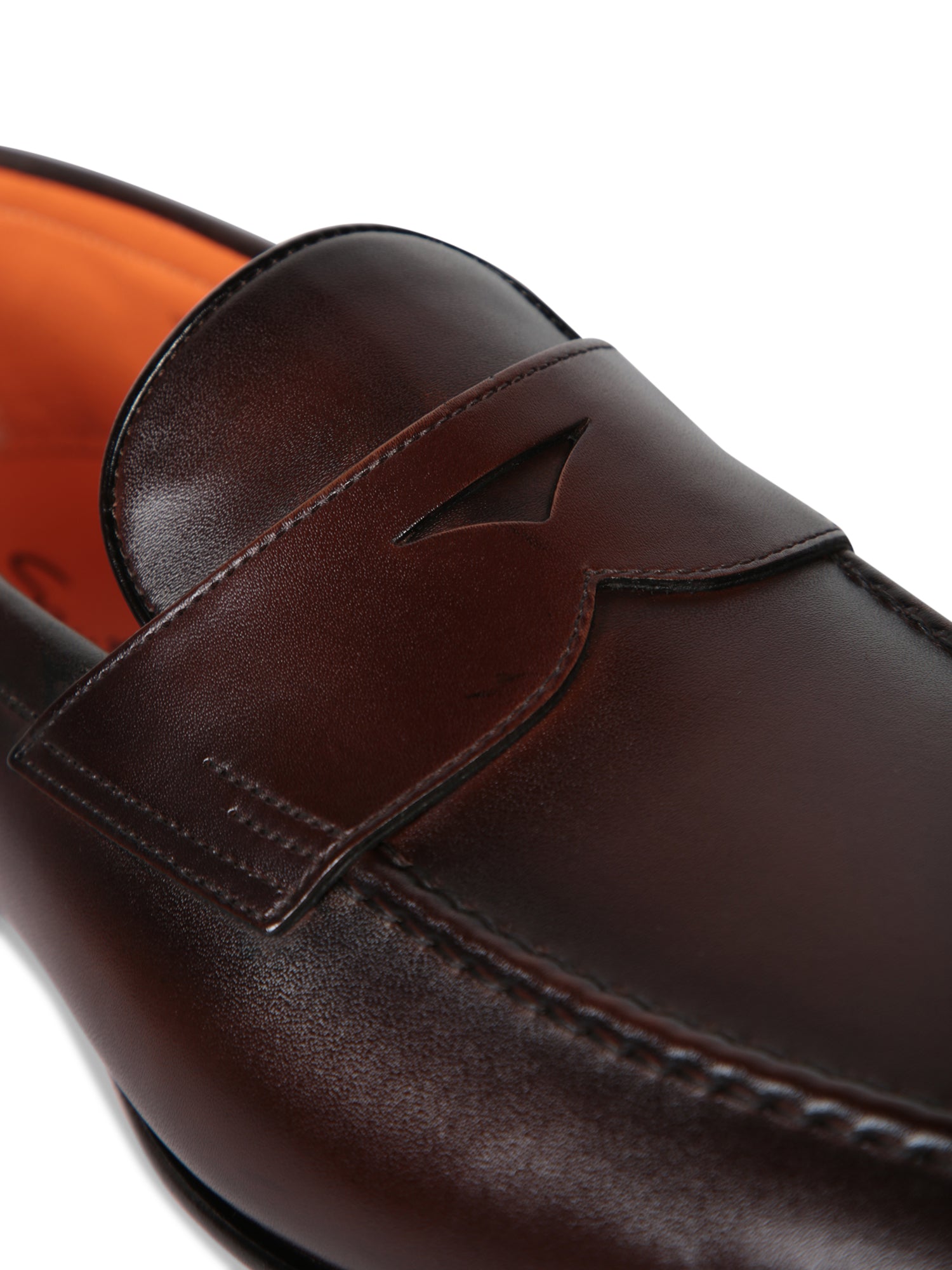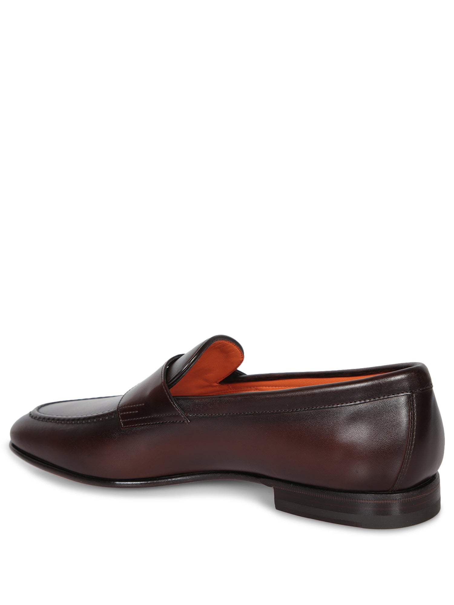 A modern take on a classic, the Santoni Sullivan Moccasin in high-quality dark brown leather features a clean silhouette with prominent stitching and a comfortable contrasting inner sole.