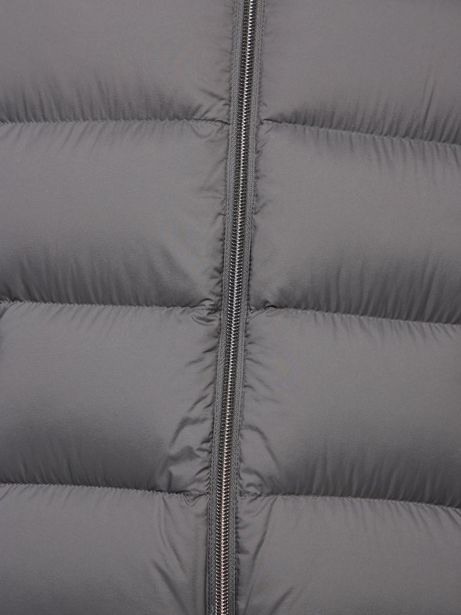 Down jacket with adjustable hood and zip closure. Side zip pockets. Elastic cuffs.