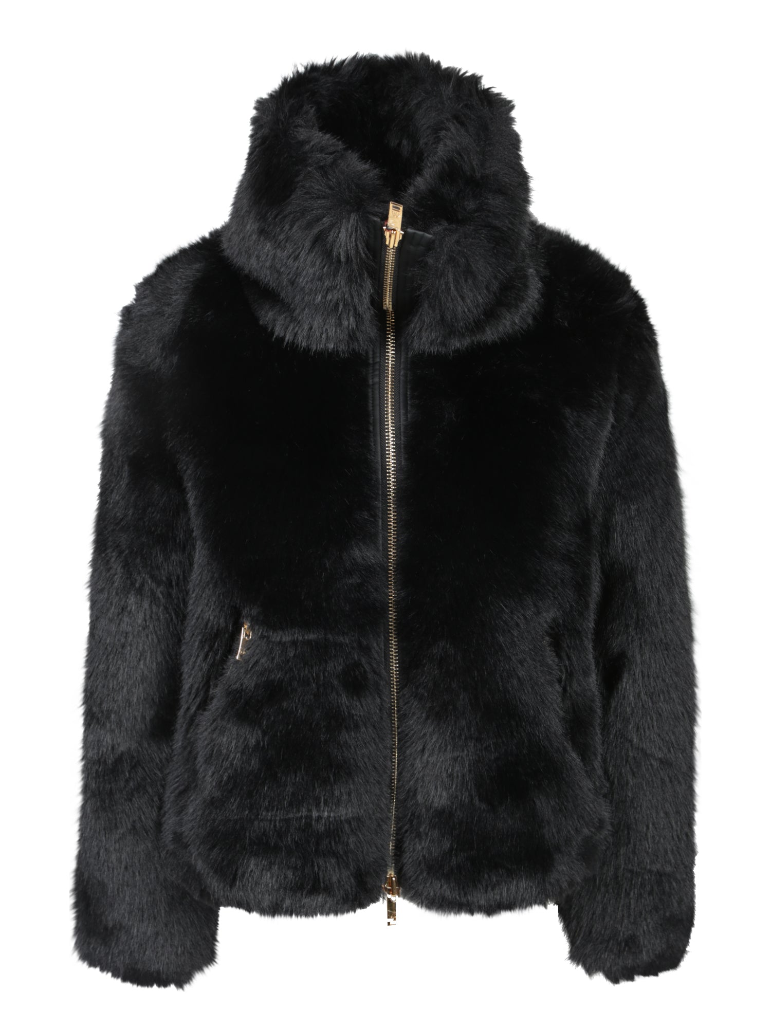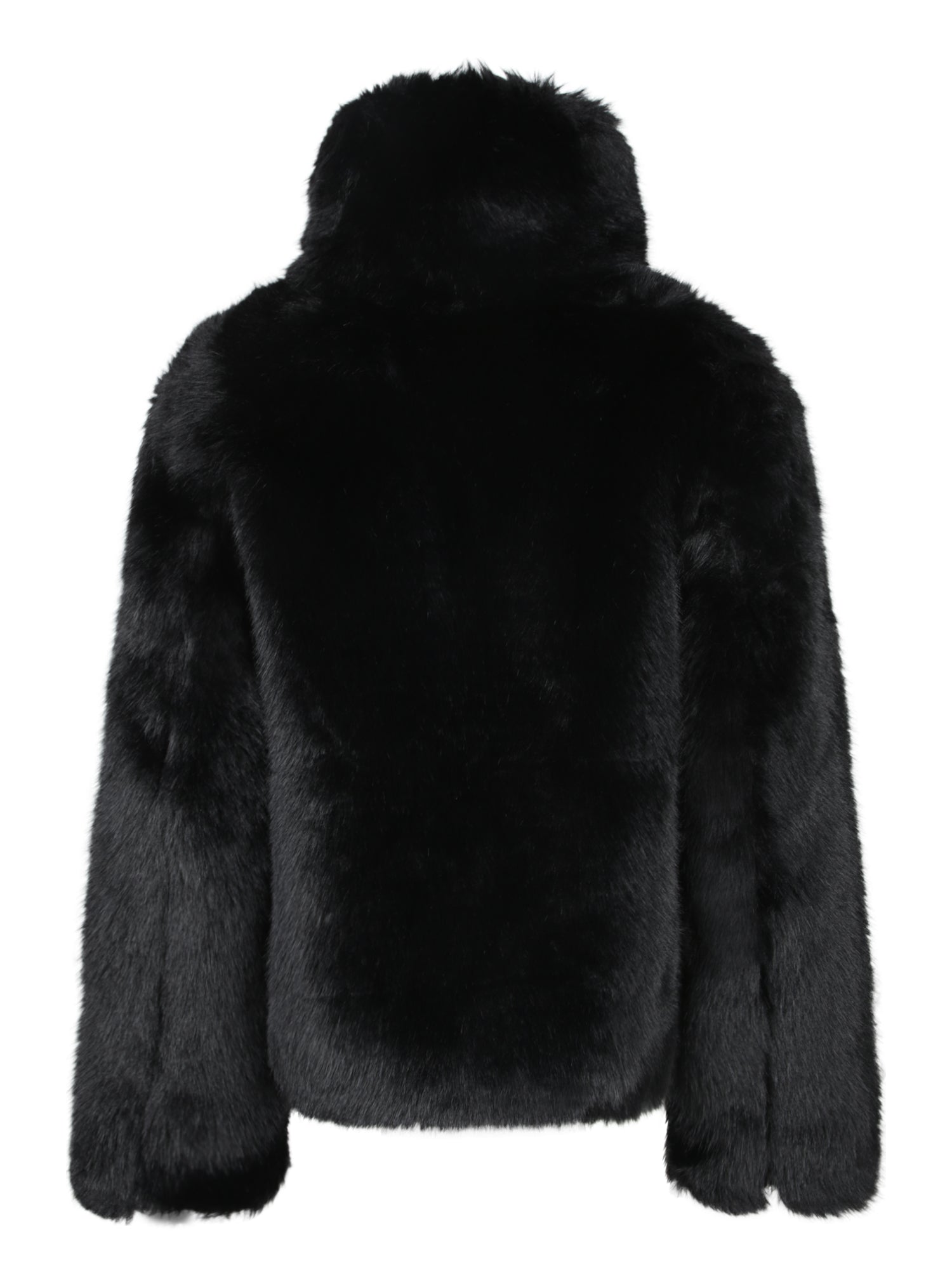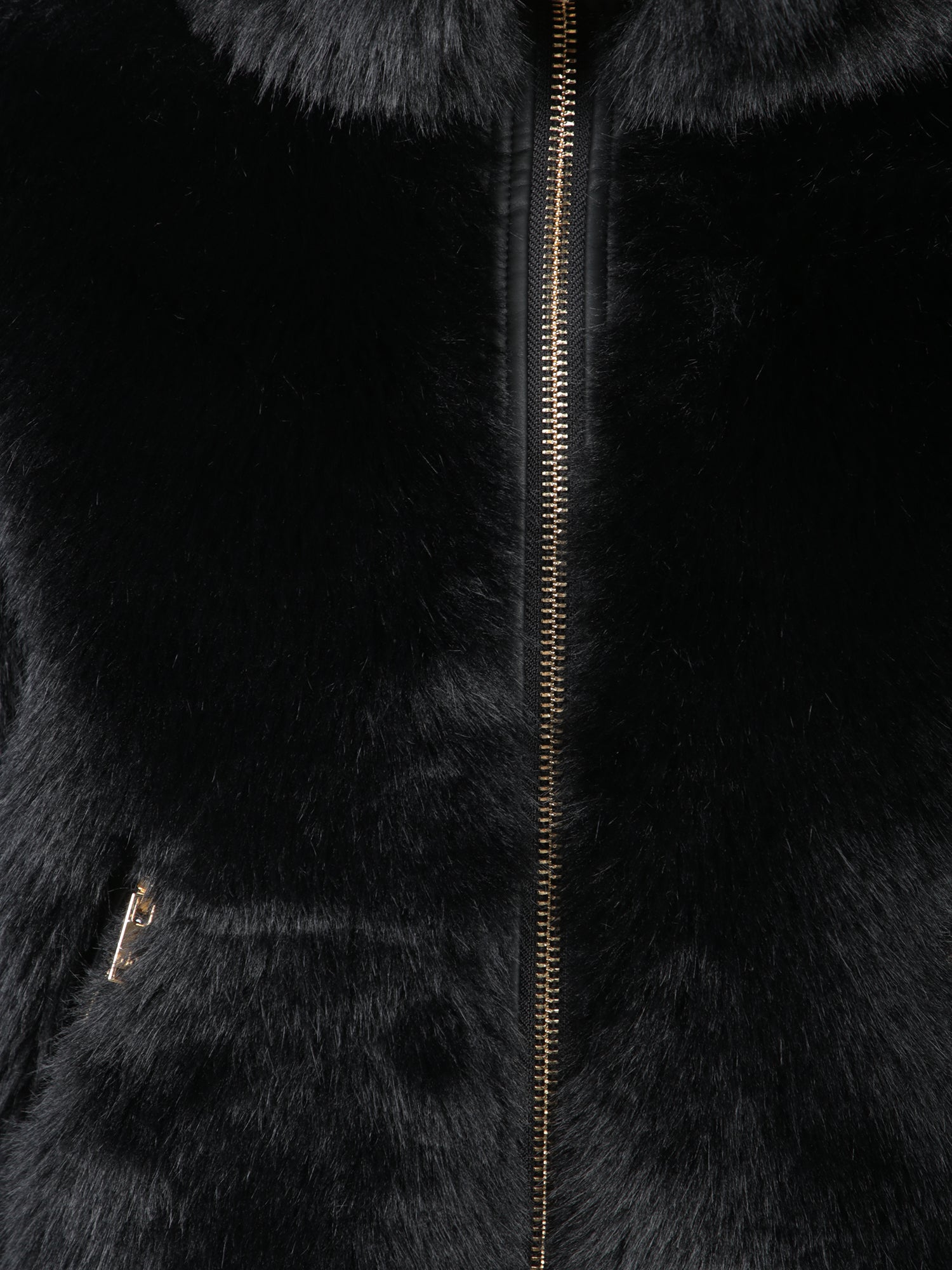 Faux fur jacket with front zip closure. High fur collar, long sleeves, side zip pockets.