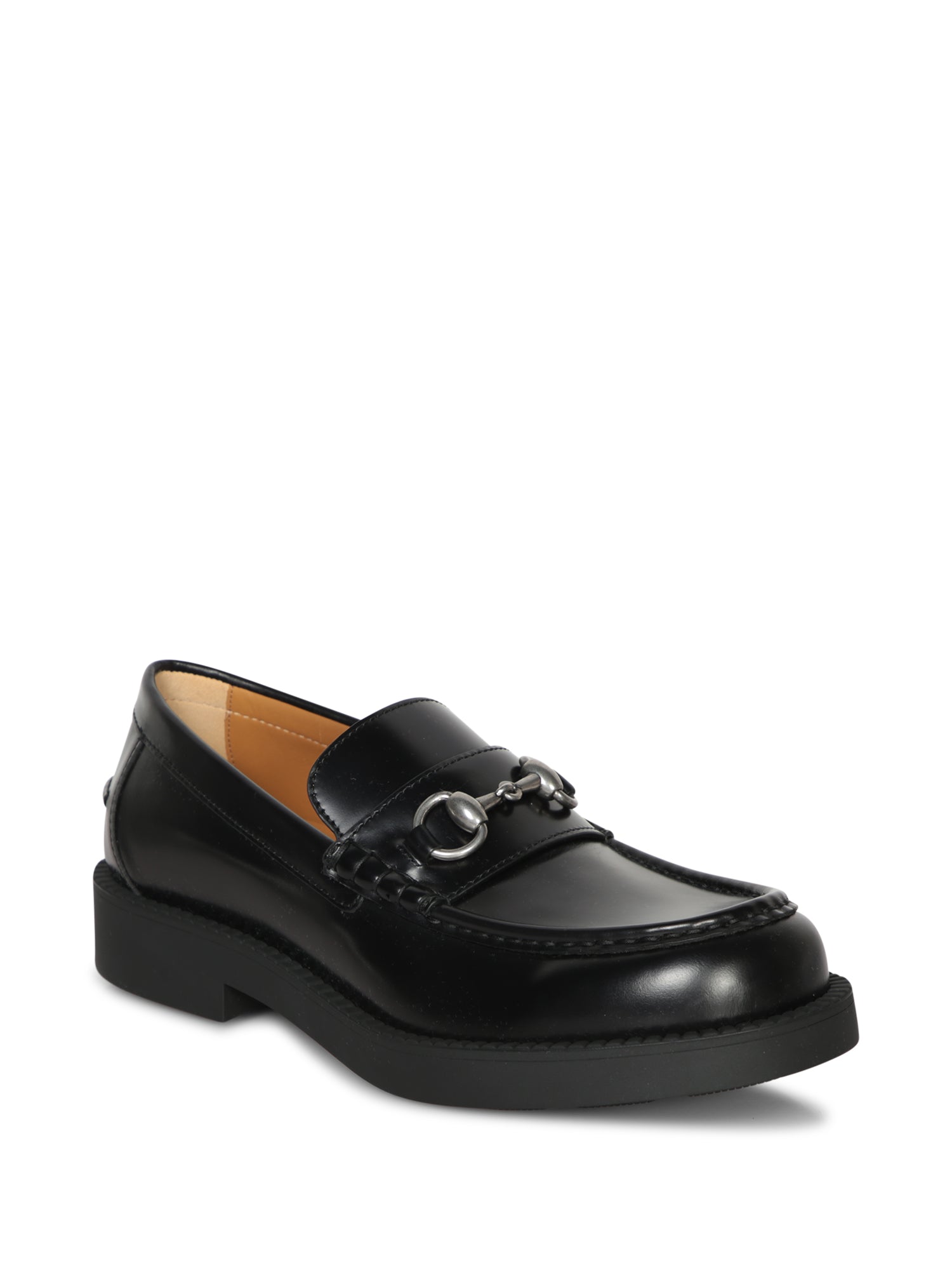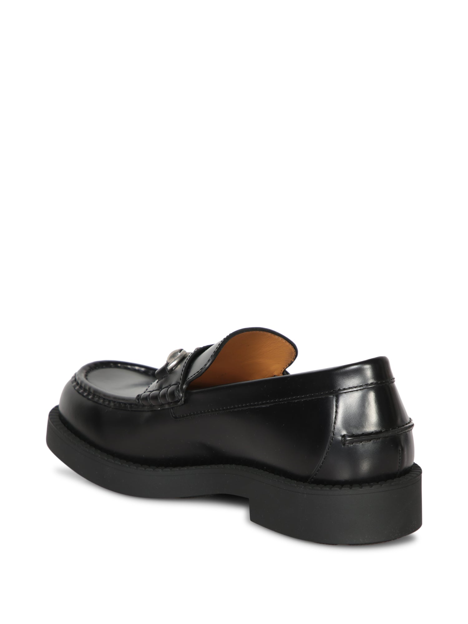 Smooth leather loafer featuring a shiny metal Horsebit detail. Thick rubber sole.