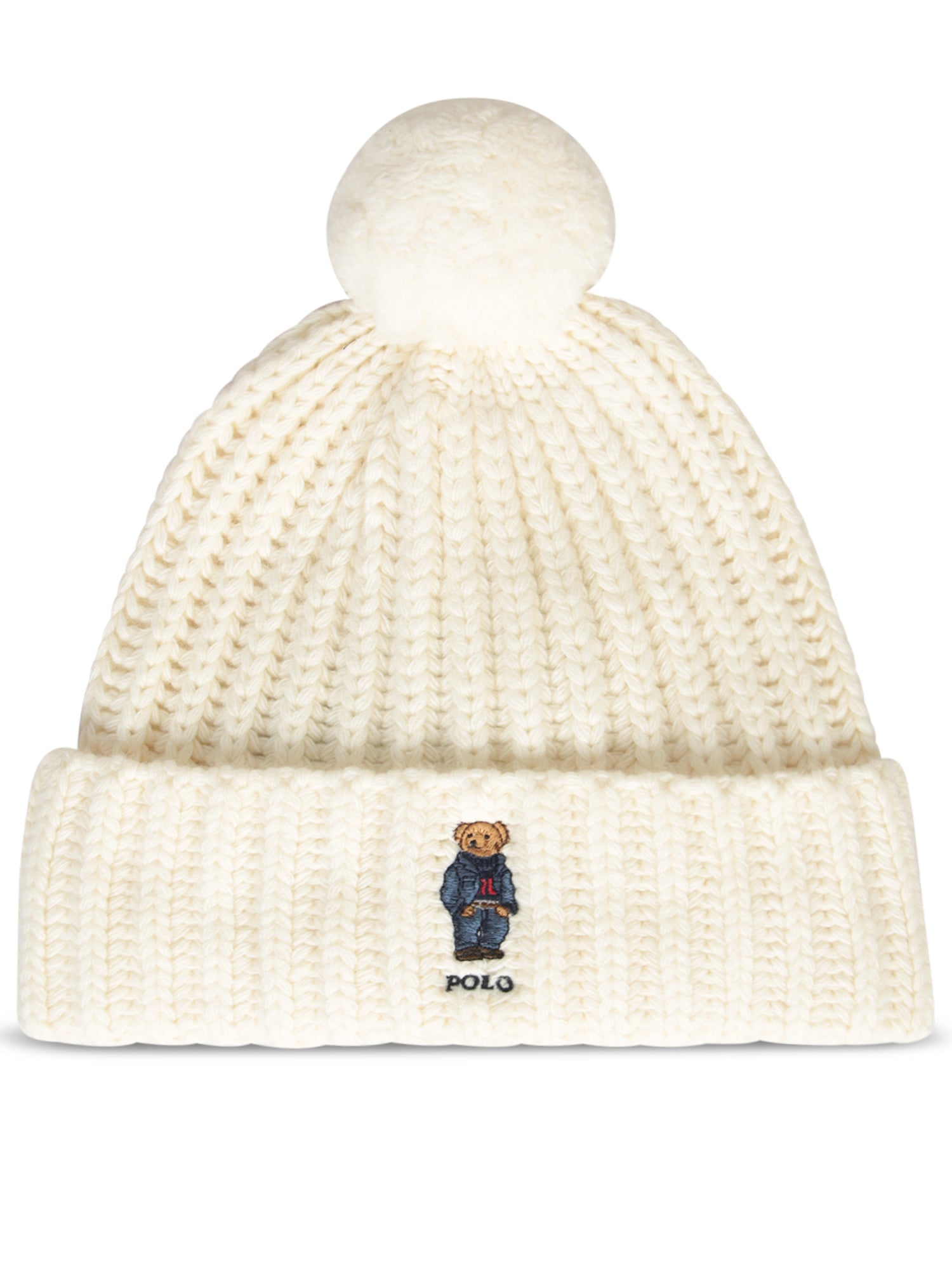 This stylish Polo Ralph Lauren beanie is crafted in soft cream knit featuring a distinctive Teddy Bear embroidery, adding a playful touch to the classic winter accessory.