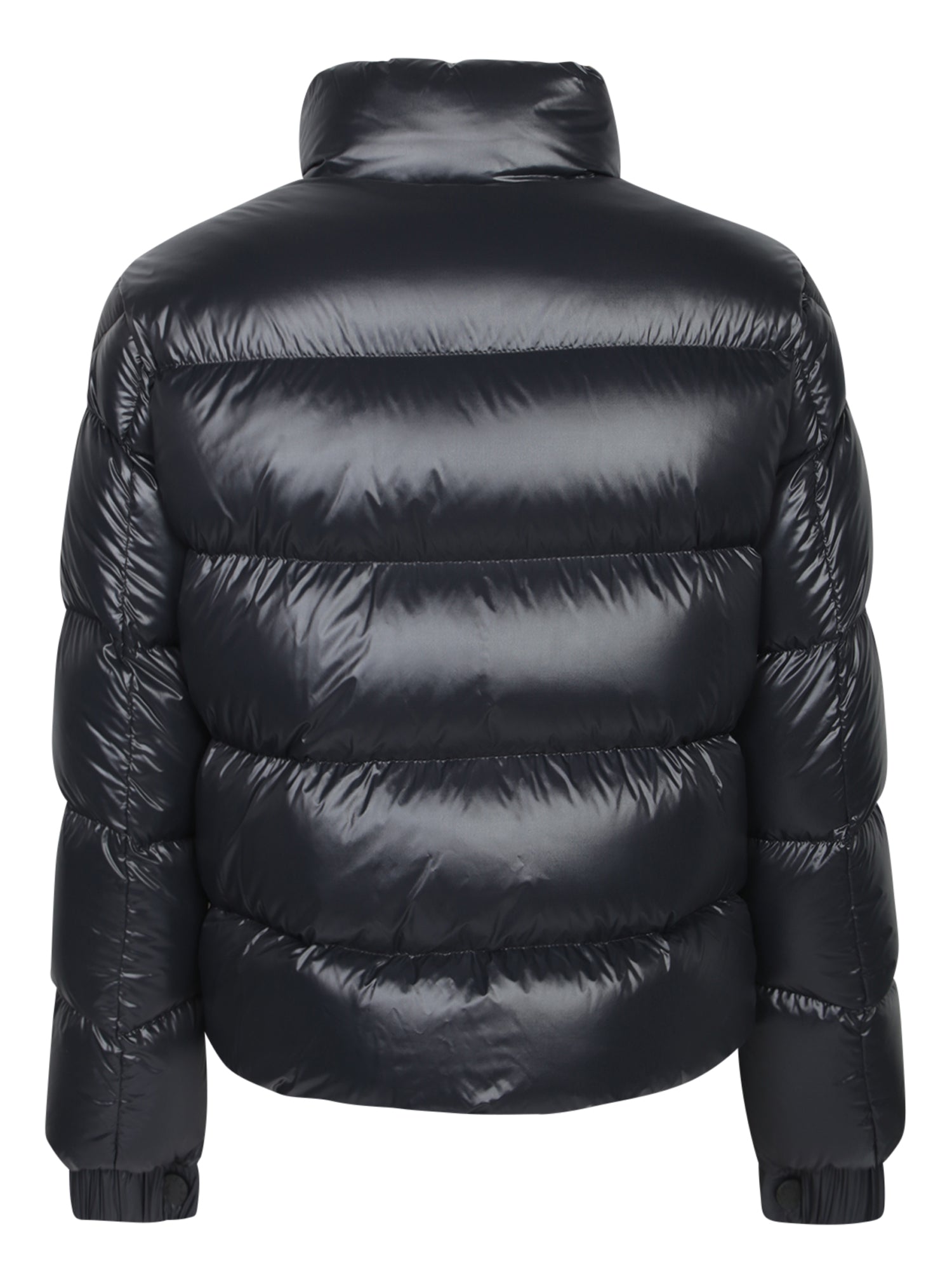 Padded down jacket, front button closure, high collar, long sleeves with elasticated cuffs.