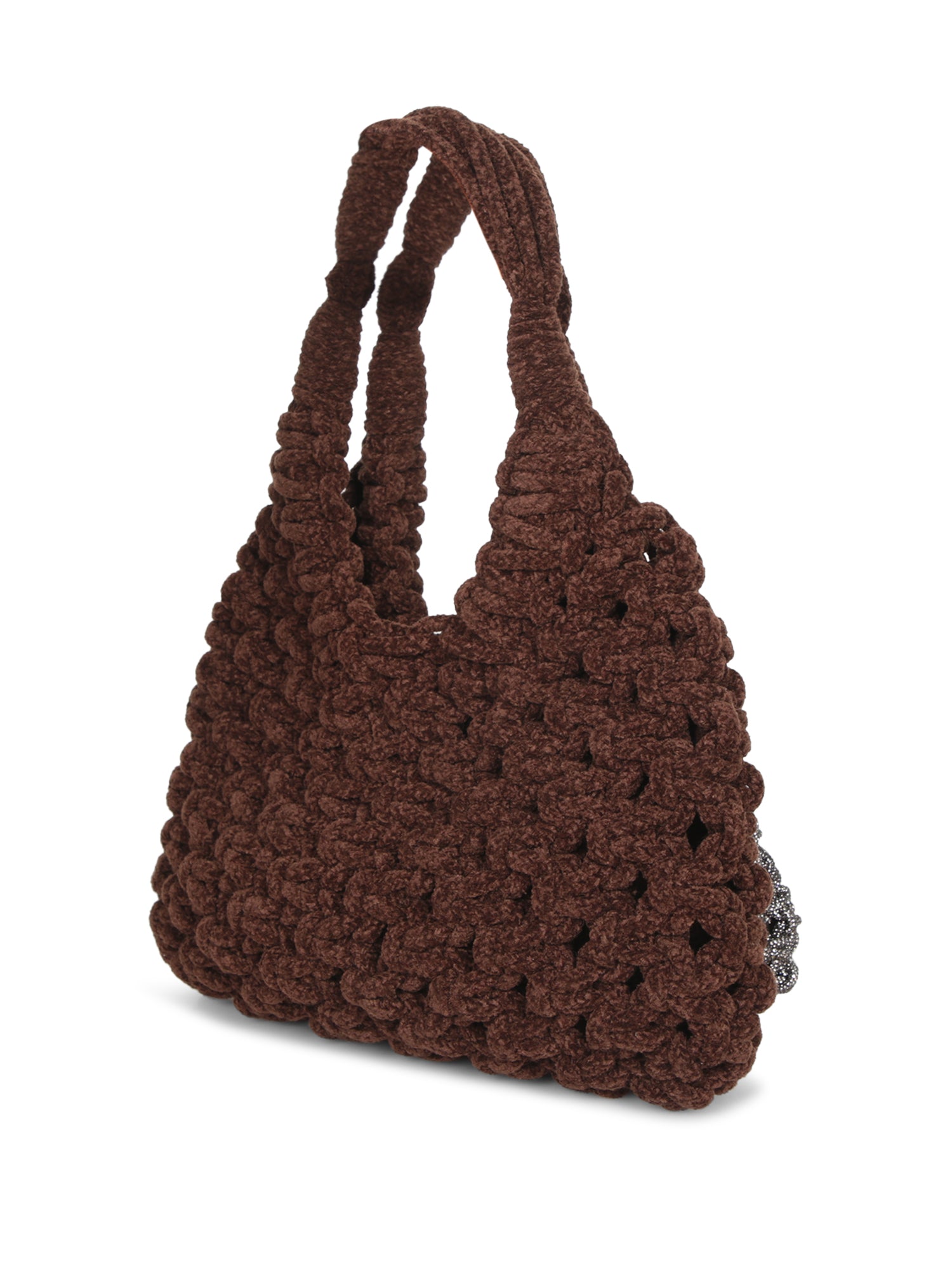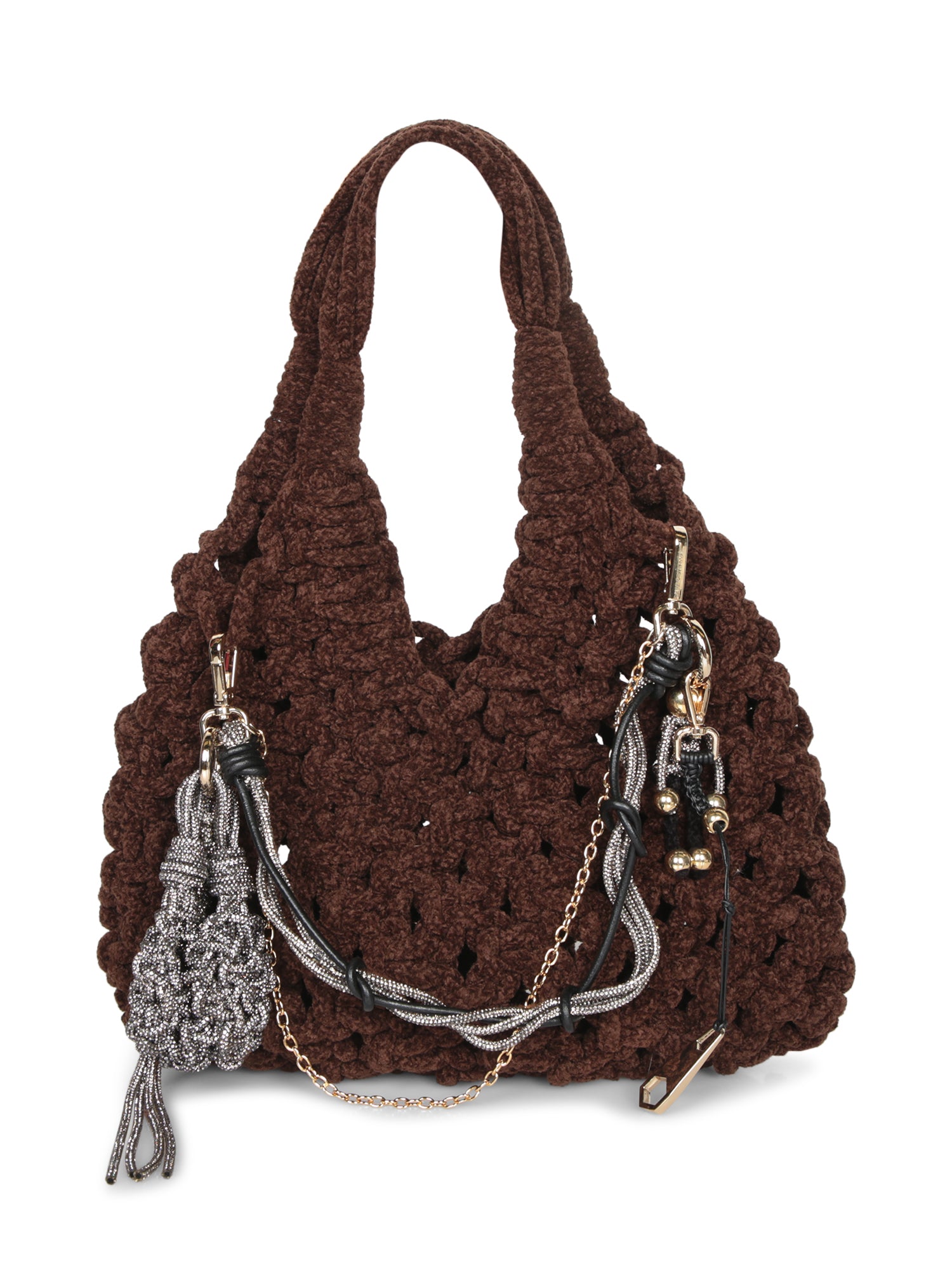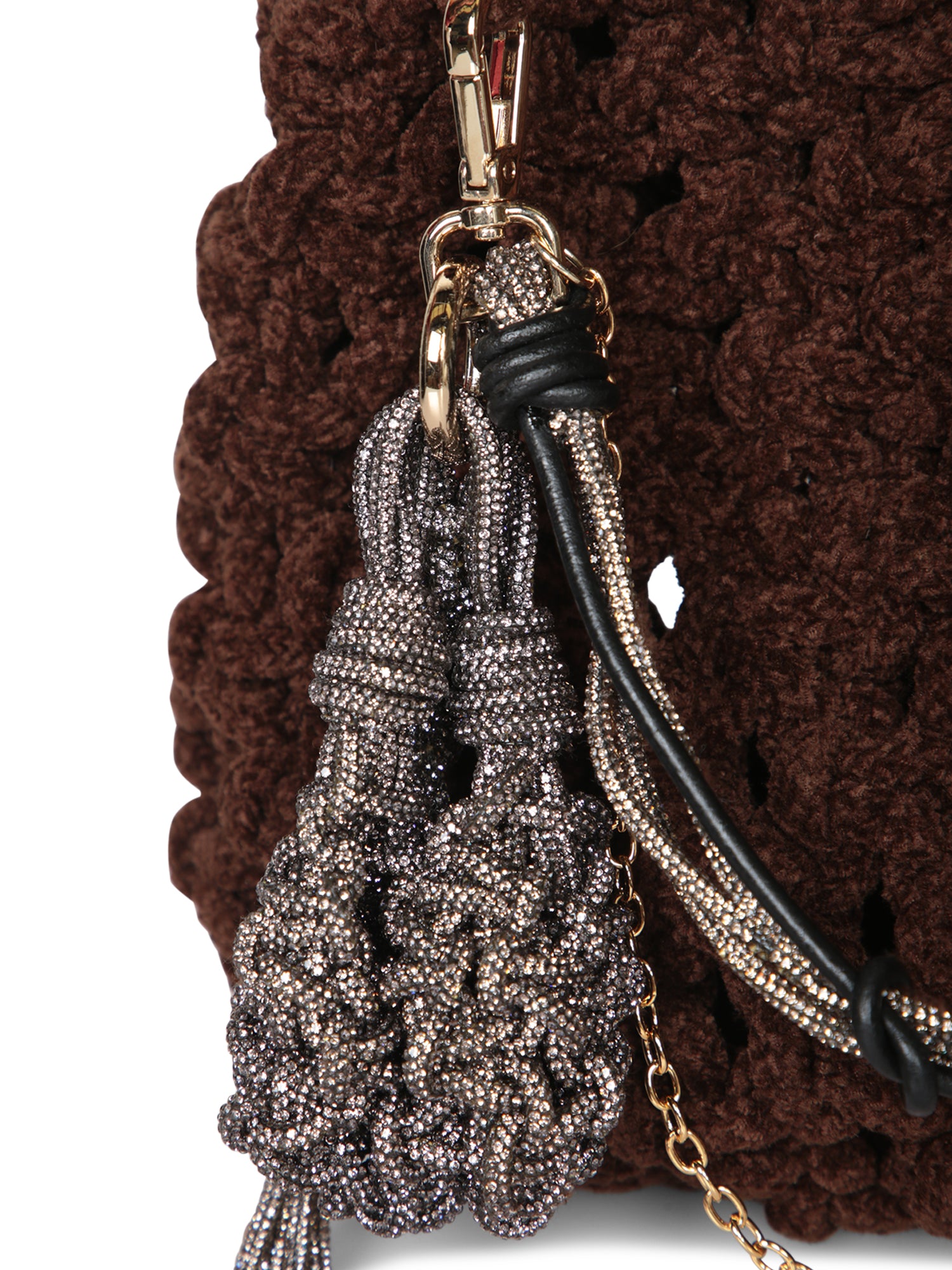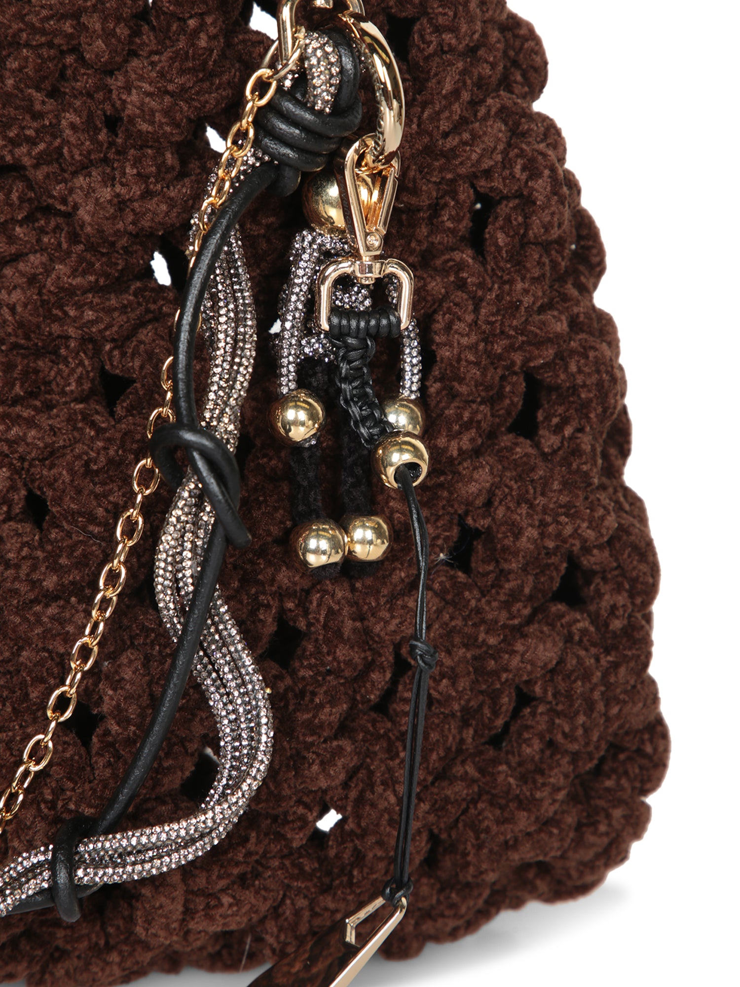 Brown velvet bag. Silver and gold charm details. Adjustable and removable strap.