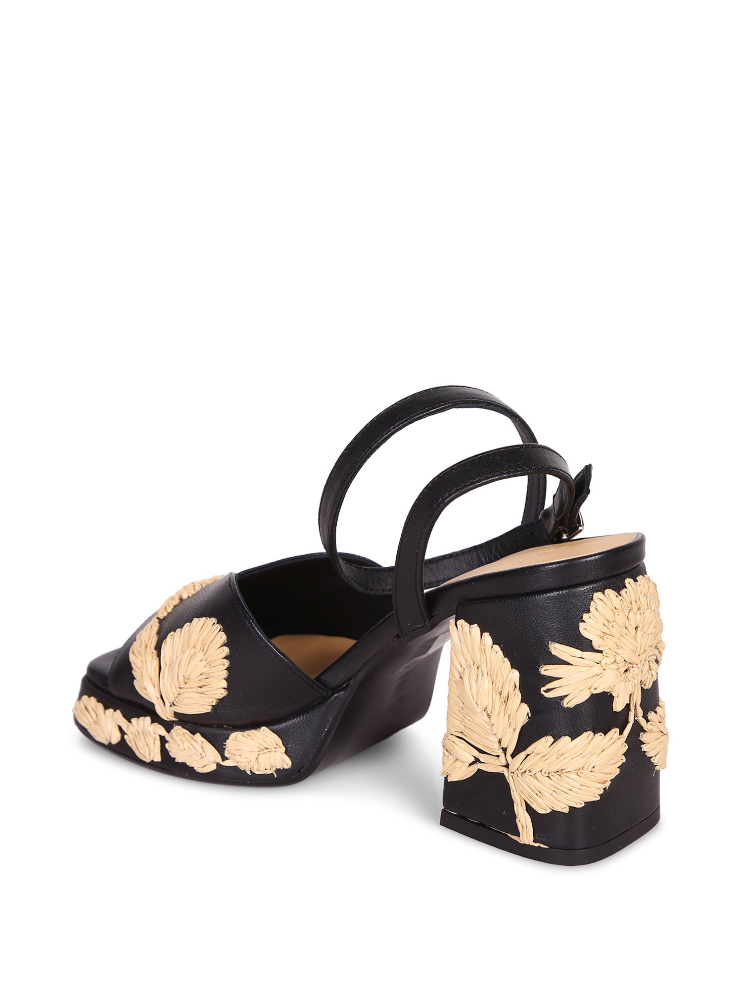 Raffia intricately embroidered on black leather. Thick heel. Adjustable ankle strap.