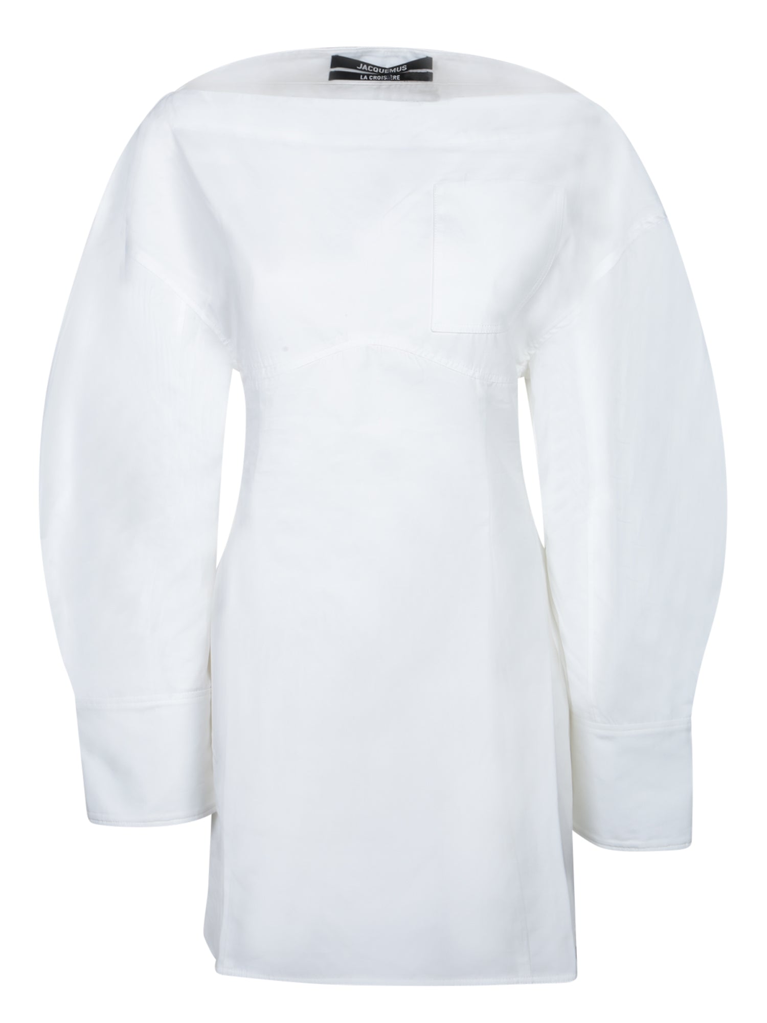 A masterpiece of simplicity and style, this Jacquemus dress stands out with its refined oversized cut, balloon sleeves that add a touch of originality, and the chest pocket that blends functionality with minimalist charm.