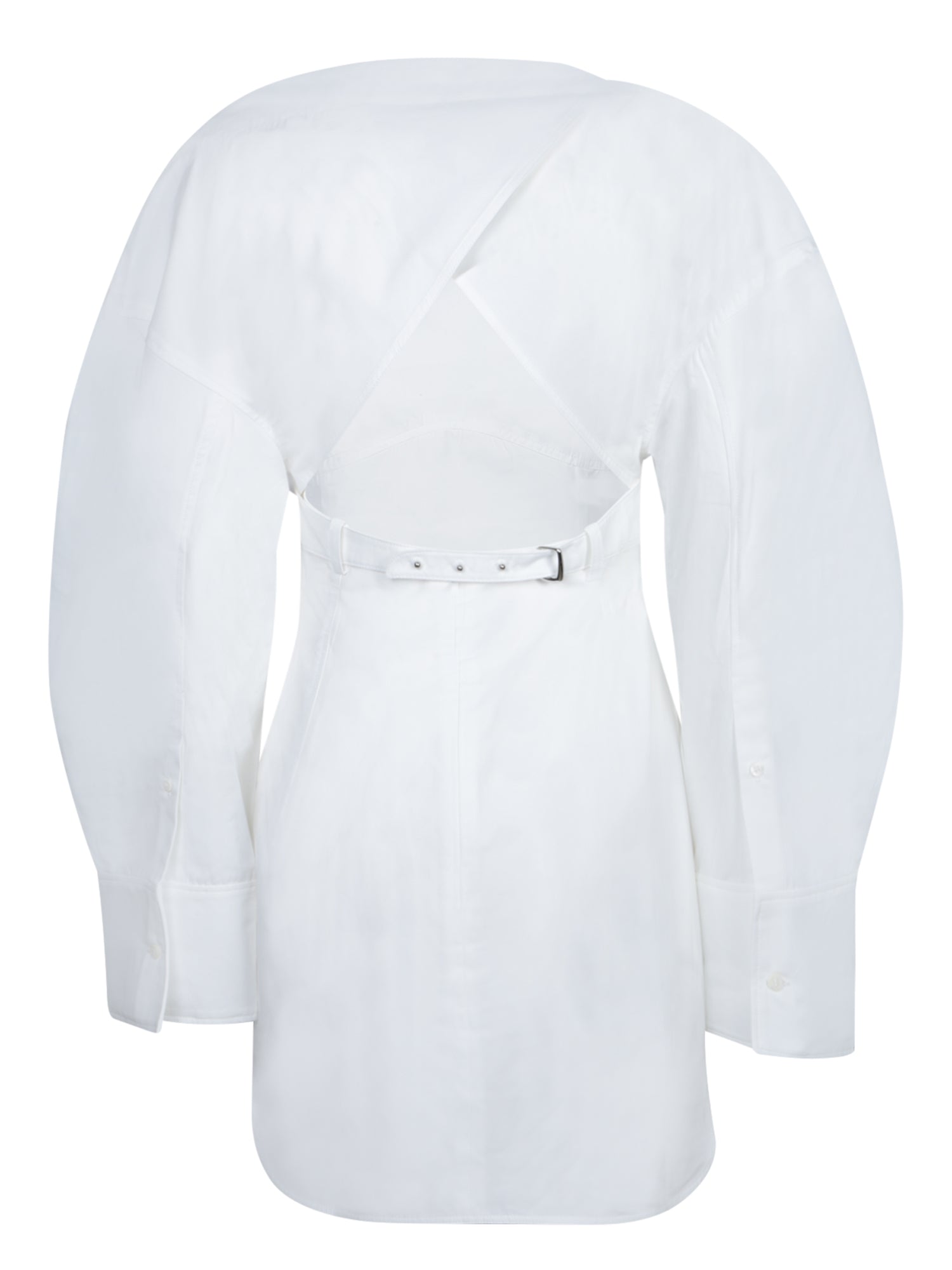 Oversized white cotton dress. Balloon sleeves with elasticated cuffs. Patch pocket on the chest.