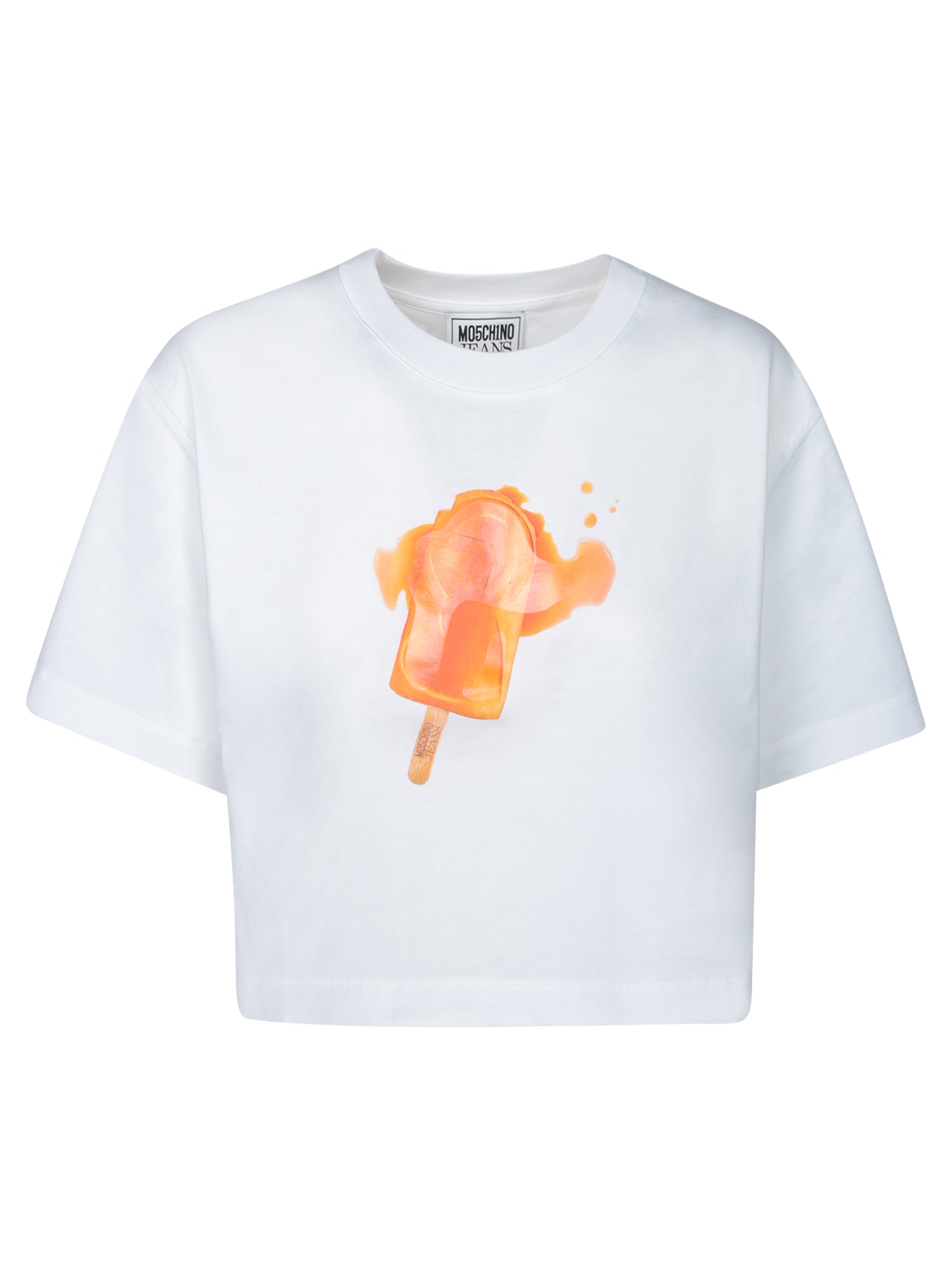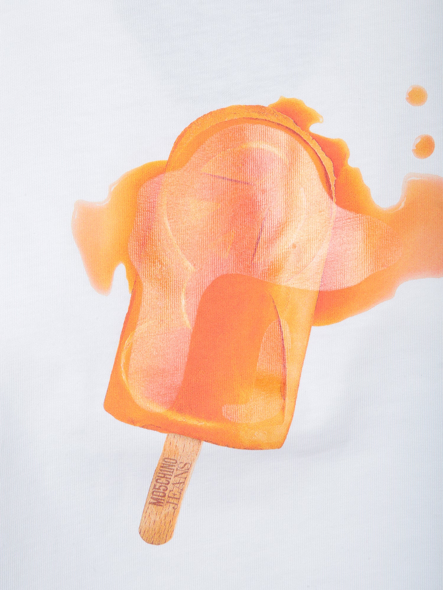 This lively Moschino Jeans crop t-shirt, featuring an eye-catching ice cream print, is perfect for a playful summer look. Made from soft cotton, it provides all-day comfort and style.