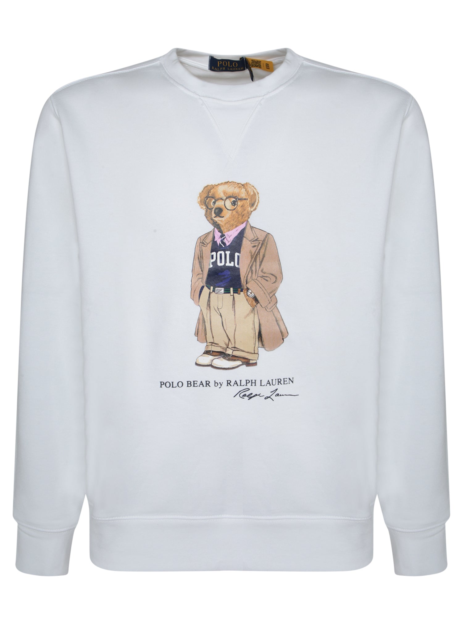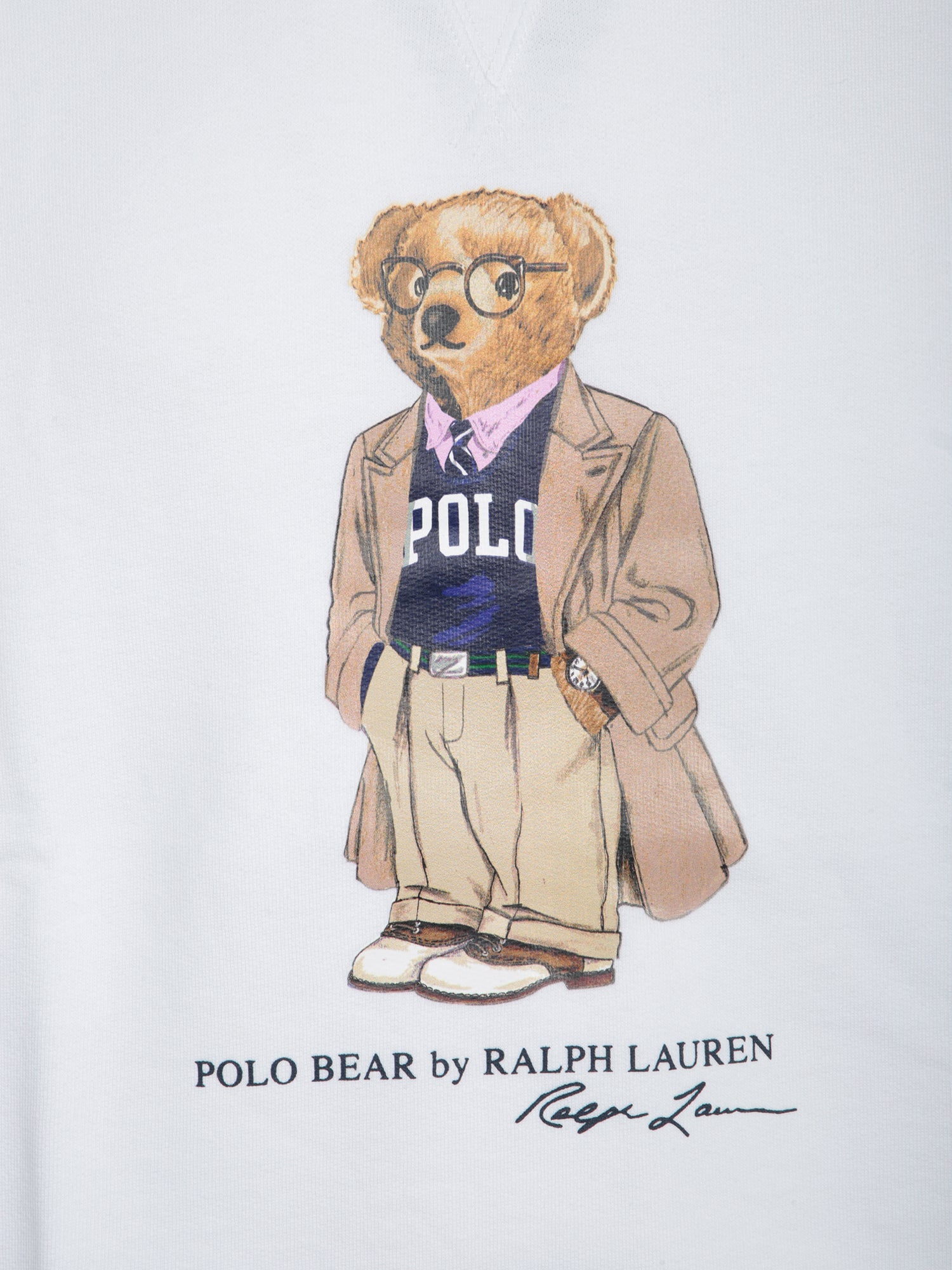 Long sleeve solid color sweatshirt with a raised V-neck. Features a front print of Ralph Lauren's Polo Bear.