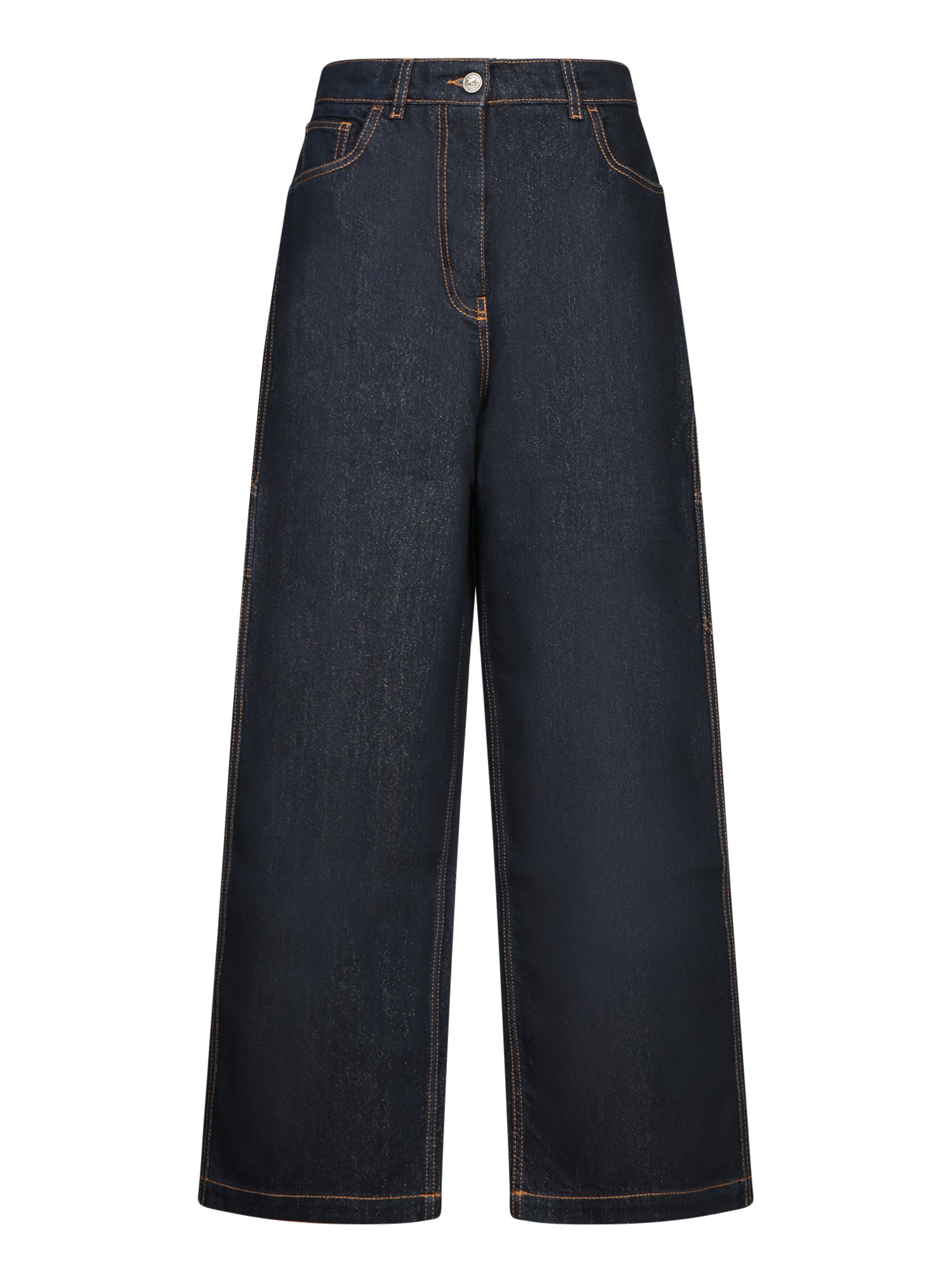 Etro's wide jeans reinvent a classic with their shimmering blue lurex fabric. The cozy design and relaxed cut make them perfect for casual-chic pairings.