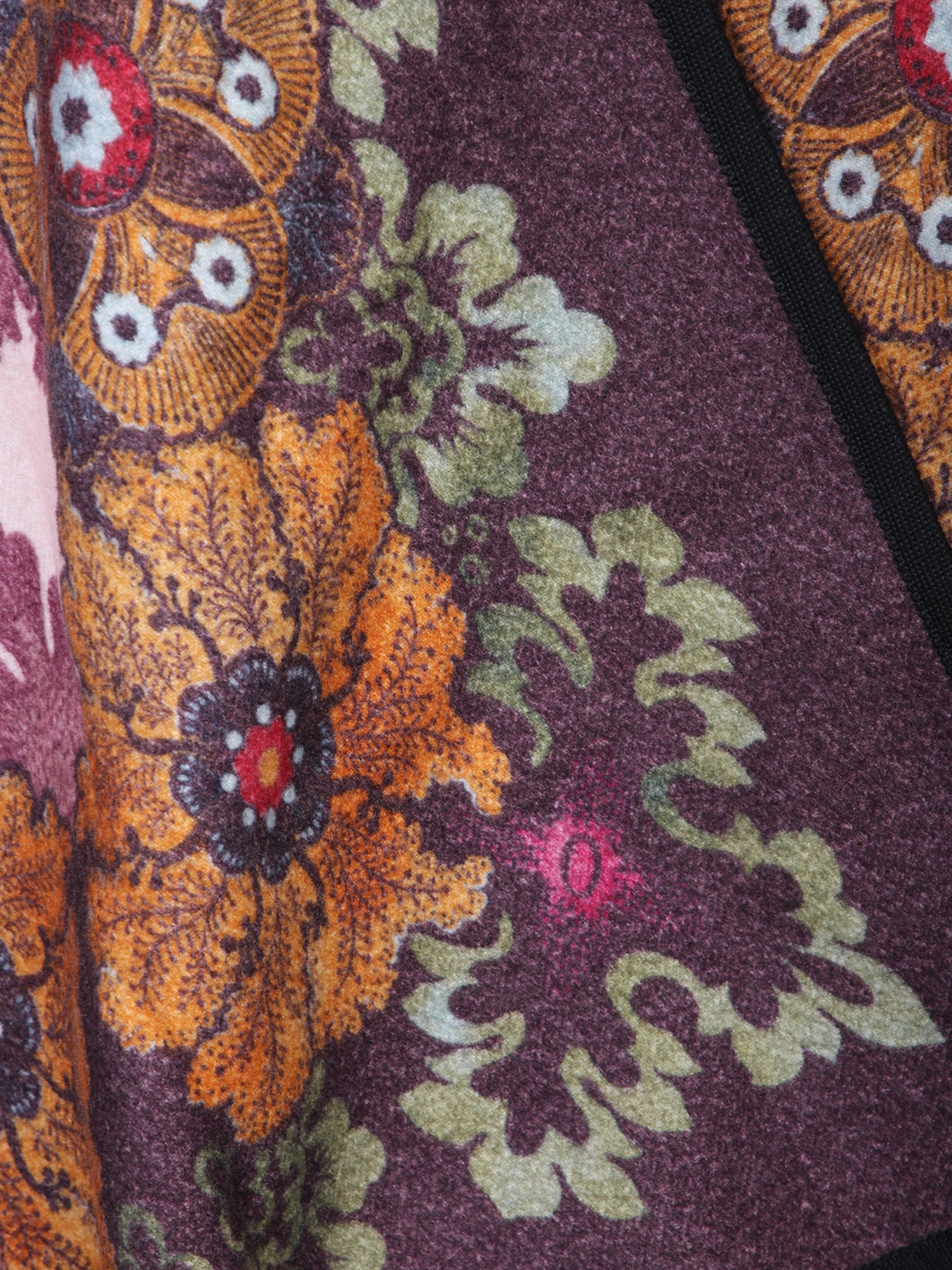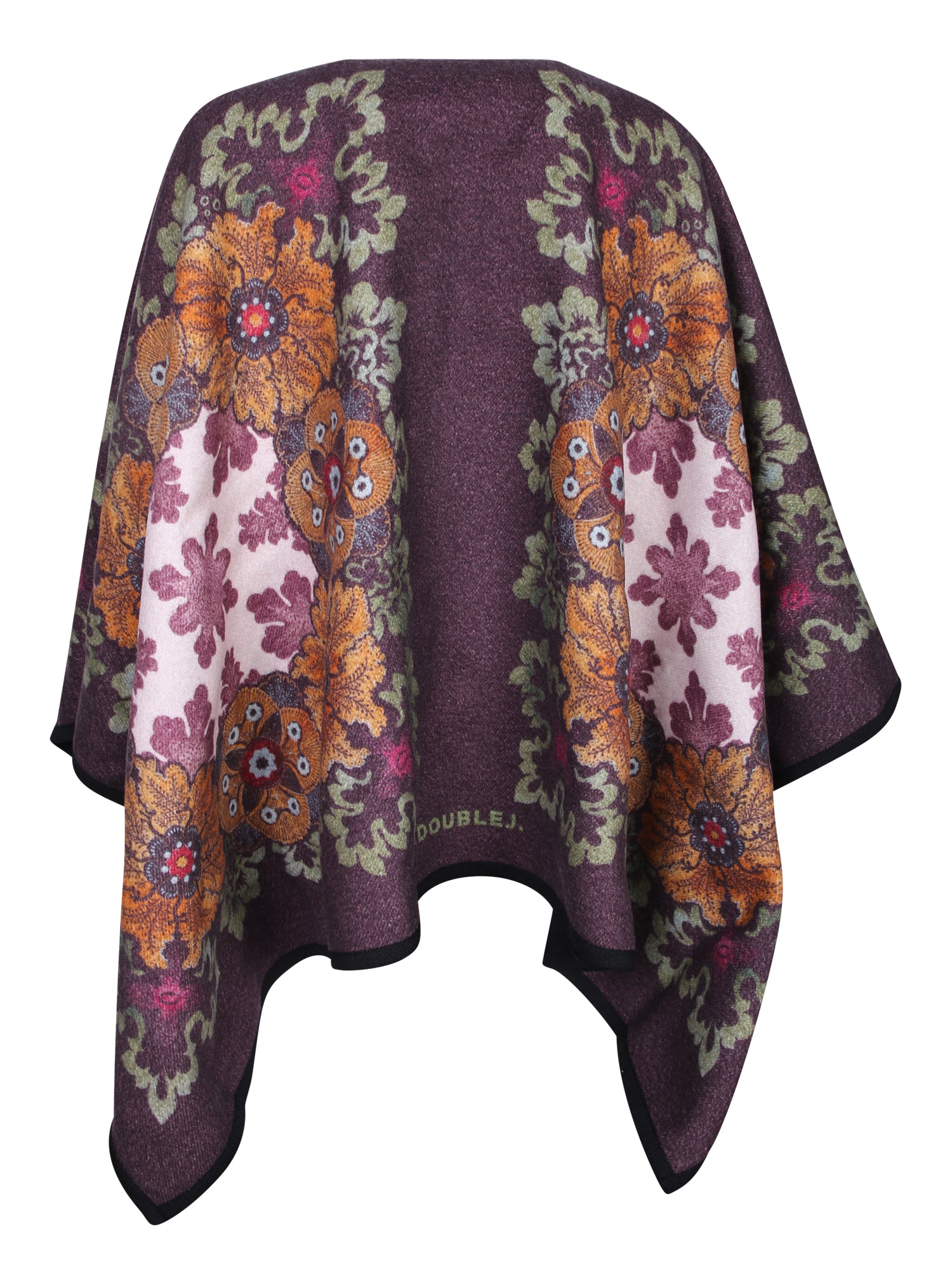 Wool poncho with multicolor floral print. Open front and asymmetrical edges.