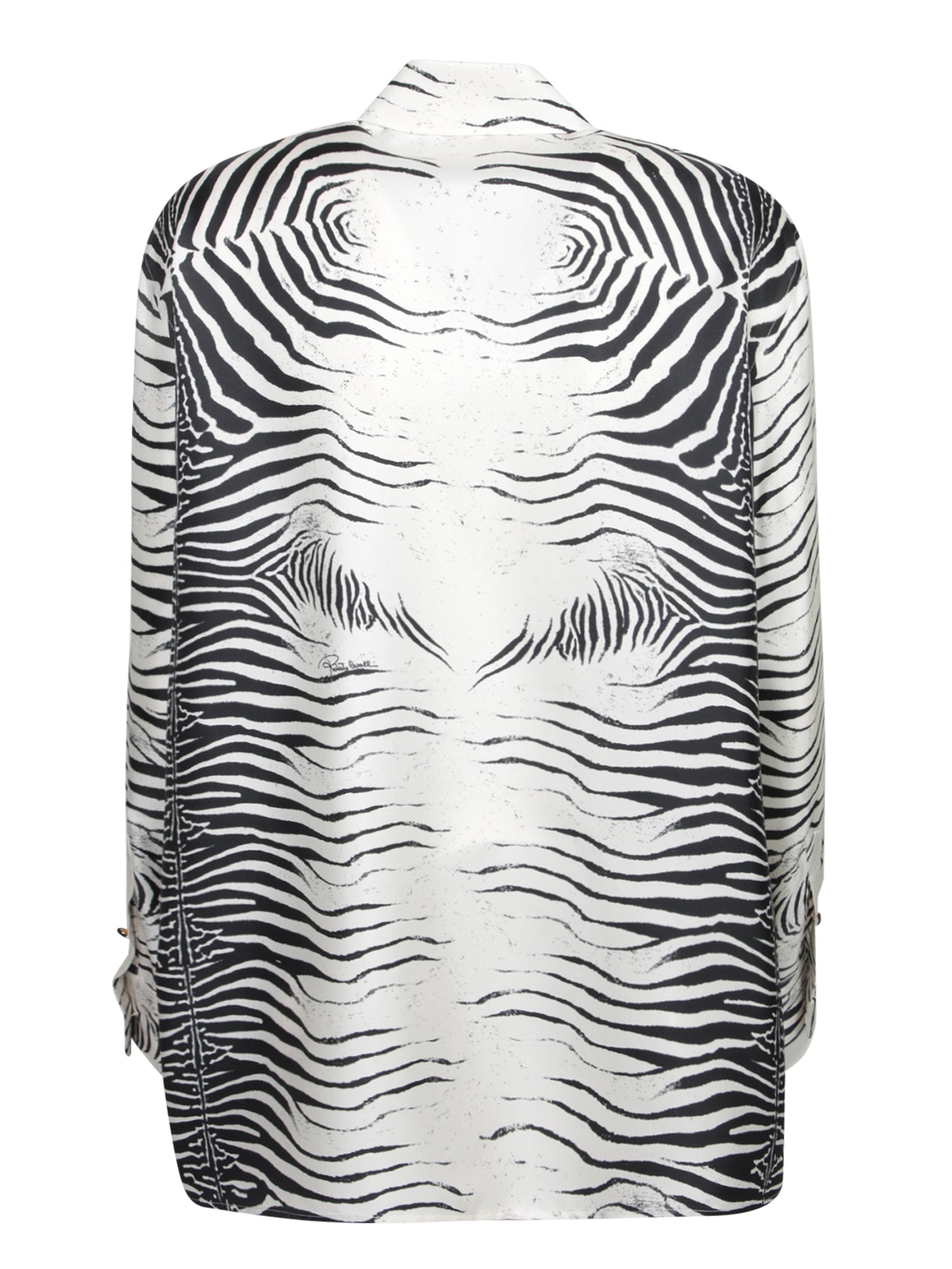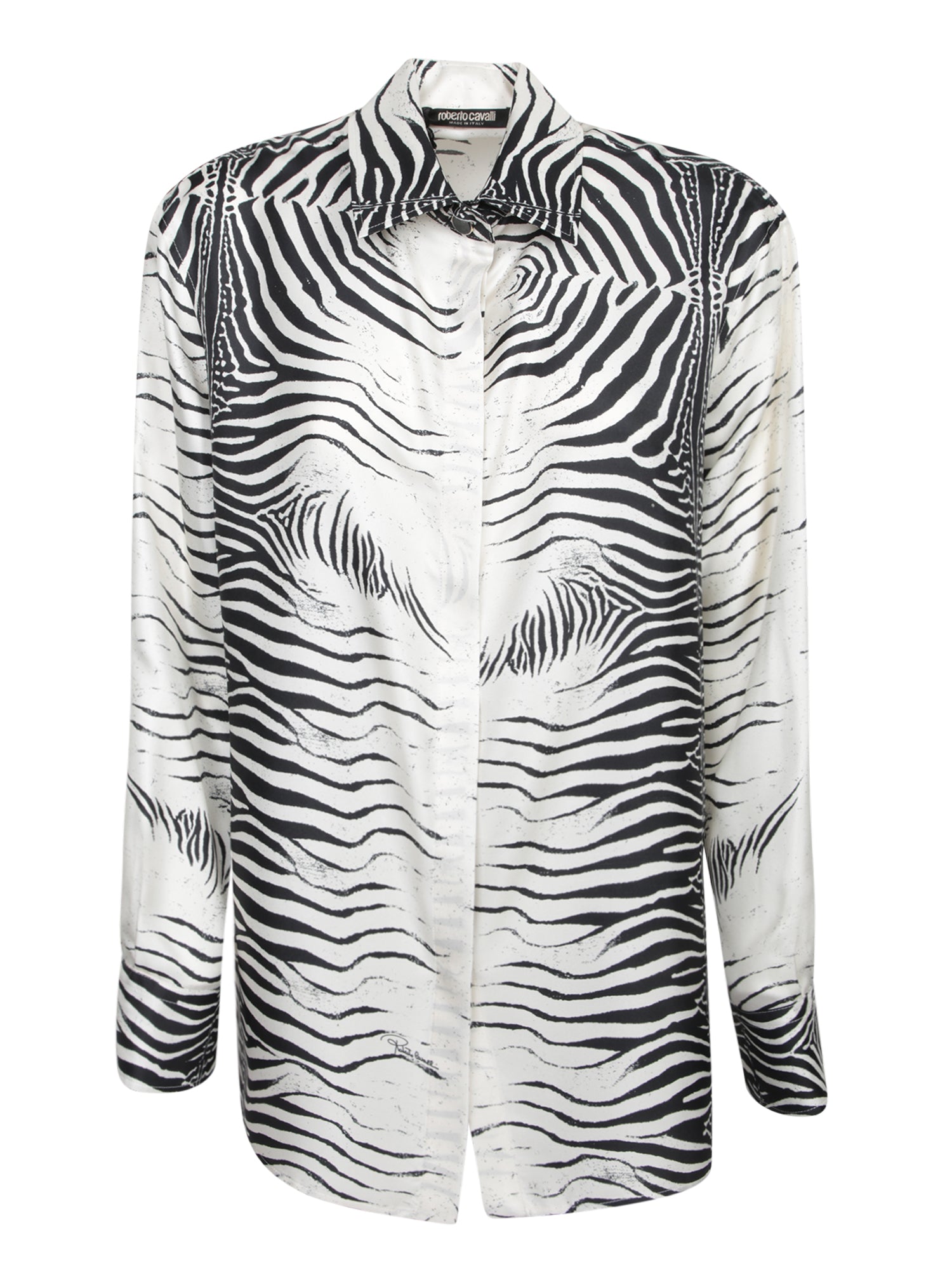 This elegant Roberto Cavalli shirt blends luxurious silk with a bold zebra motif, finished with a collar embellished with a delicate silver chain, making it ideal for a distinctive look.